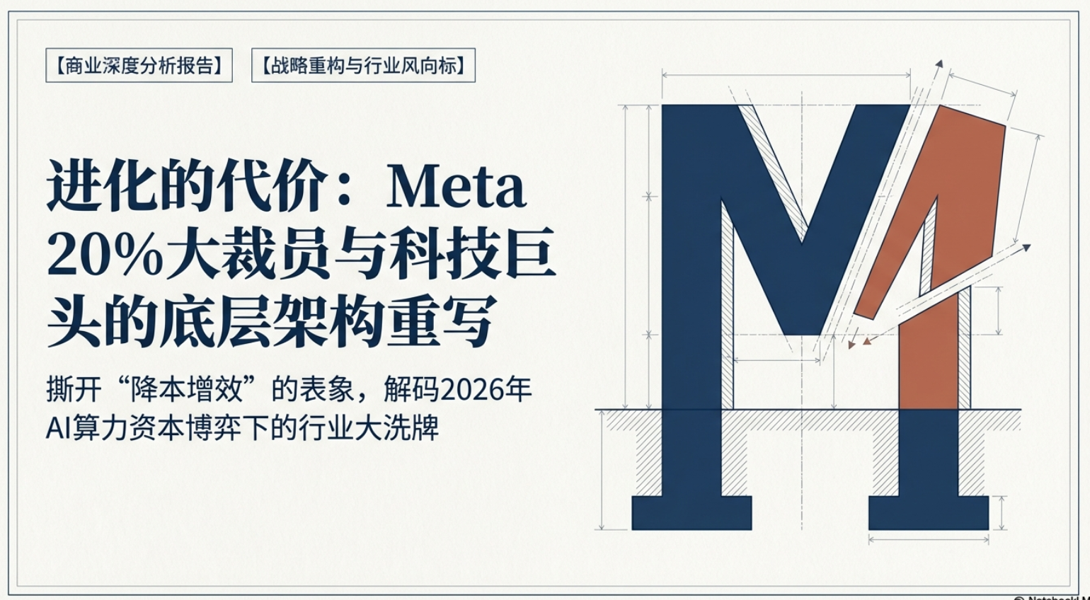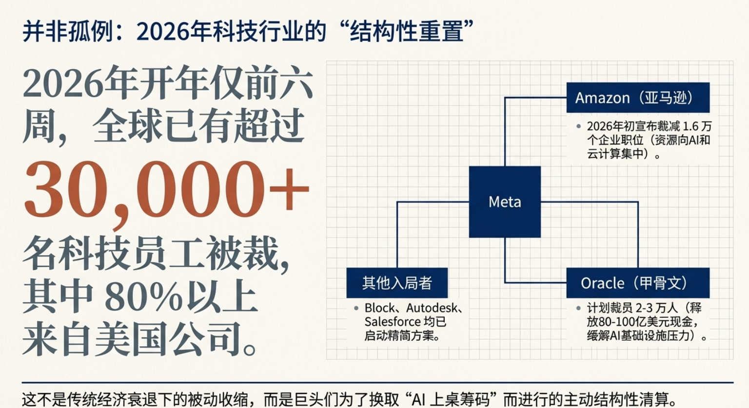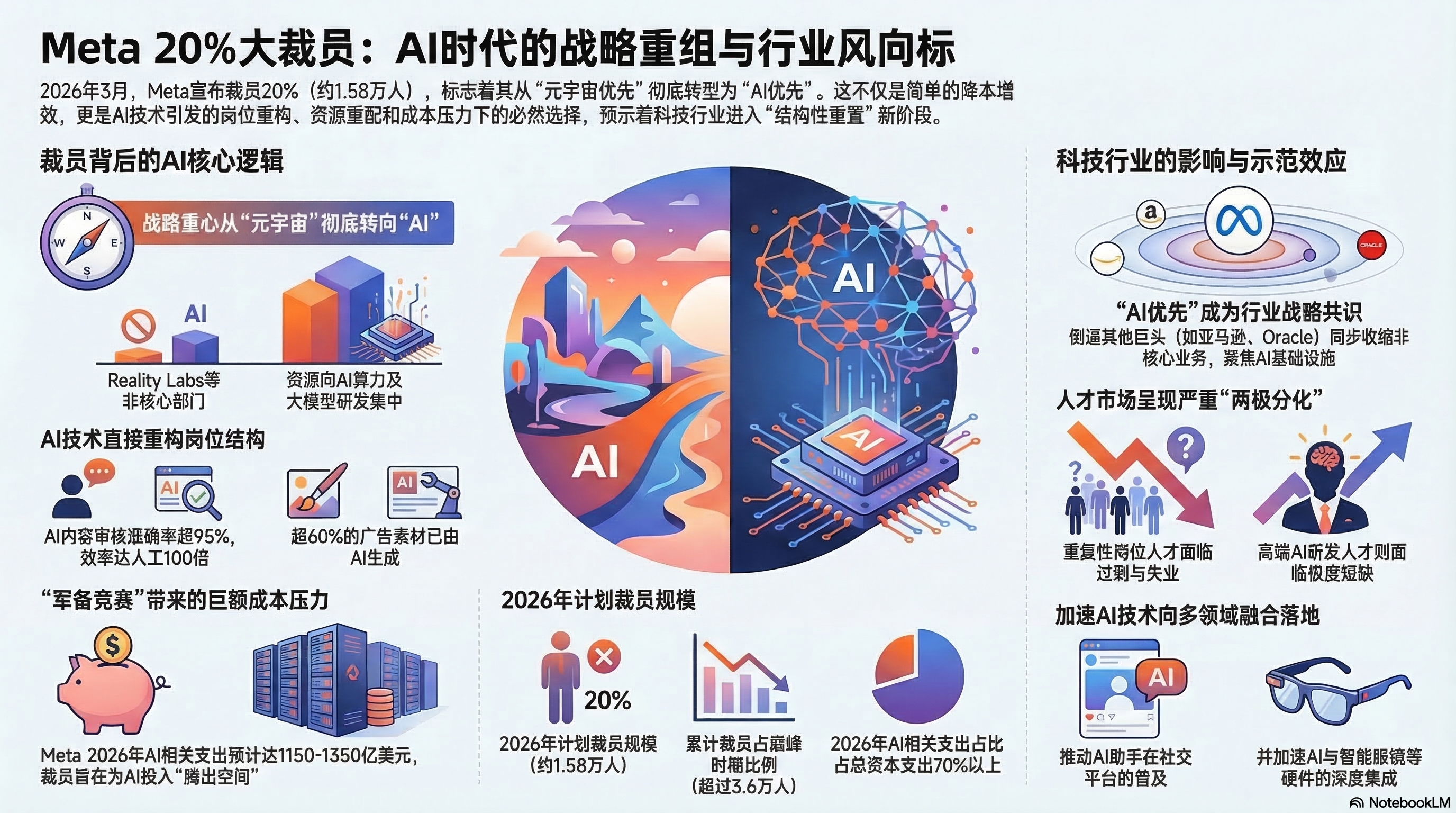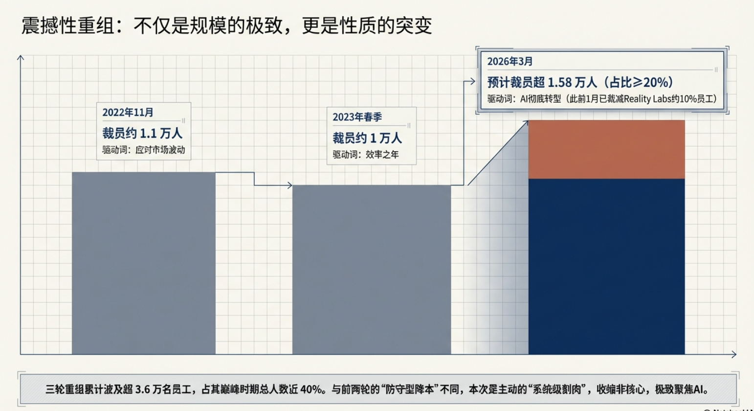 2026年3⽉,全球科技巨头Meta传出新⼀轮⼤规模裁员计划,引发全球科技圈⼴泛关注。据路透社、央视新闻等权威媒体援引知情⼈⼠消息,此次裁员预计⽐例达公司总⼈数的20%及以上,规模或将超1.58万人,是Meta⾃2022年底⾄2023年初“效率之年”重组以来规模最⼤的⼀次⼈员缩减。此前在2026年1⽉,Meta已裁减负责元宇宙业务的Reality Labs部⻔约10%的员⼯,⽽此次⼤规模裁员,被业内解读为公司战略重⼼彻底向AI倾斜的标志性动作。