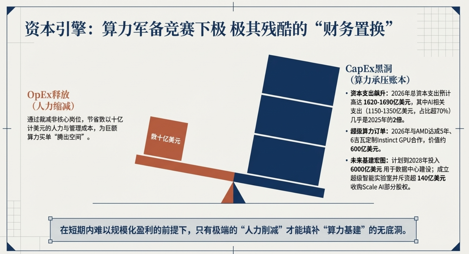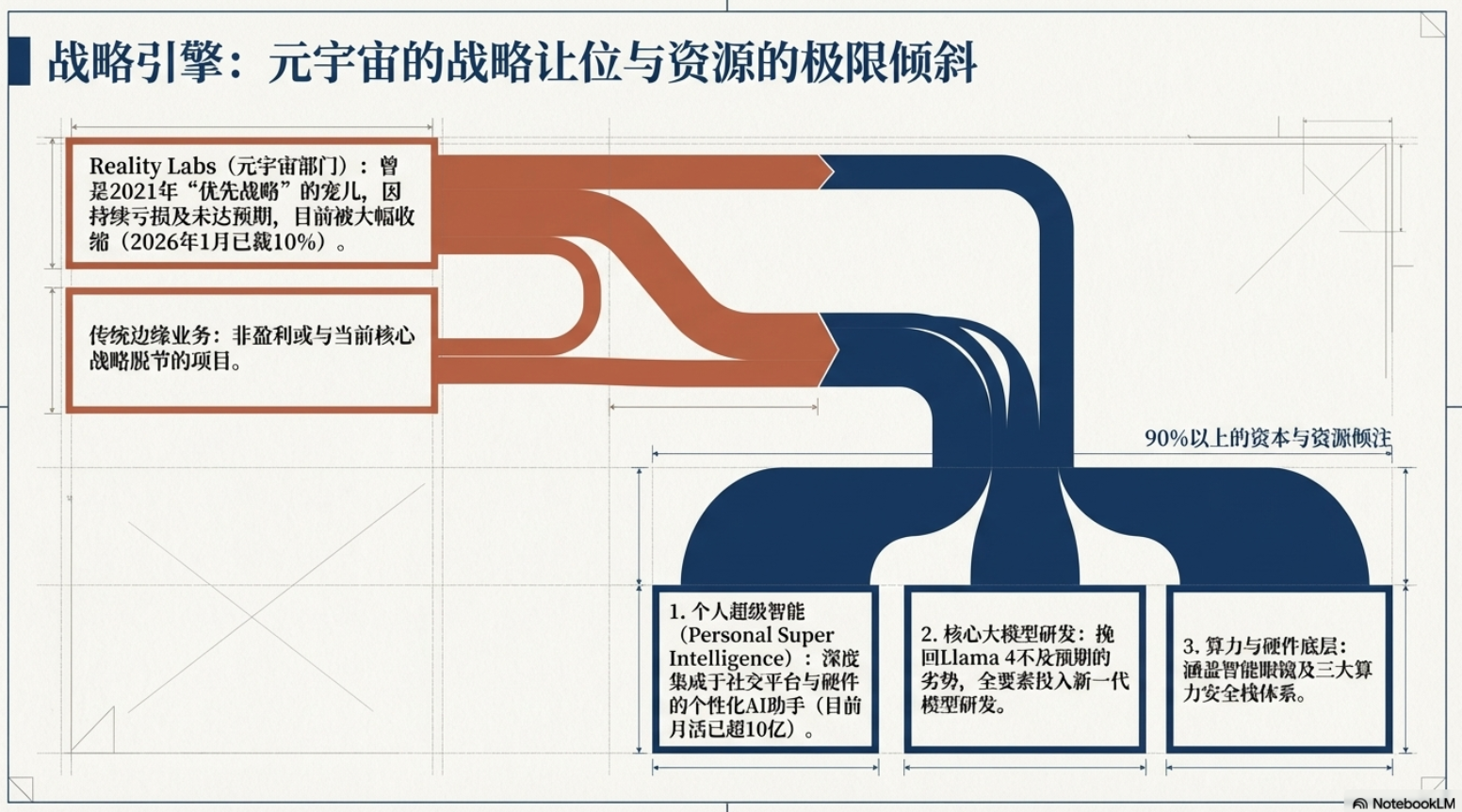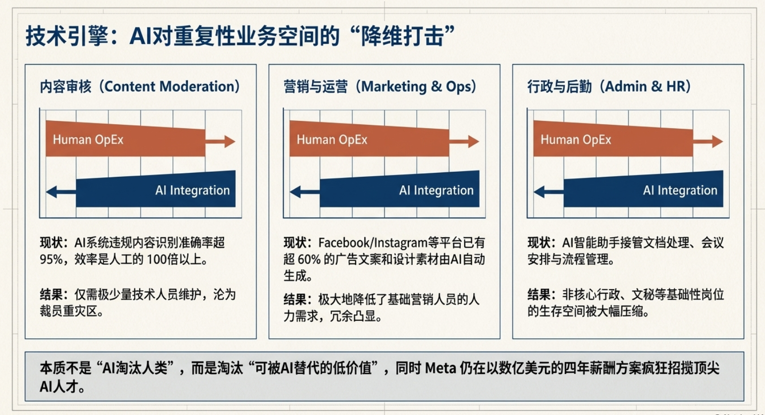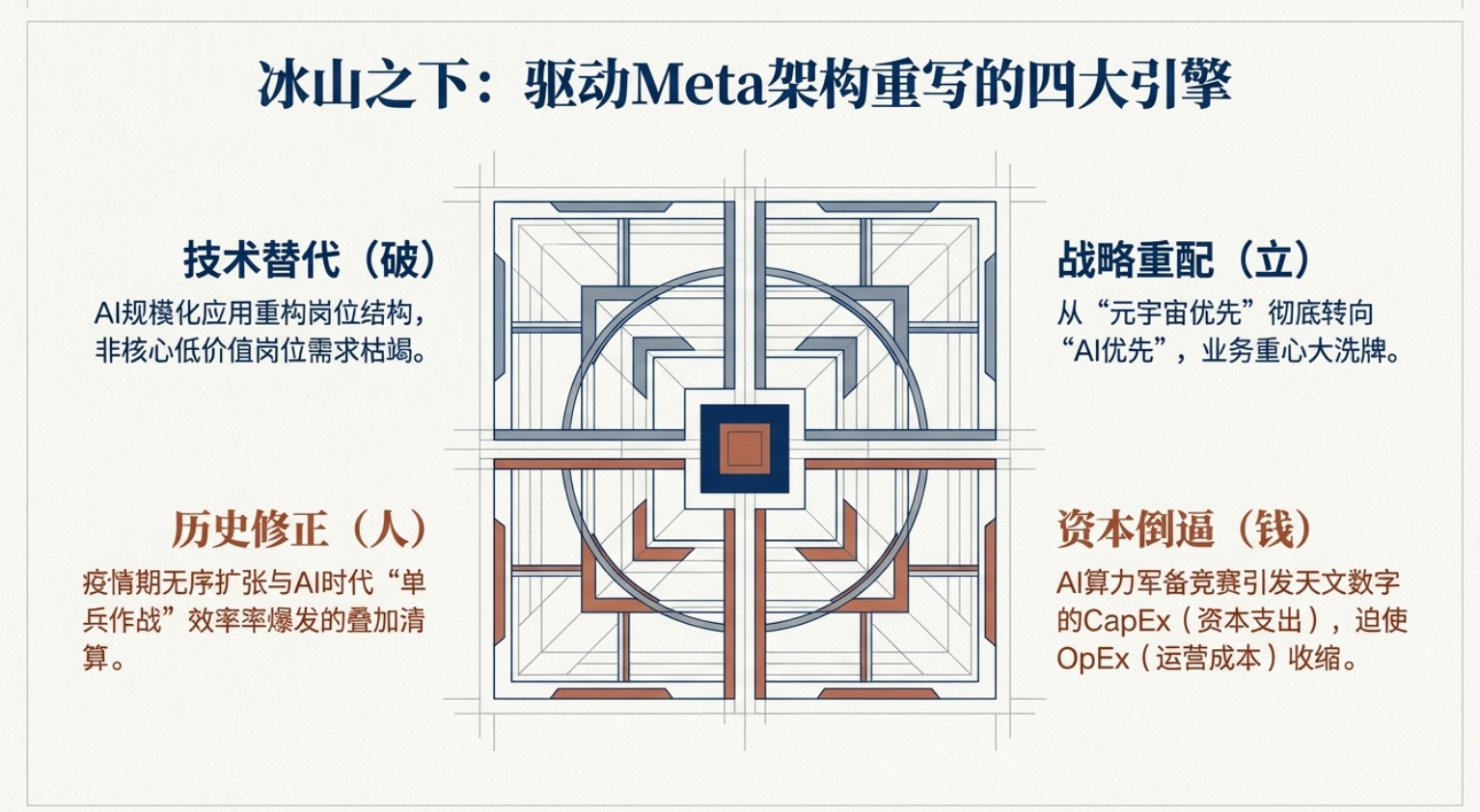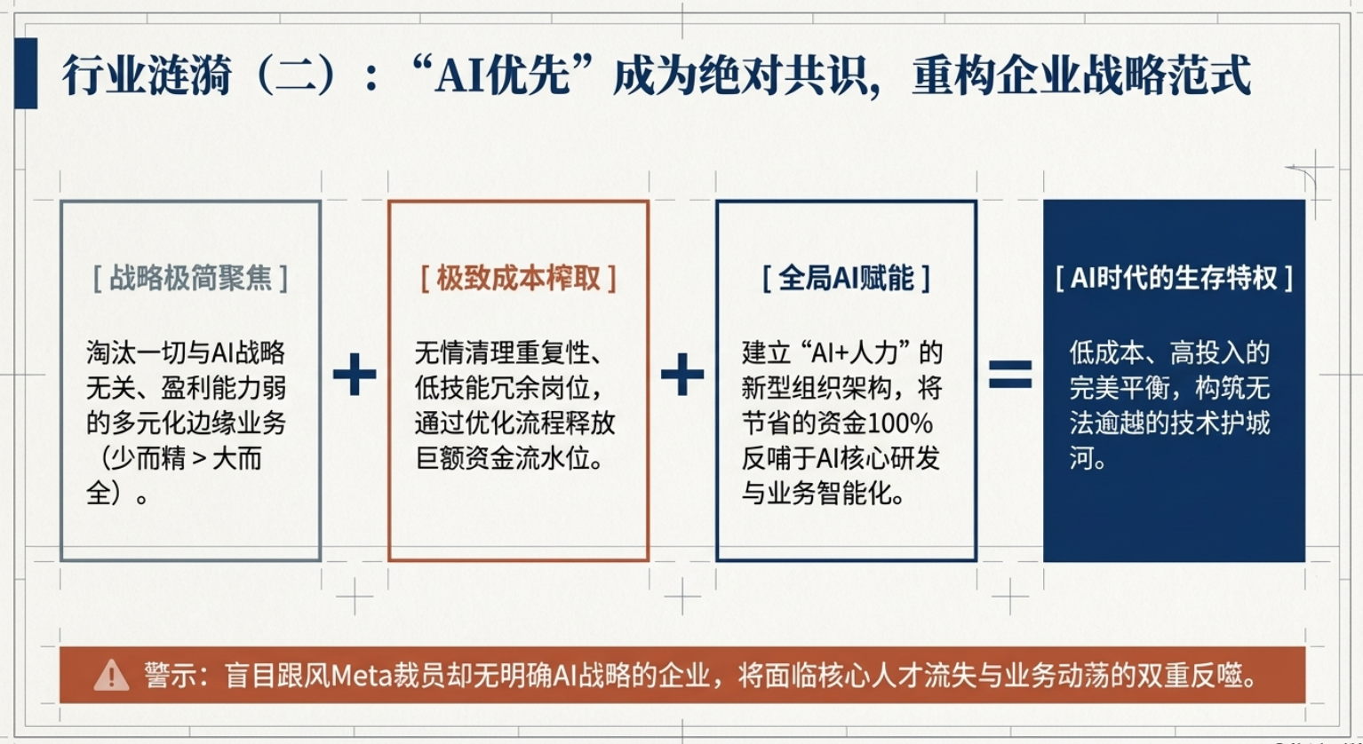 2026年3⽉,全球科技巨头Meta传出新⼀轮⼤规模裁员计划,引发全球科技圈⼴泛关注。据路透社、央视新闻等权威媒体援引知情⼈⼠消息,此次裁员预计⽐例达公司总⼈数的20%及以上,规模或将超1.58万人,是Meta⾃2022年底⾄2023年初“效率之年”重组以来规模最⼤的⼀次⼈员缩减。此前在2026年1⽉,Meta已裁减负责元宇宙业务的Reality Labs部⻔约10%的员⼯,⽽此次⼤规模裁员,被业内解读为公司战略重⼼彻底向AI倾斜的标志性动作。