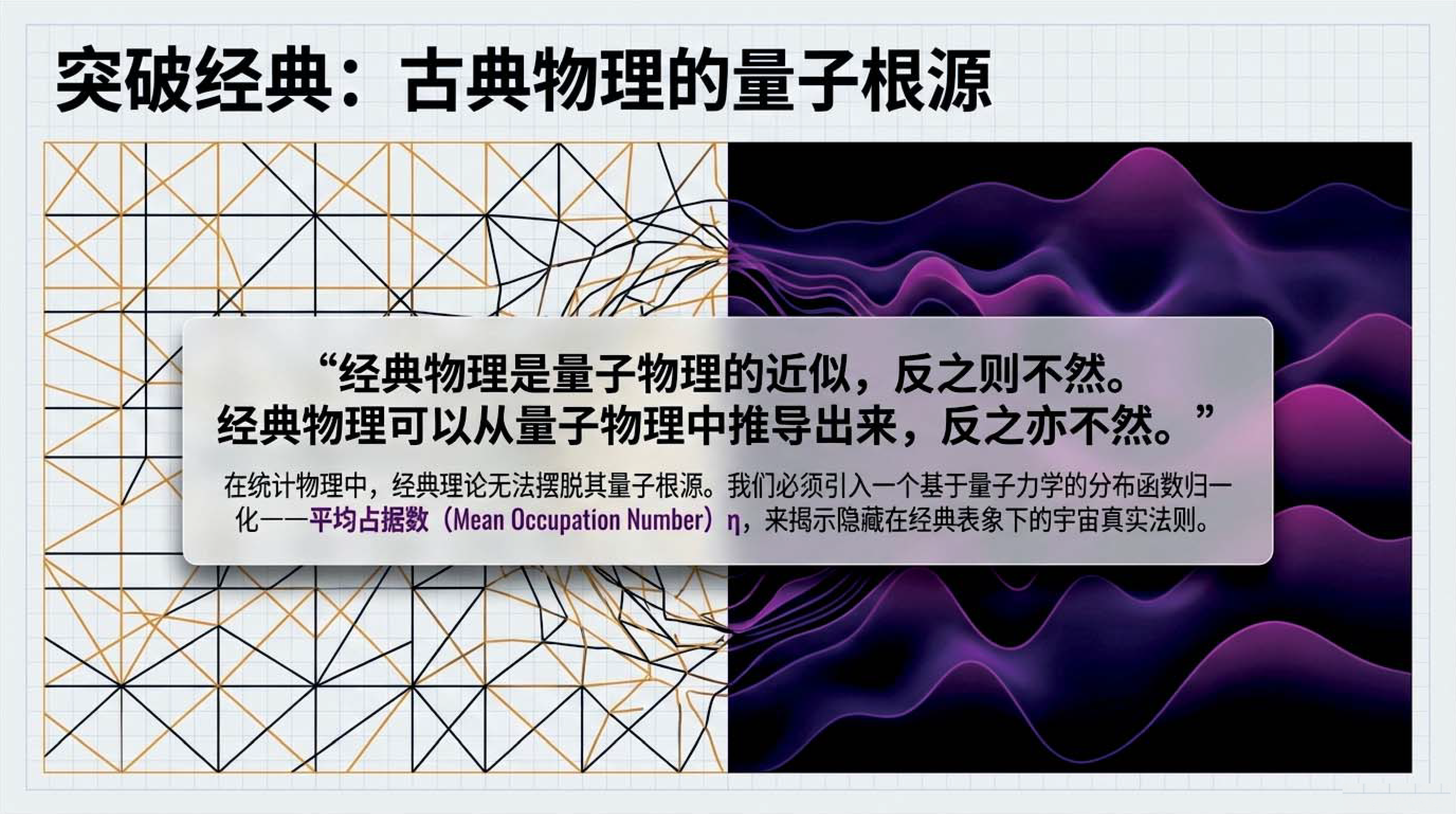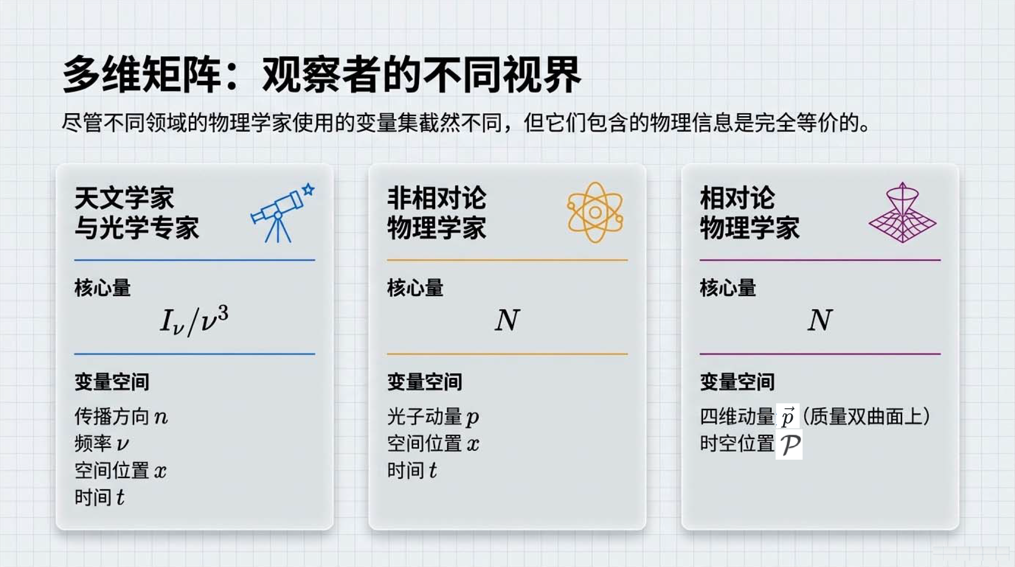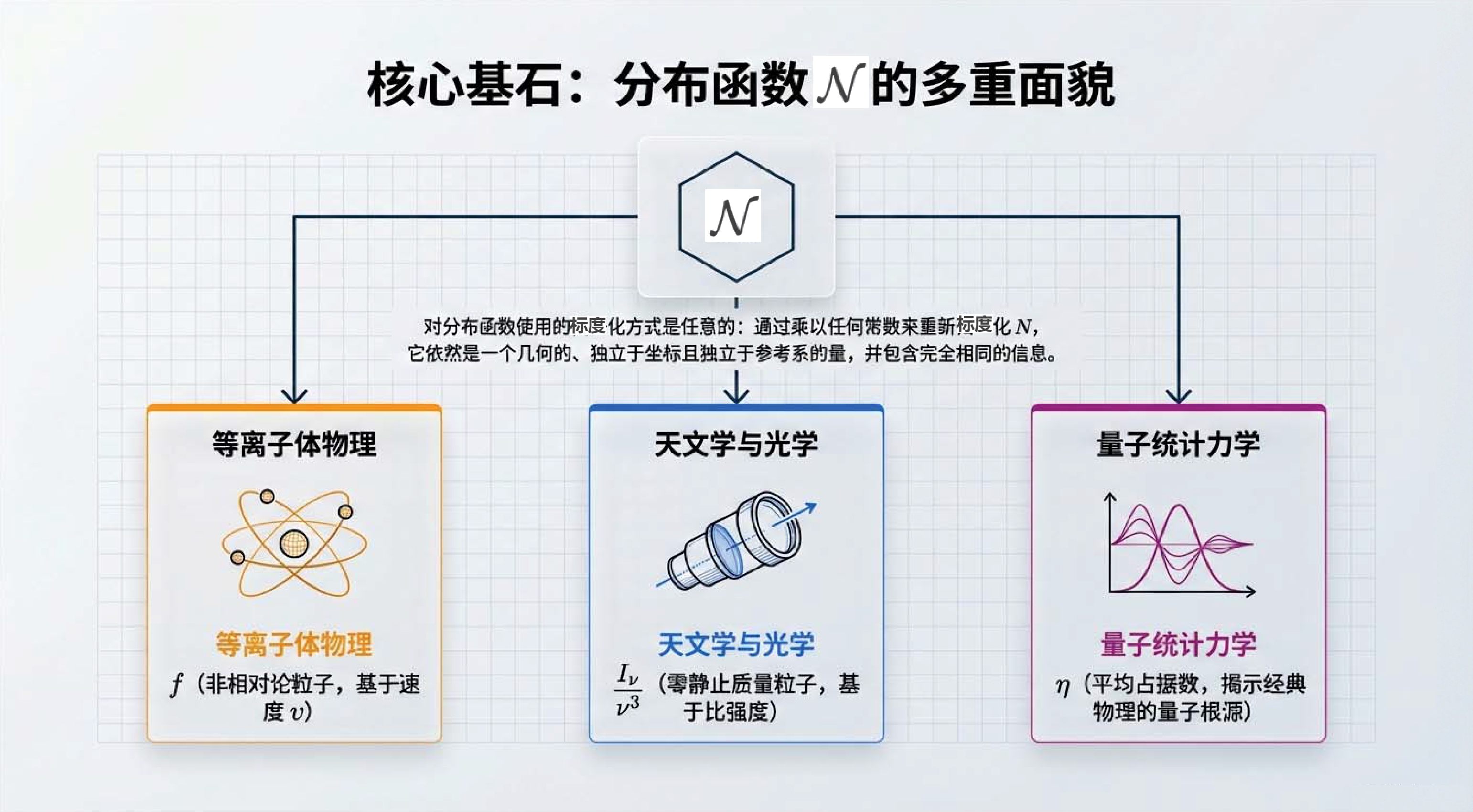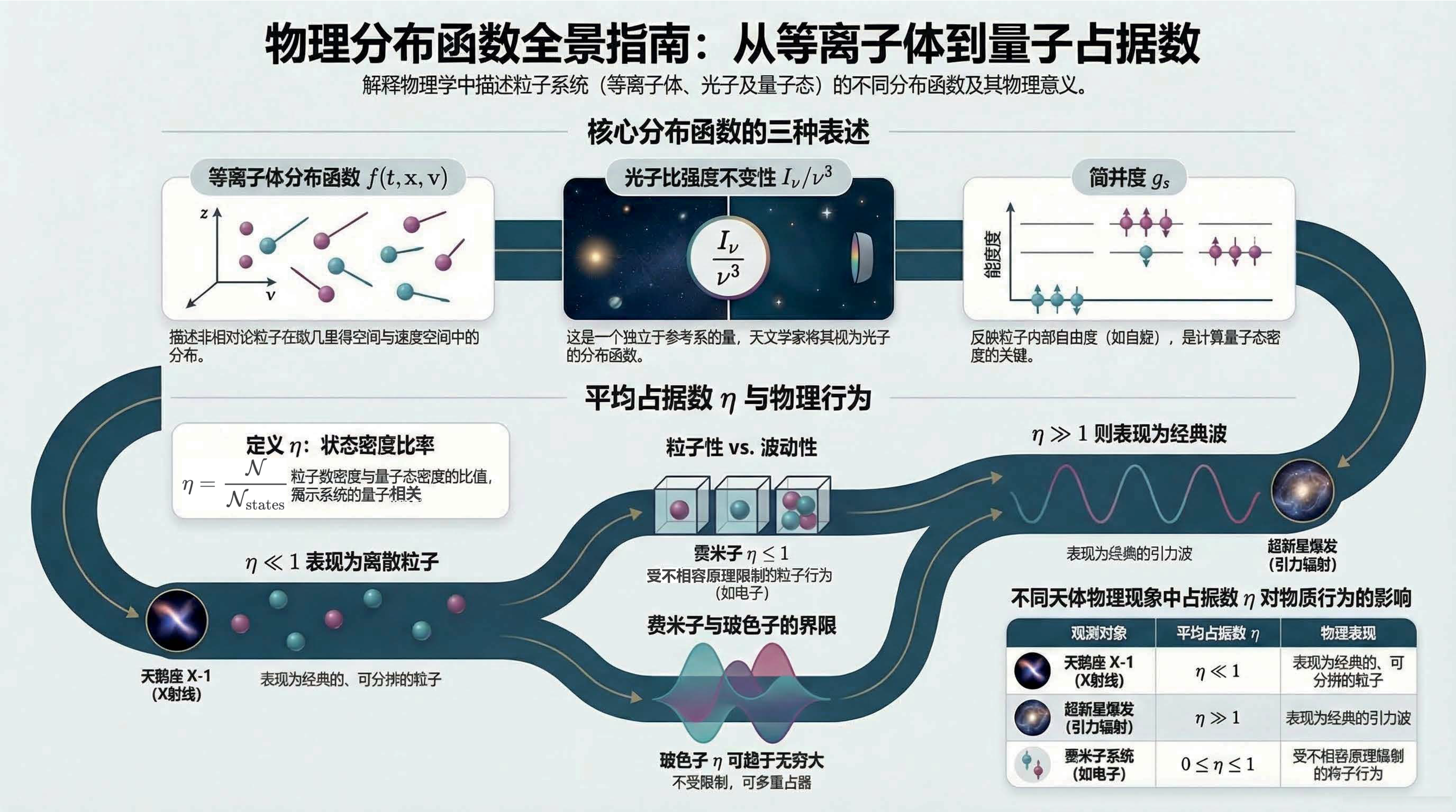 我们将揭开分布函数在不同物理领域的“化身”:从等离子体中的标度变换,到天文学中参考系无关的比强度。更深入地,我们将触及经典物理的量子根源—— 平均占据数 。通过探究态密度与自旋简并度,我们将掌握一把开启宏观世界的钥匙:仅凭 平均占据数 的大小,即可精准判定物质究竟表现为离散粒子还是连续经典波。无论是遥远黑洞喷薄的 X 射线,还是震撼时空的引力波脉冲,都将在这一几何框架下显现其物理本质。