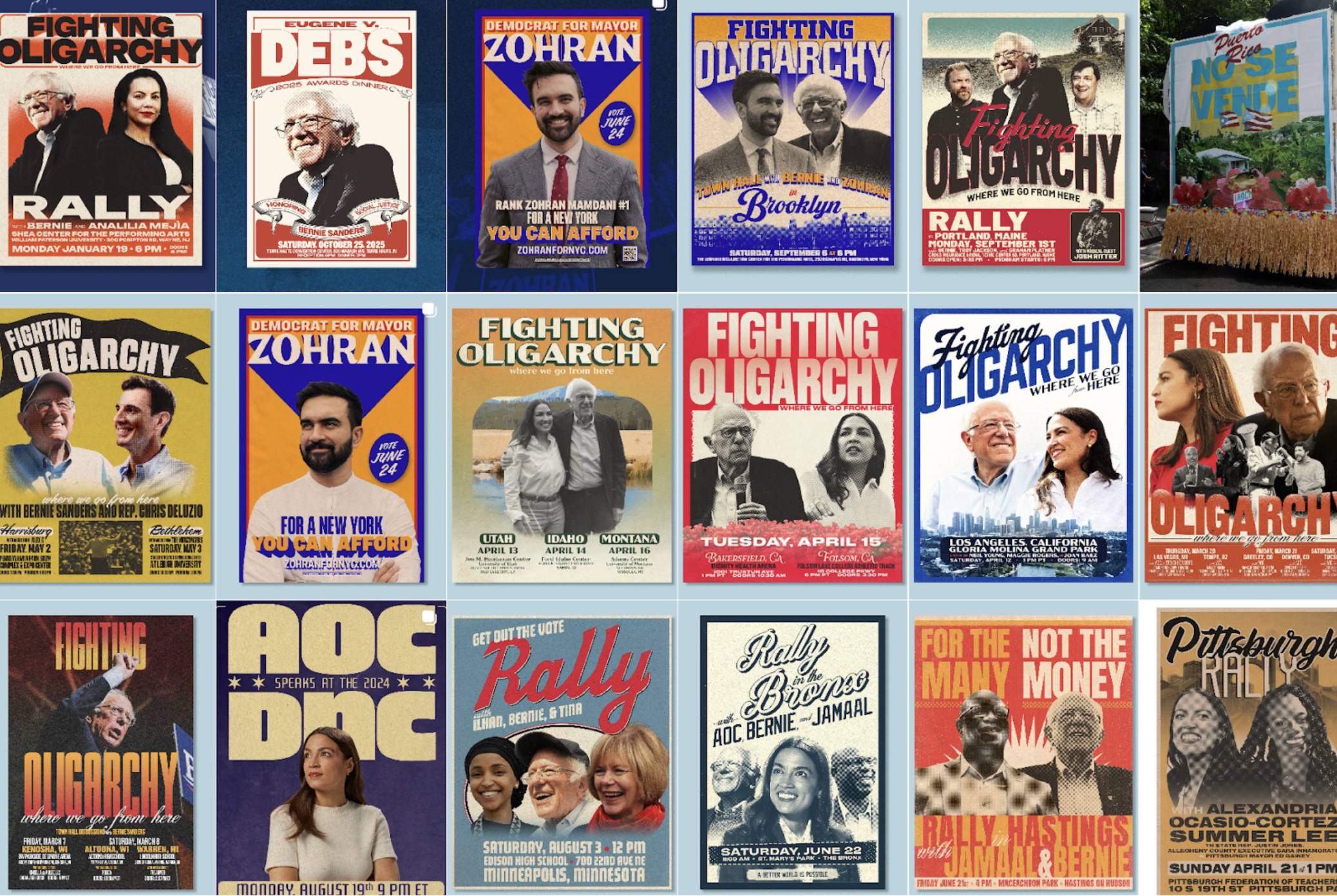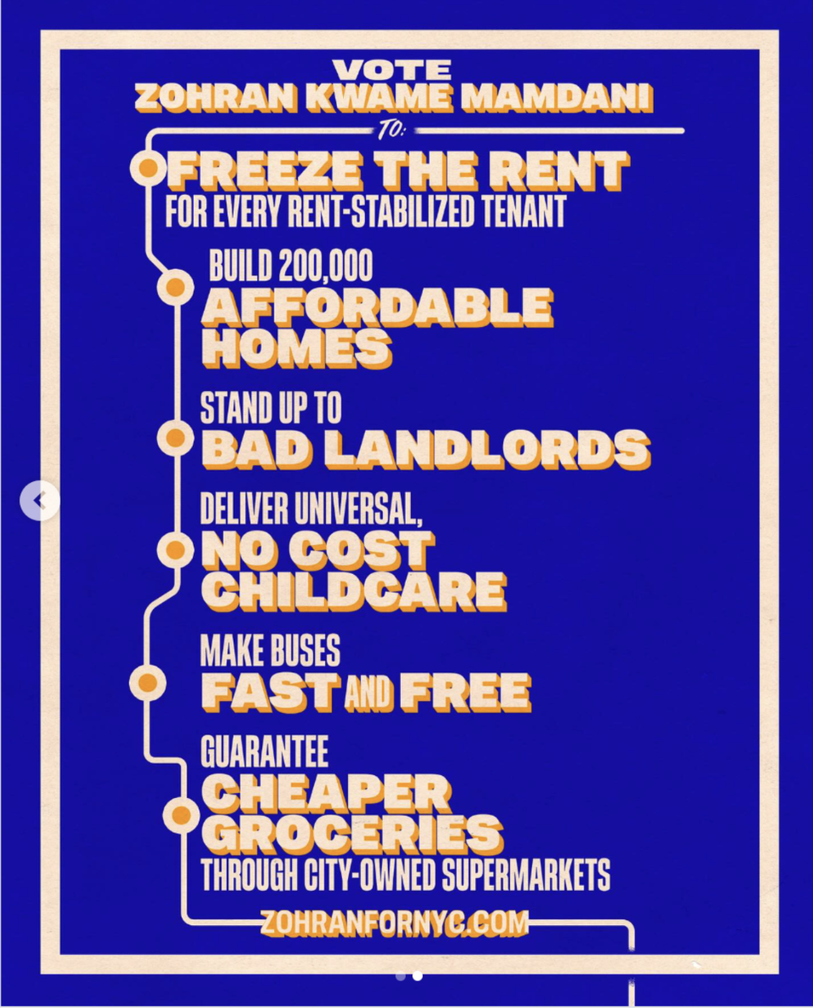 运用bodega 招牌字体,纽约地铁配色等本土元素,他的团队打造出了一套像街头潮牌一样的视觉语言。竞选海报、logo、周边商品、社交媒体图像——这些看似简单的设计元素,其实在选民还没仔细了解政策之前,就已经传递出一种情绪和身份认同。