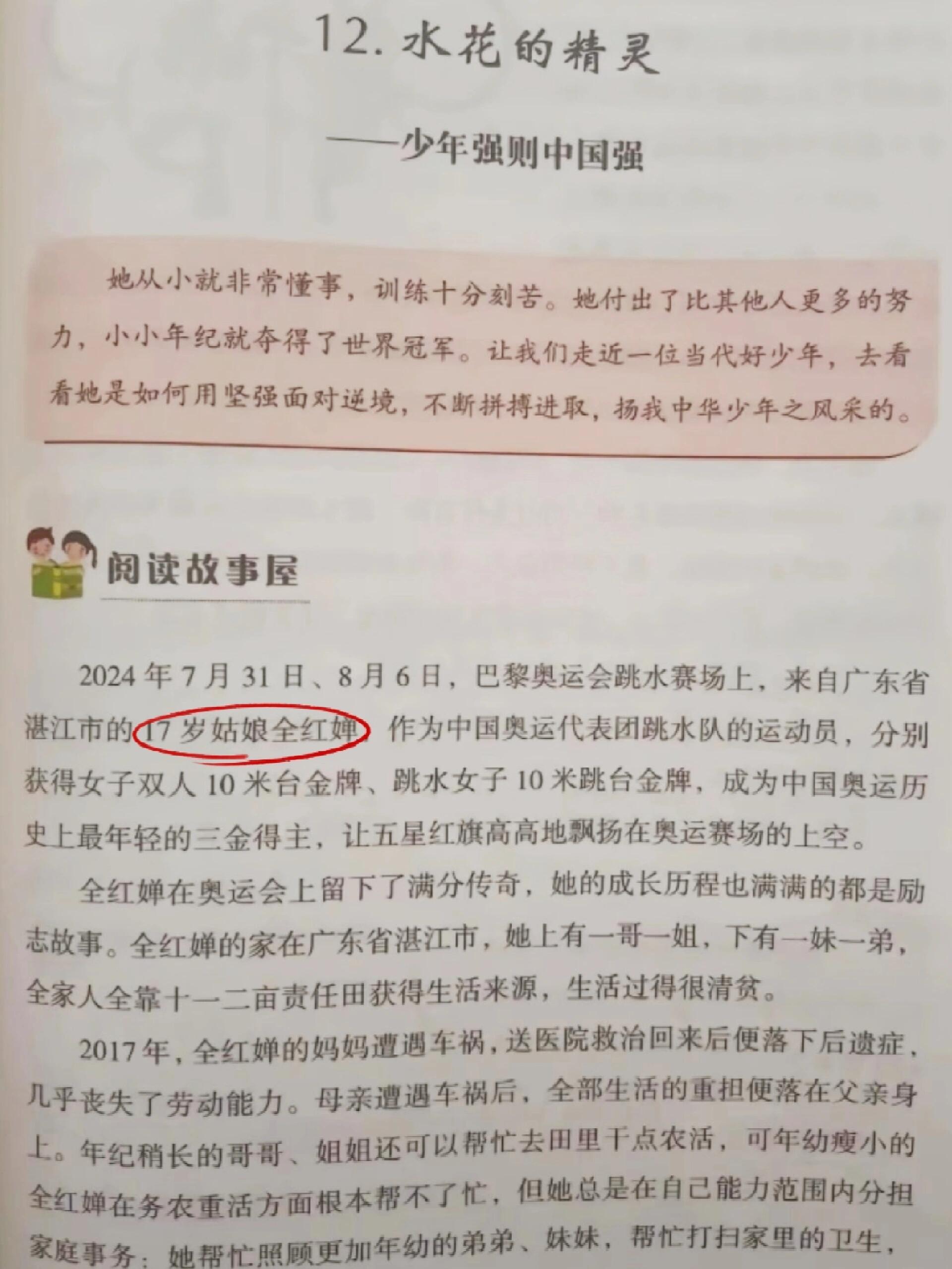 不过,有一点是真的,那就是全红婵的故事确实被写进了小学三年级的心理课教材,文章叫《水花的精灵》,讲她刻苦训练、孝顺懂事的成长经历,对于三年级的孩子们来说,婵宝确实是我们身边的真实的榜样。