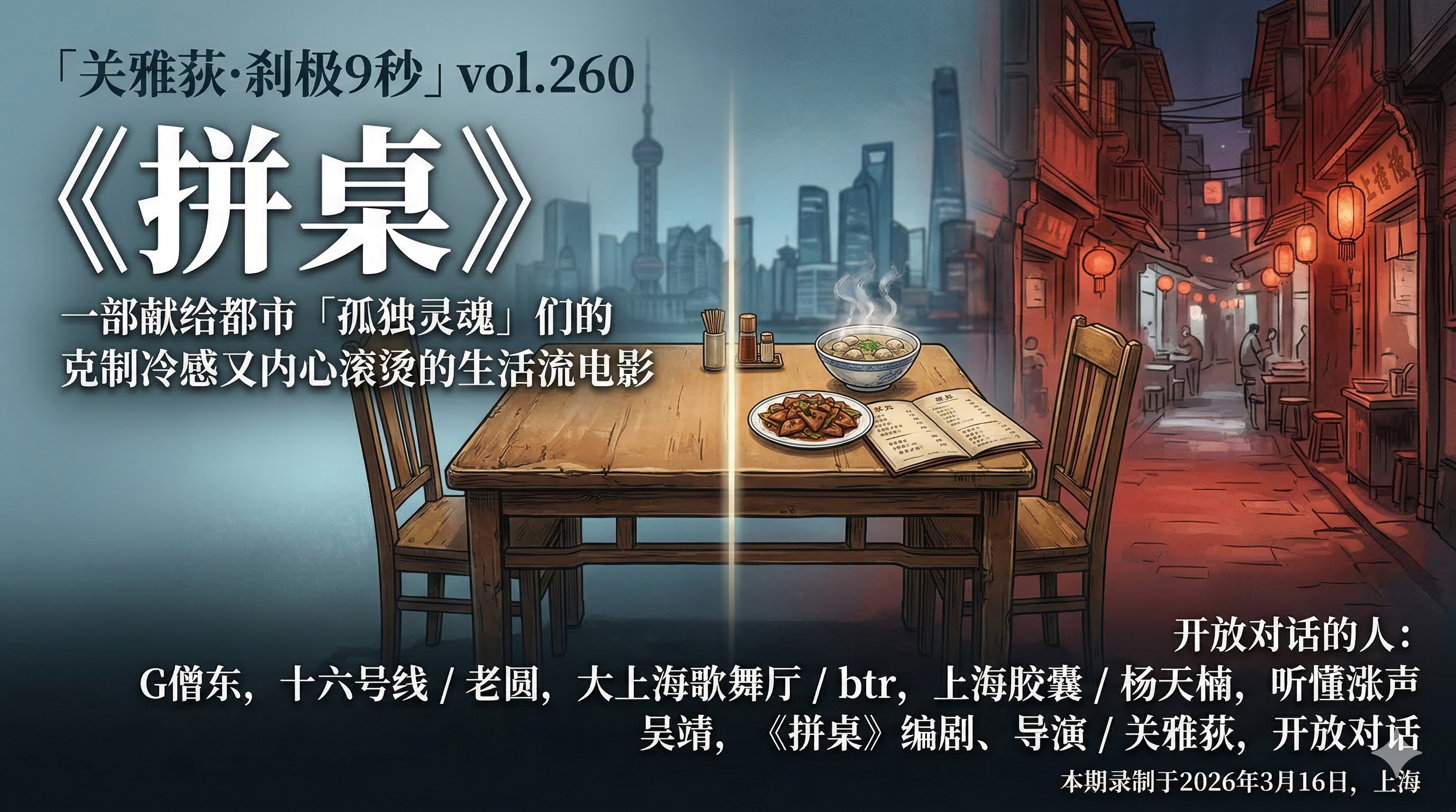 本期节目是由关雅荻发起的一场关于都市生活流电影《拼桌》(A Table for Two)的深度映后交流实录。节目集结了btr、老圆、G僧东、杨天楠等深耕上海文化的知名播客主播,从地域文化、空间叙事、社会学及个人生命体验等多个维度,对这部由江疏影和王传君主演的作品进行了全方位的解构。与传统的、追求情感爆发力的青春爱情片不同,《拼桌》被定义为一部“你淡我淡”的生活流电影,它不追求“地火星撞地球”的戏剧冲突,而是以一种克制且充满暖意的方式,描绘了当代都市人在快节奏生活中的孤独与相互治愈。