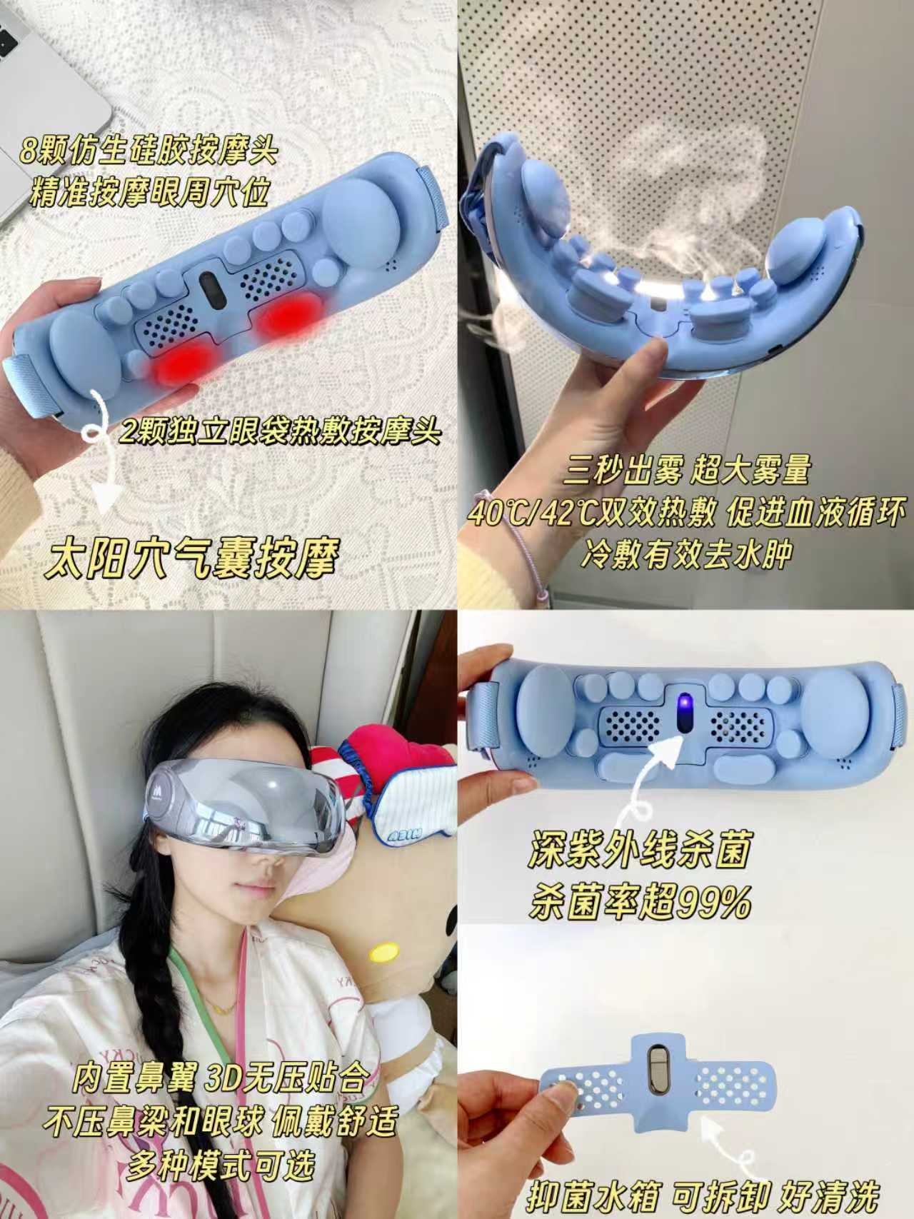· 40℃和42℃双效热敷:温热感促进眼周血液循环,加速泪水和油脂自主分泌,缓解眼睛干涩特别棒。睡前戴着一敷,还能帮助眼霜吸收,呵护眼周皮肤。
