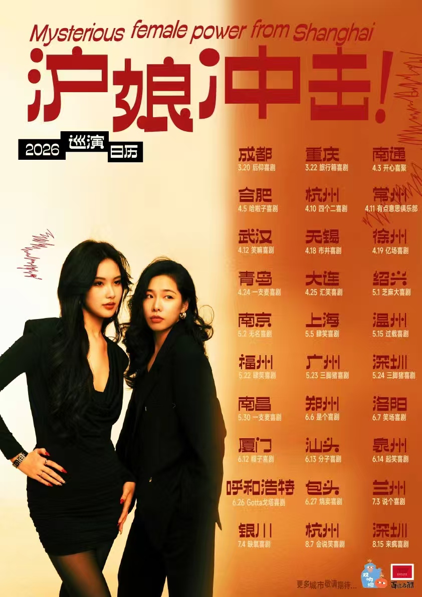 沪娘冲击全国冲击中,最近的几场是本周末成都和重庆,期待与大家的相见!开票信息可以关注狒狒小橘的小红书获取,各大平台小程序都可购买,快来check有没有登陆你所在的城市吧,千万不要错过!