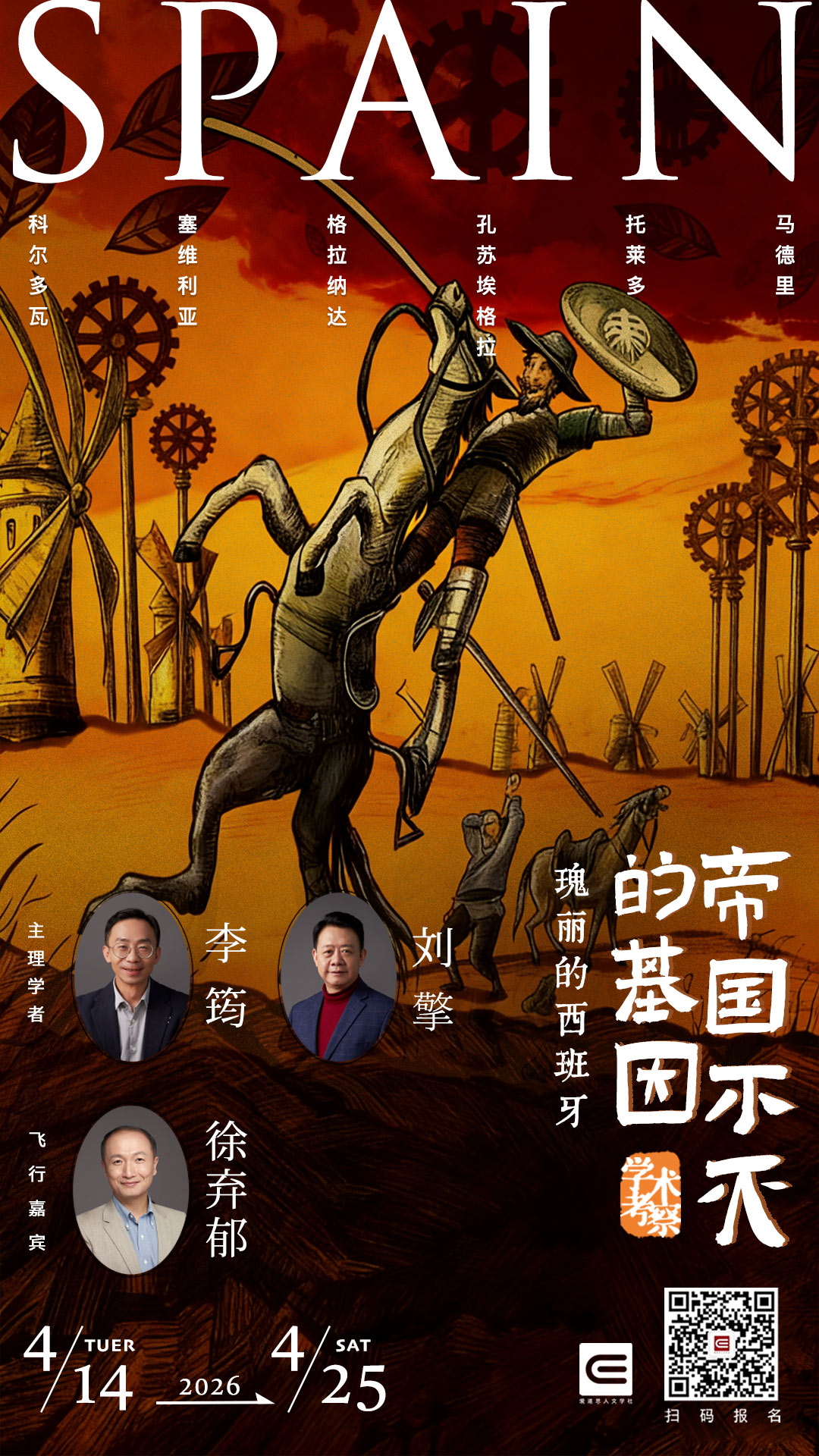 4月14日-25日,我们将和李筠、刘擎、徐弃郁三位老师一起,开启一段瑰丽奇幻的旅程。去触摸千年异色带来的欢笑与血泪,感受文明如风云般流转,又总有盛景停驻心中。更多信息可查看:《学术考察 | 帝国不灭的基因:多元瑰丽的西班牙》