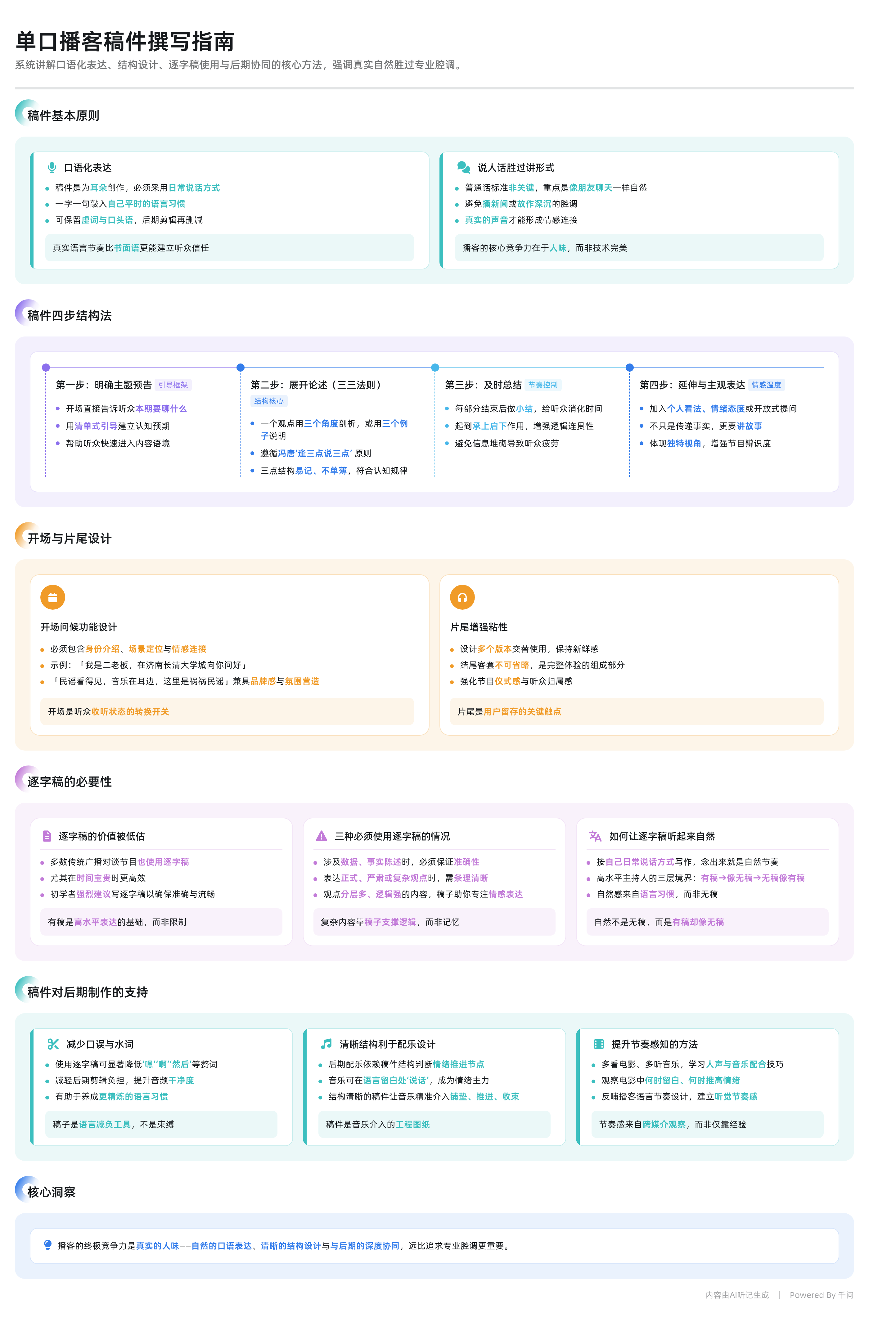 本次播客内容围绕单口播客稿件的撰写方法展开,系统分享了口语化表达、结构设计、逐字稿使用及与后期制作协同的关键要点。涵盖了从内容组织到声音呈现的全流程建议,并强调真实自然的表达比“高级感”更重要。