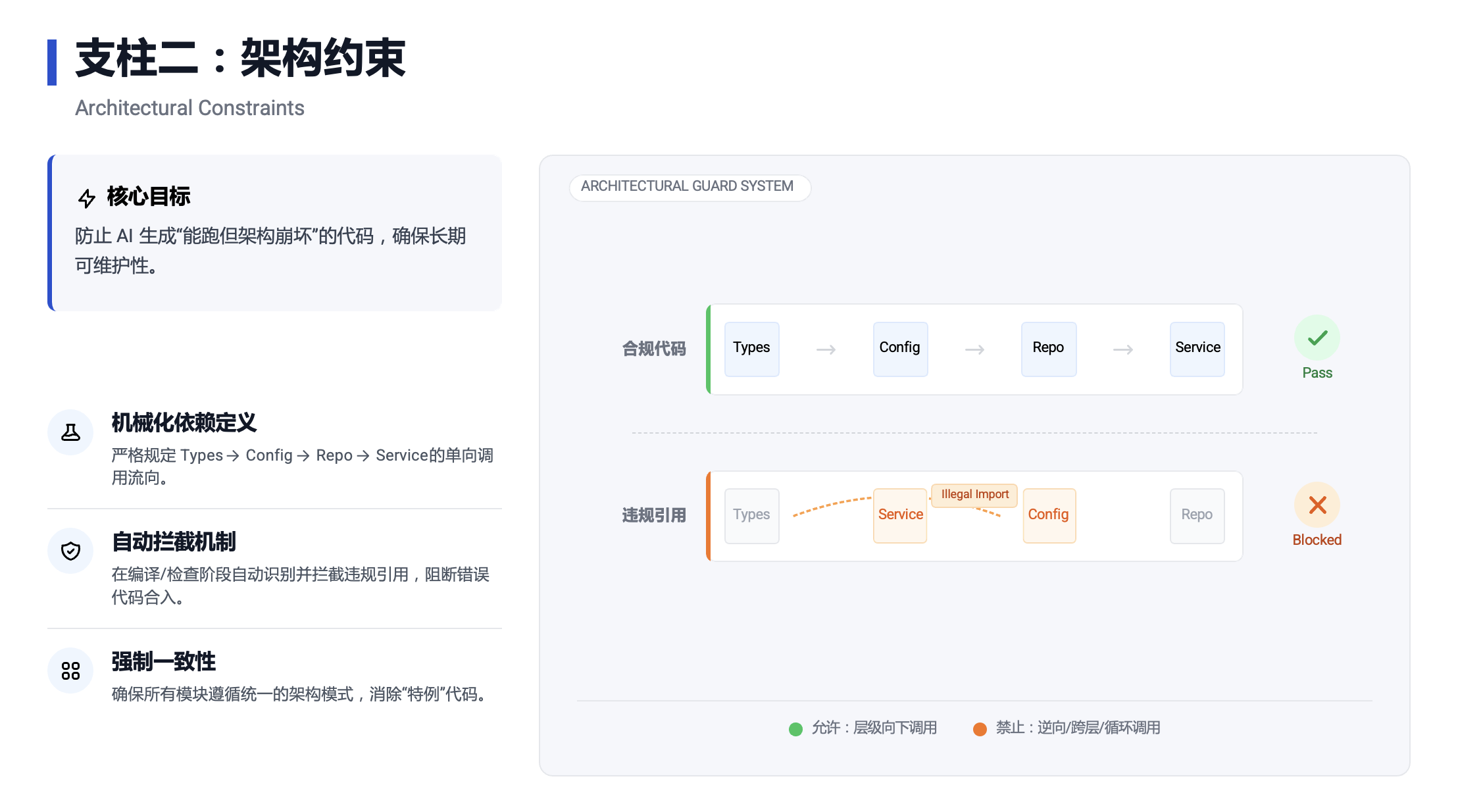 建立严格模型:定义清晰的架构层级和依赖方向(例如:Types → Config → Service),让 AI 在固定的轨道上运行。