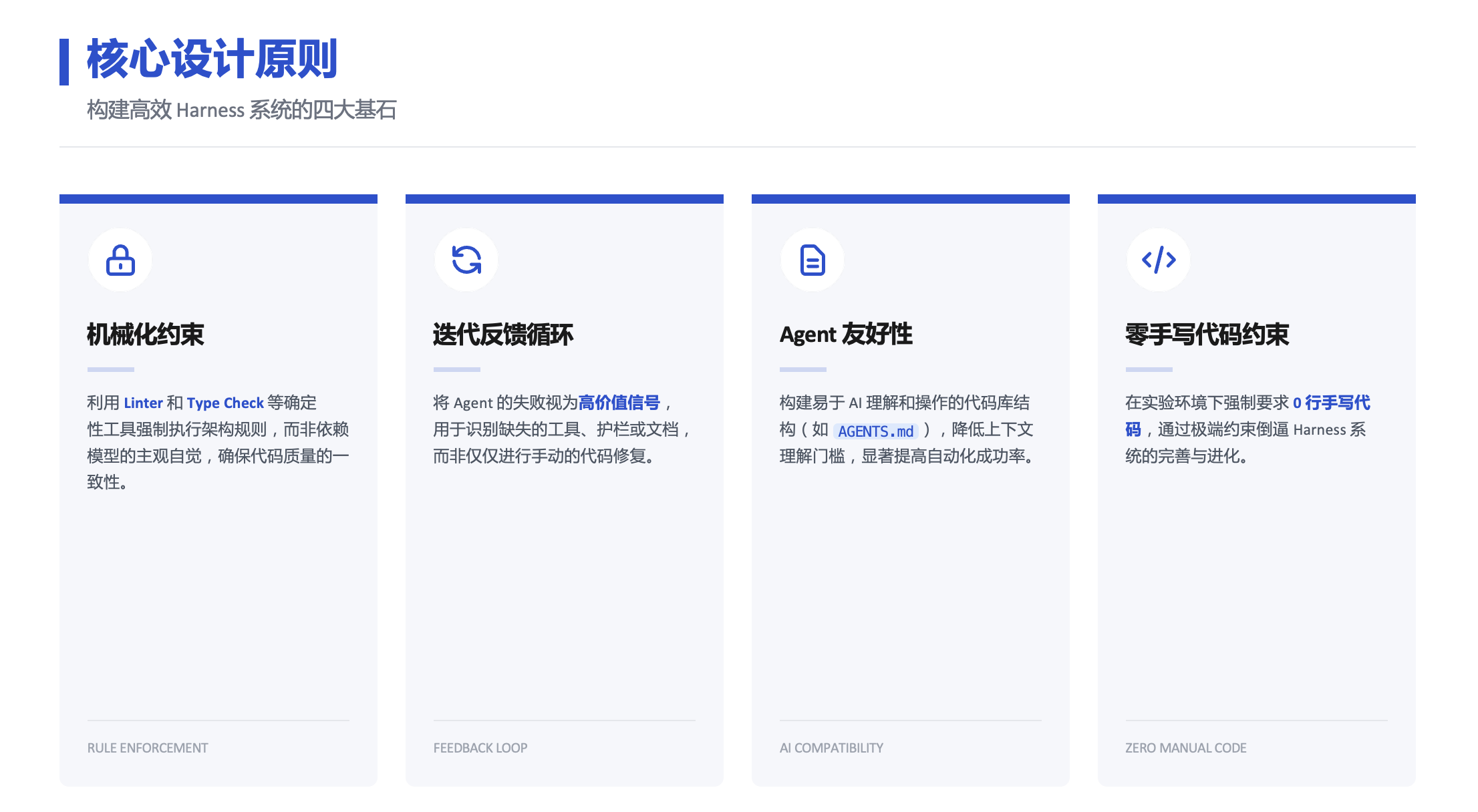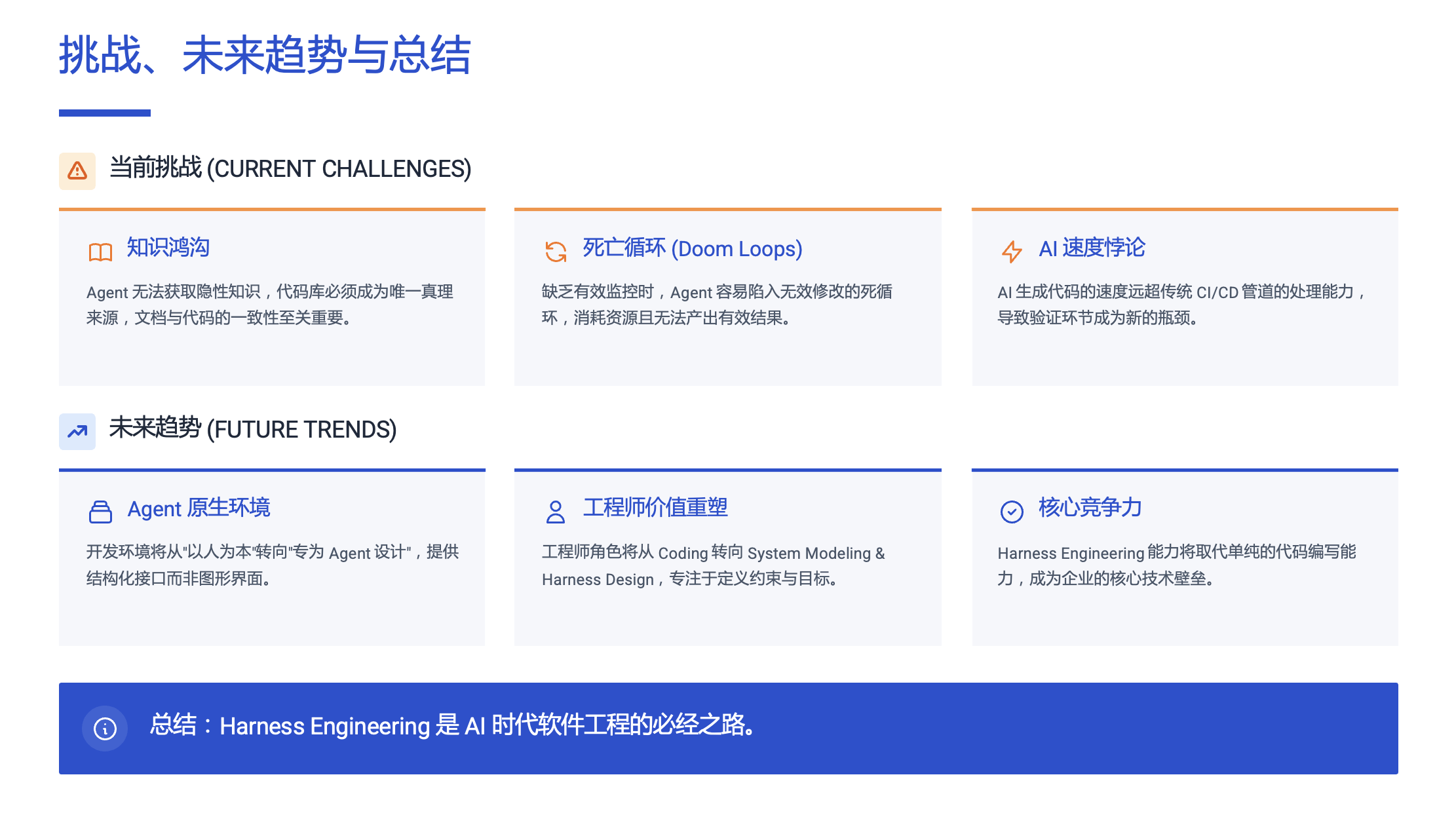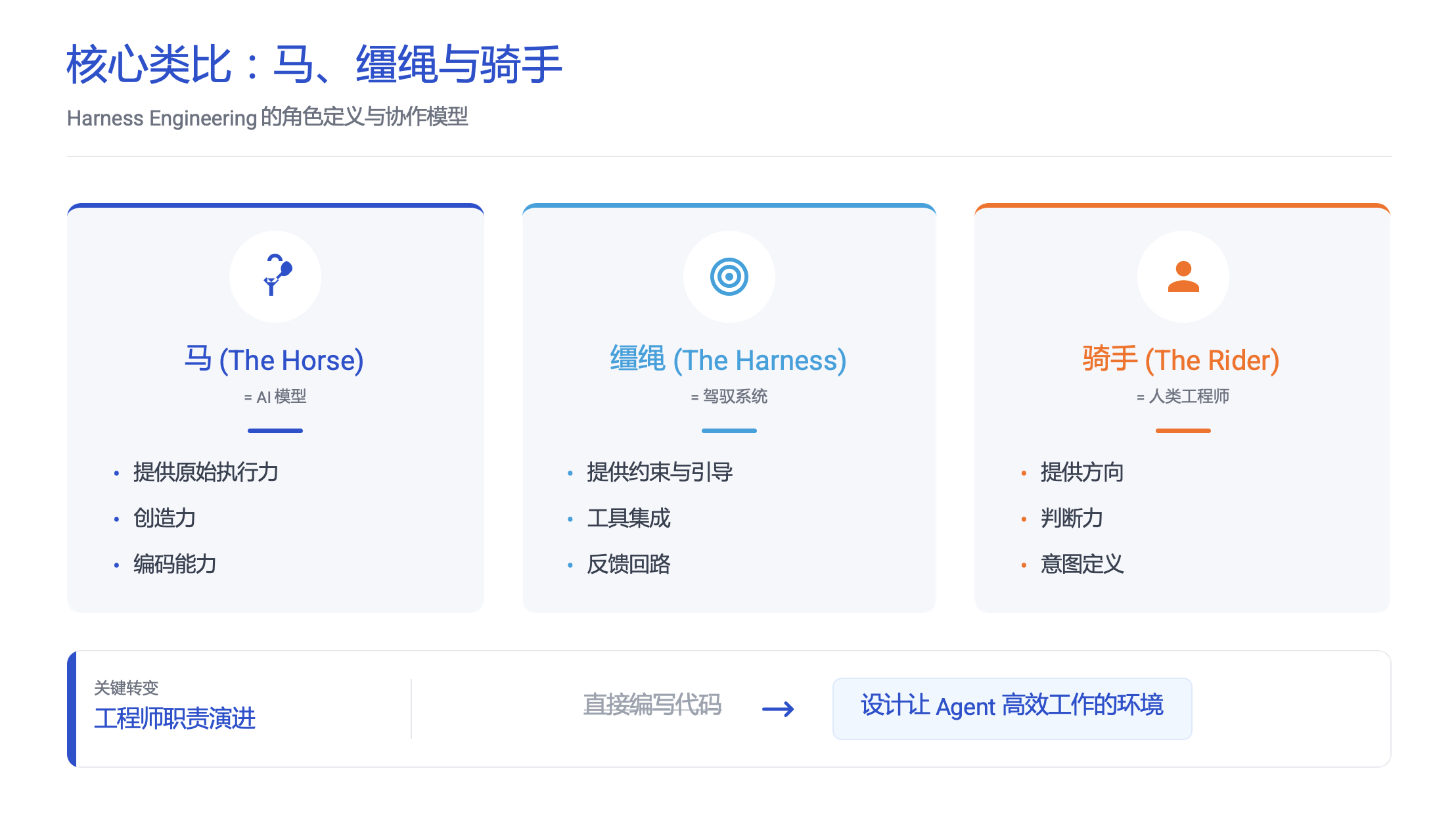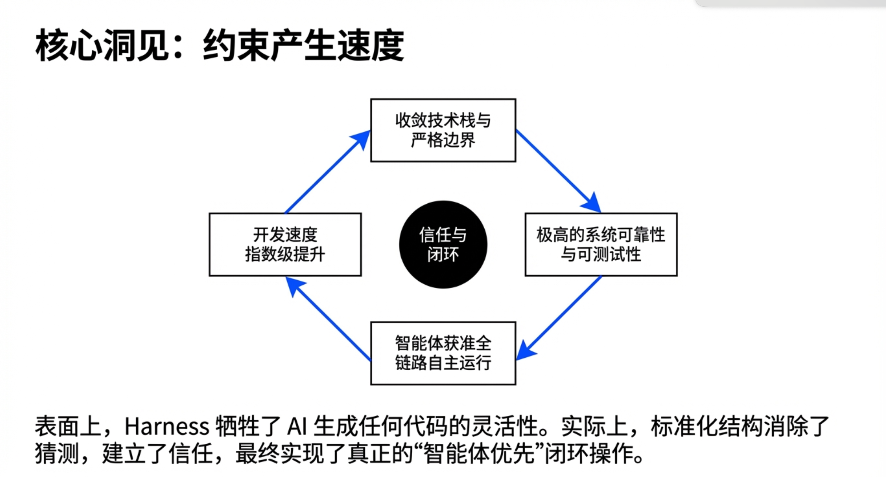 “Harness Engineering”代表了一种深刻的范式转移:通过引入确定性的控制系统(外壳),来驯服具有不确定性的 AI 创造力。它意味着我们不再将 AI 视为需要手把手教的实习生,而是将其视为一个可以在严明纪律下自主工作的团队成员。工程师的未来,不是被 AI 取代,而是成为这个“AI 团队”的架构师和环境设计师。