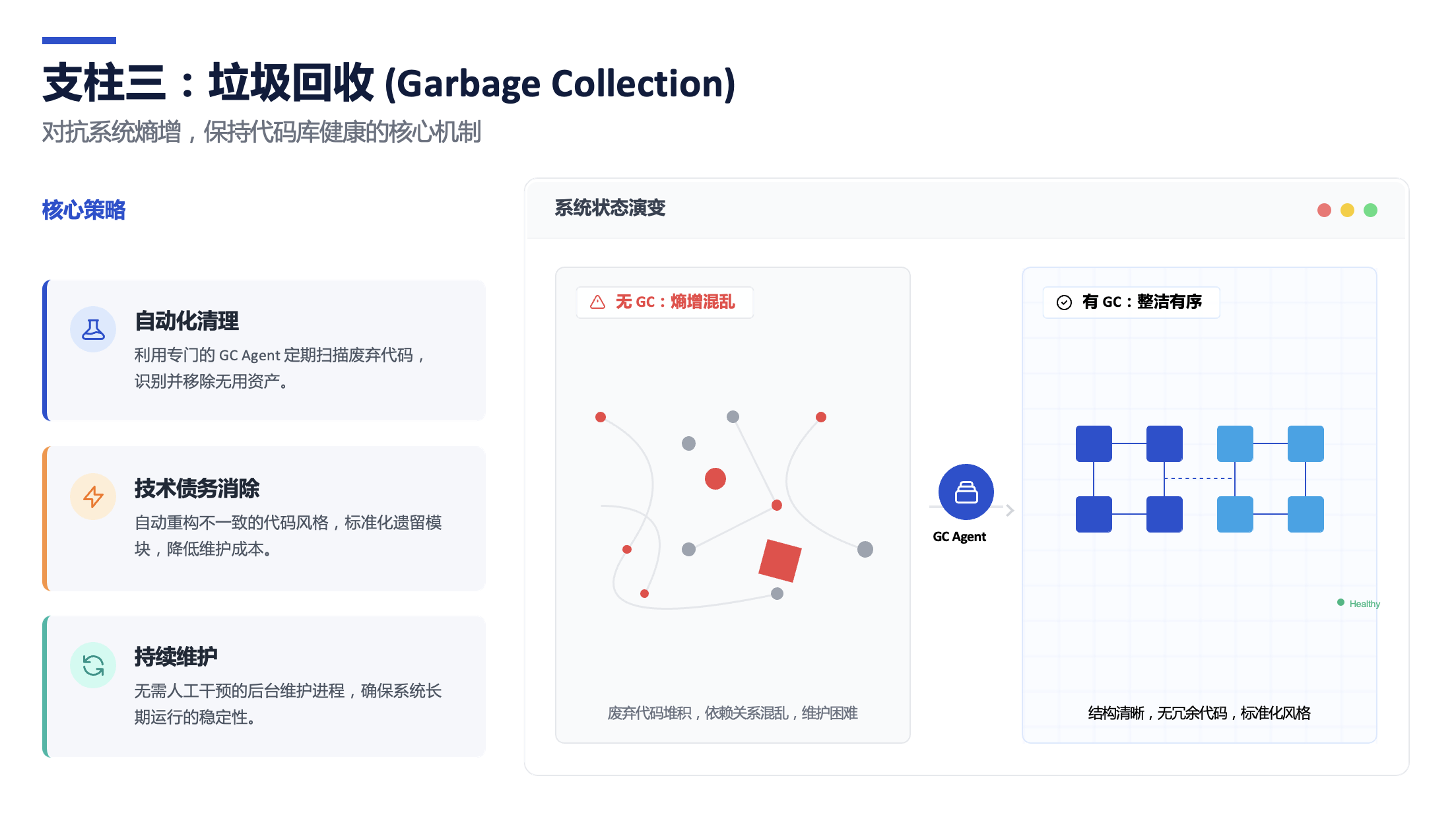 自动化强制执行:使用自定义代码检查器(linter) 和结构测试等确定性工具来强制约束,而不是依赖 AI 的自觉。AI 可以不理解为什么,但它必须遵守规则。 - “垃圾回收”:这是 AI 自己打扫卫生的“保洁机制”。
