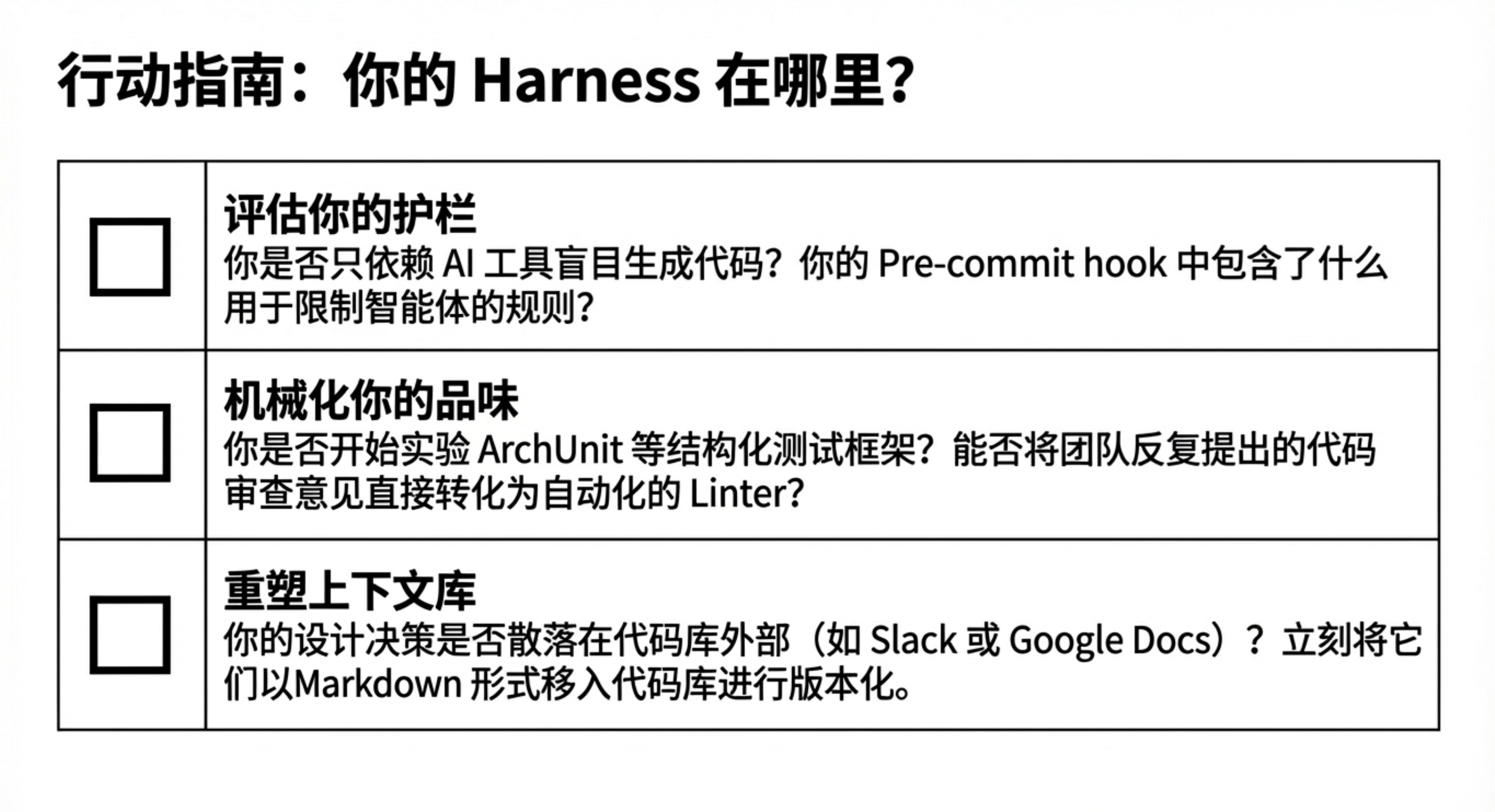 - 存量系统改造难:对于历史悠久的、结构混乱的旧代码库,想要回溯安装这套“线束”可能因熵值过高而变得不具成本效益。这更适合从零开始的新项目。