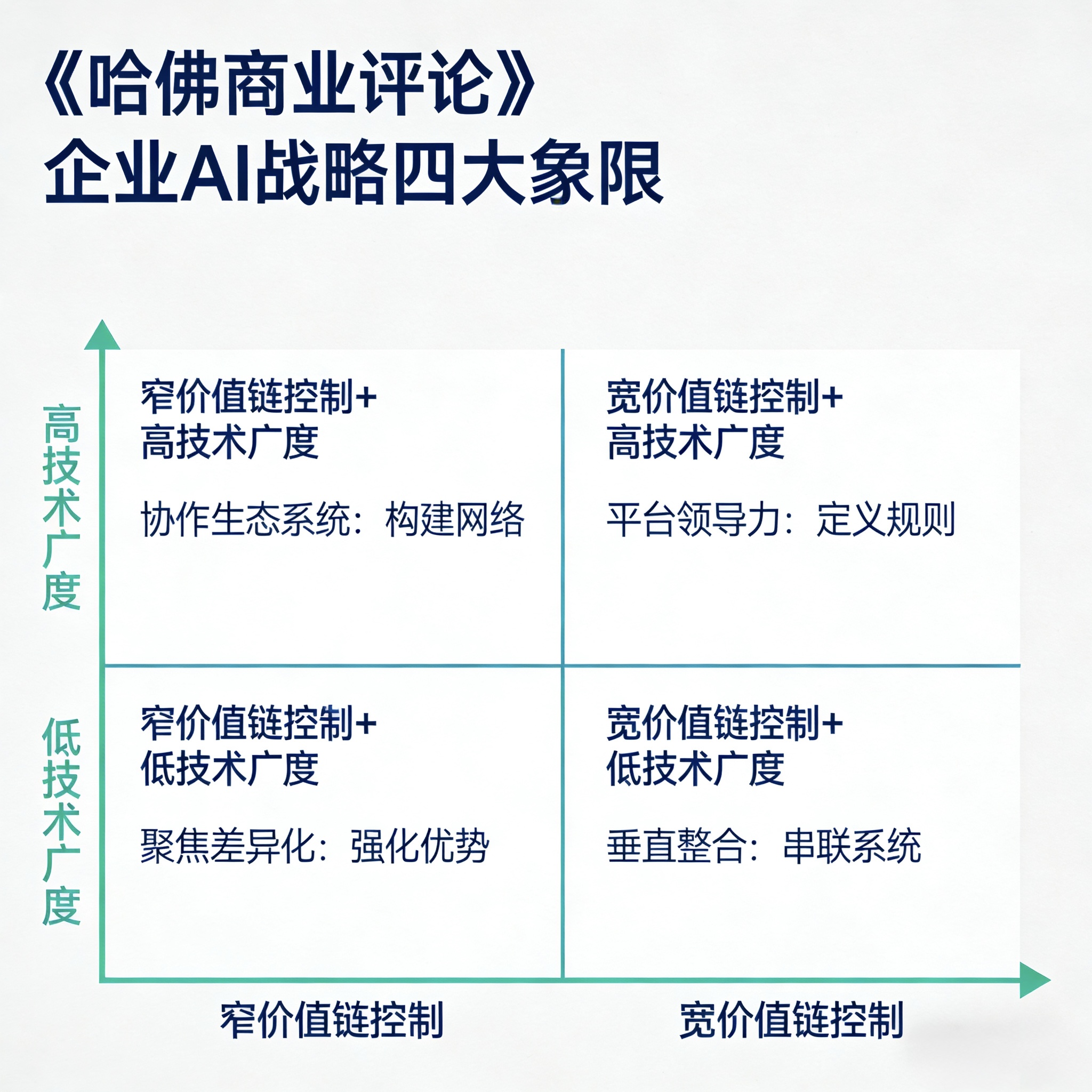 • 介绍《哈佛商业评论》提出的二维决策框架:通过「价值链控制」与「技术广度」两个维度,划分出4种AI落地策略。