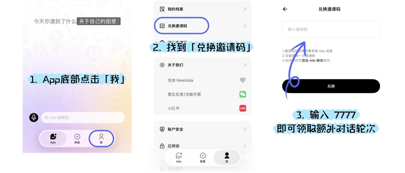 2)下载MeetAda并注册,在「我」-「兑换邀请码」界面输入脑袋空空专属邀请码「7777」,获取额外30条对话轮次