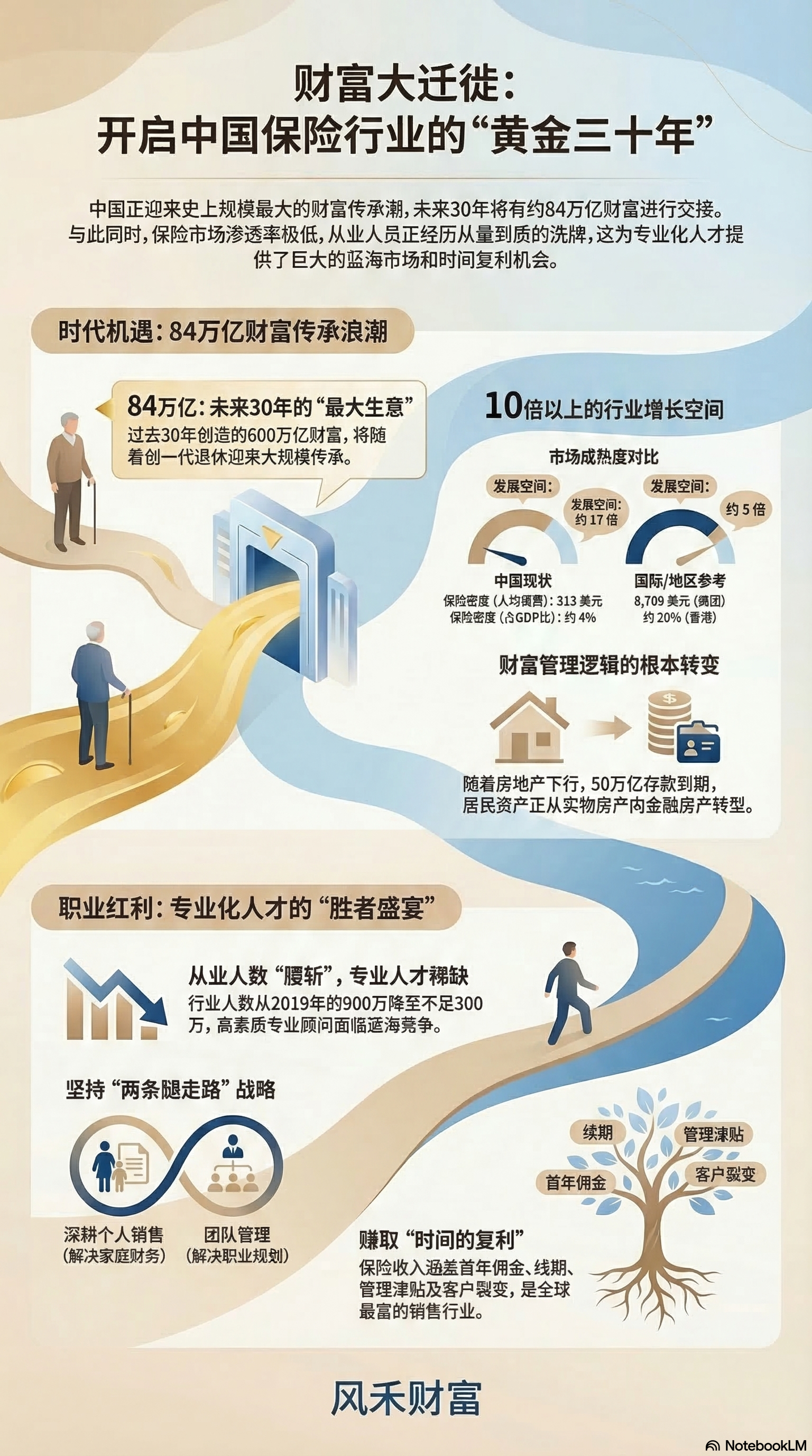 本先导课是一份针对保险从业新人的行业分析与职业规划指南,旨在启动团队思考并明确发展路径。作者通过对比中美保险密度与深度的差异,指出中国保险市场即将十倍的增长空间,并强调未来三十年将惊人的84万亿规模的财富传承红利。文章对比了从业人员大幅减少与市场需求短缺的现状,引发了保险行业正向人们达拉斯详细拆解了从普通律师到行业顶尖精英的招聘体系与职级梯度,鼓励新人设定长期事业目标。团队通过分享专业化工具与AI赋能方案,强调流程了“多余腿走路”的增员与销售战略。最终,作者号召成员秉持长期主义心态,通过标准化积累客户资产,以共享时代红利并实现财务自由。