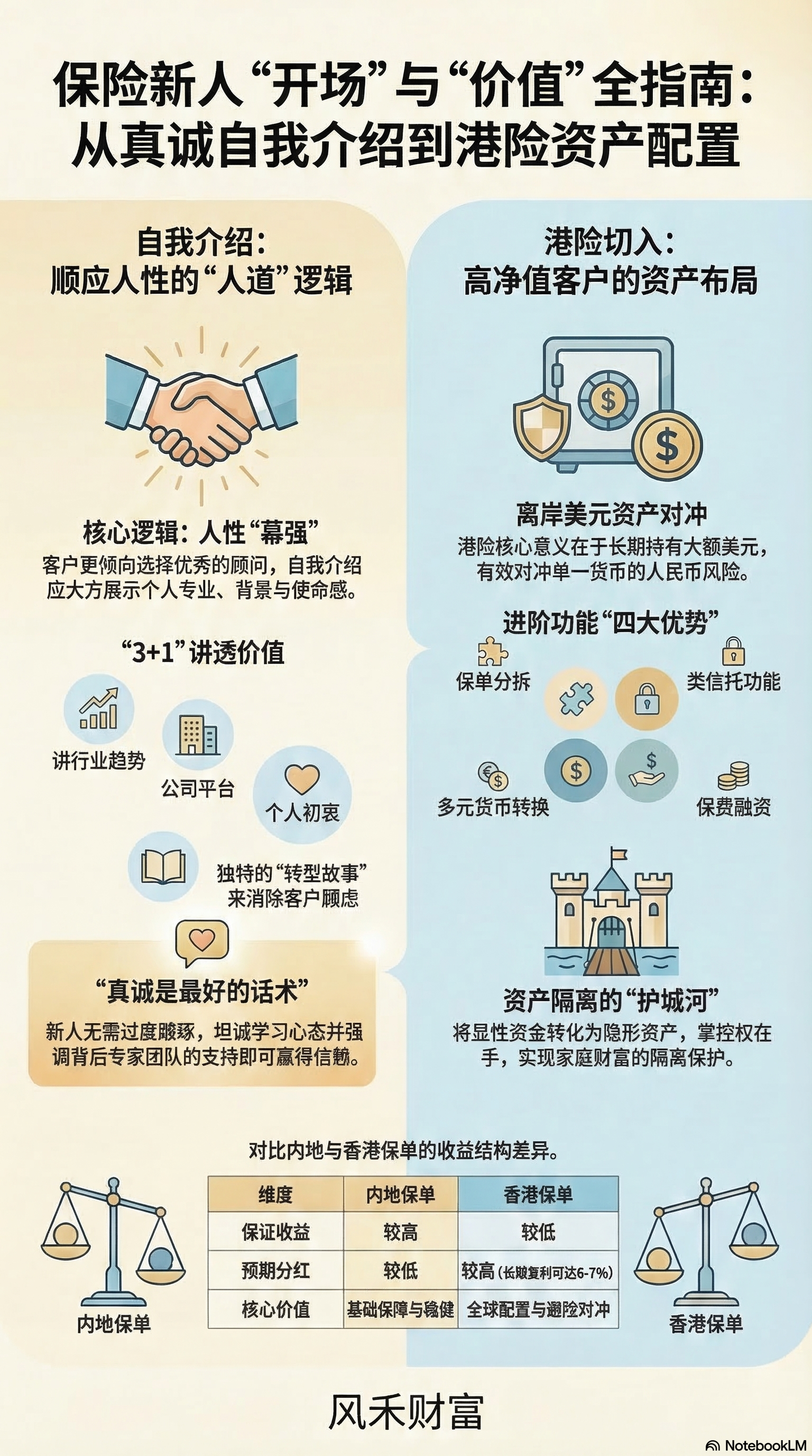 本课详细介绍了保险新人如何通过建立人际链接与挖掘潜在需求,自然地开启香港保险话题及进行自我介绍。文中提供了针对不同社交场景的实操话术,涵盖了老客户维系、校友聚会、职业转型官宣以及高净值人群的资产配置咨询。核心逻辑强调不进行强行推销,而是结合香港优才身份续签、美元资产避险和跨境医疗教育等增值服务,展现从业者的专业性。通过对比内地与香港保单在收益结构、货币多样性及信托功能上的差异,指导新人引导客户关注长期财务安全与全球化资产布局。此外,资料还针对高净值家庭的特殊需求,提出了关于资产隔离、多元货币对冲以及家族传承的沟通策略。
