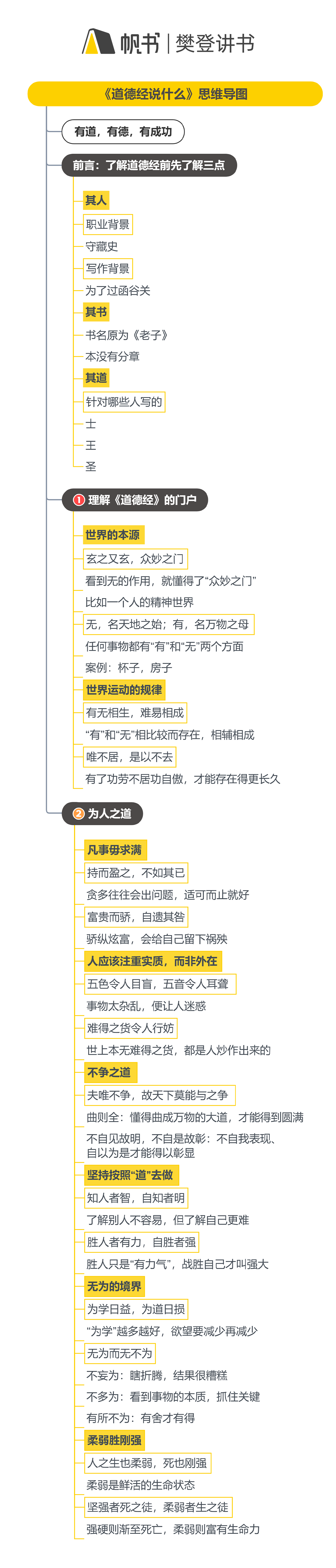 主播介绍—— 樊登樊登,帆书(原樊登读书)创始人、首席内容官。《可复制的领导力》、《低风险创业》、《陪孩子终身成长》作者。国际大专辩论赛冠军。本期嘉宾—— 韩鹏杰韩鹏杰,西安交通大学人文学院哲学教授、国际辩论赛资深评委、著名学者。其主编有《周易全书》《中国古代哲学论著》《古诗观止》《白话资治通鉴》等著作。思维导图——《道德经说什么》