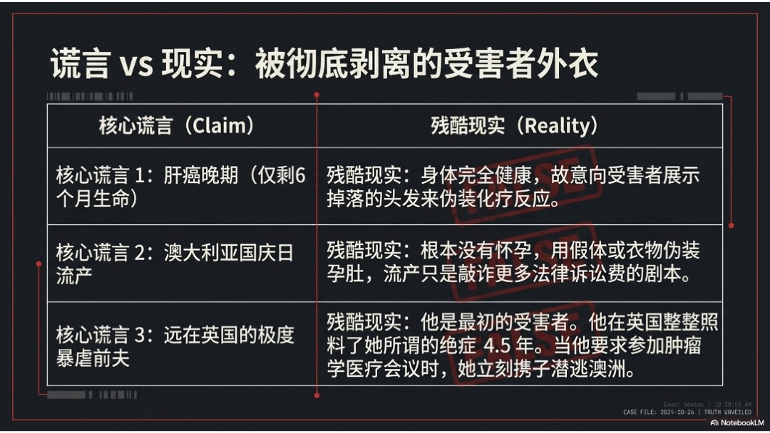 • 虚构疾病、伪造怀孕、编造经济困境持续多年。