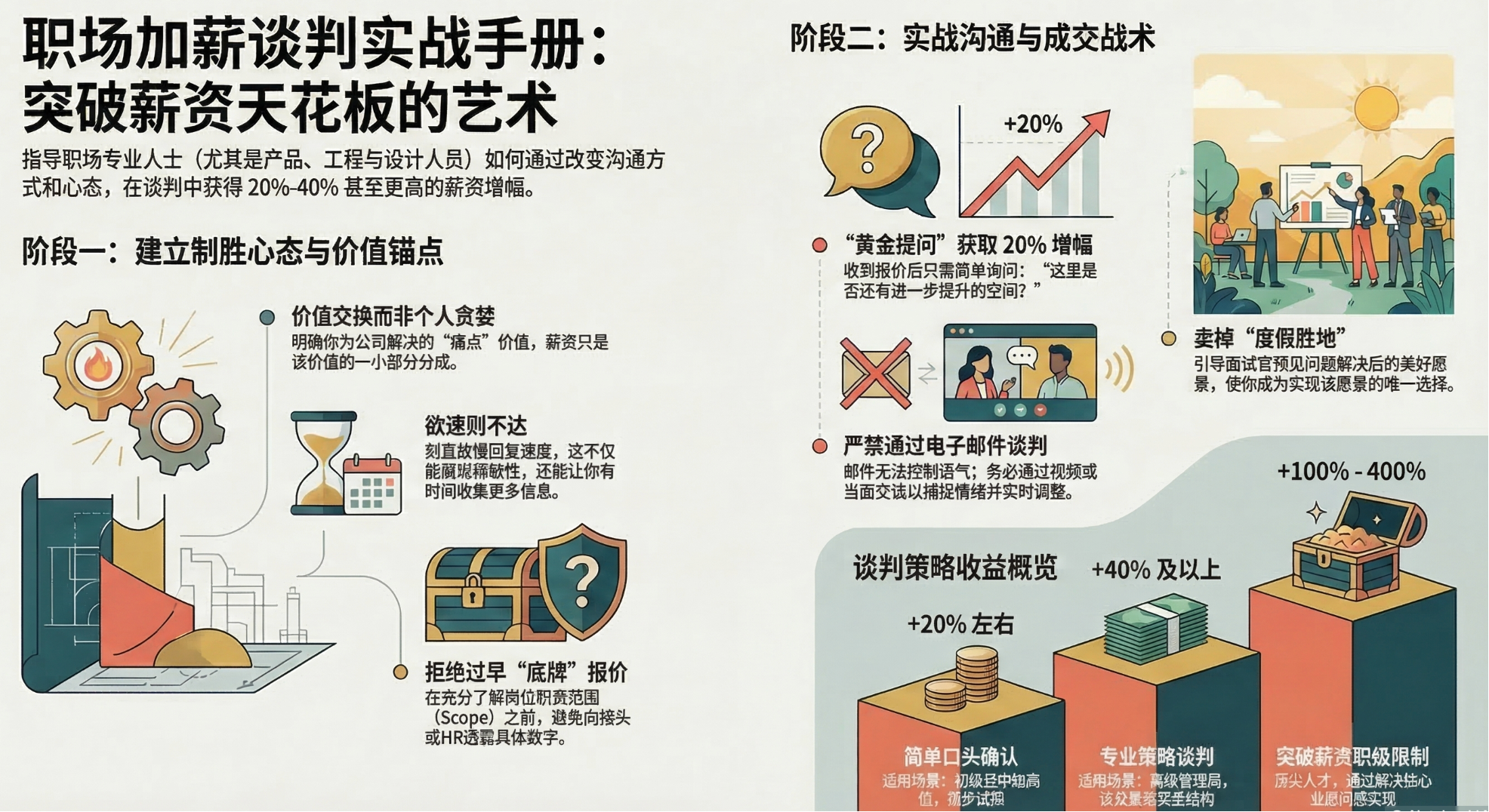 * 04:35 薪酬谈判的20-40%法则:Jacob Warwick透露,求职者仅通过简单地反问一句“薪酬方面还有没有可能再多一点”,几乎每次都能看到20%的薪酬提升。他指出,他帮助客户争取的目标通常是实现40%左右的涨幅,并强调“那些敢于用一种有意义、有合作精神的方式去挑战权威的人,往往比那些不敢的人能赢得更多。”