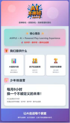 【AIXPLE】 AI不神秘独创的教学体系(AI × Powered Play-Learning Experience),核心是“玩中学、做中学、做中出成果”,让孩子在游戏中创造。
