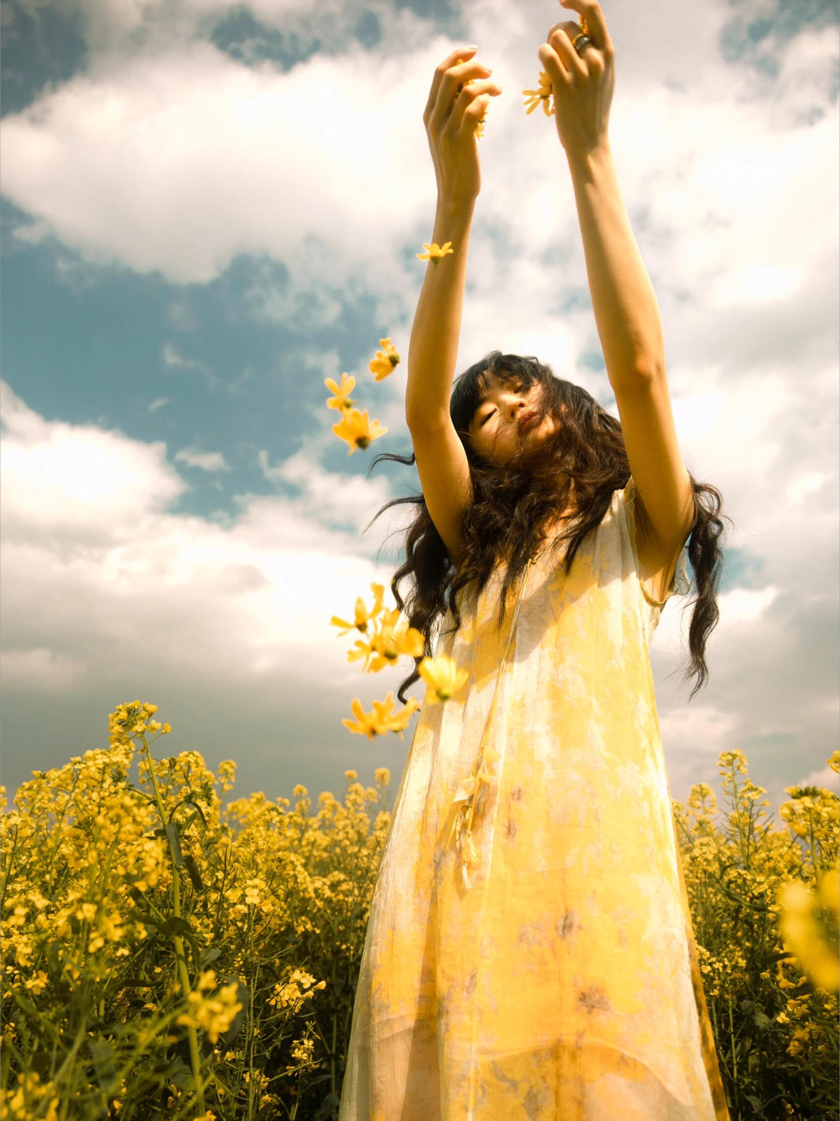 然后是姿态和互动,这是最容易出错的地方。油菜花田最忌讳僵硬摆拍,最好的状态,是让人物真正融入春天。不用刻意看镜头、不用强行笑,可以轻轻低头闻花香,让指尖自然拂过花穗;可以坐在田埂上,放松身体望向远方;也可以轻轻转身,让裙摆随风扬起,捕捉动态的瞬间。真正动人的照片,拍的不是姿势,而是情绪。松弛、自然、不刻意,就是我们想要的那种感觉。