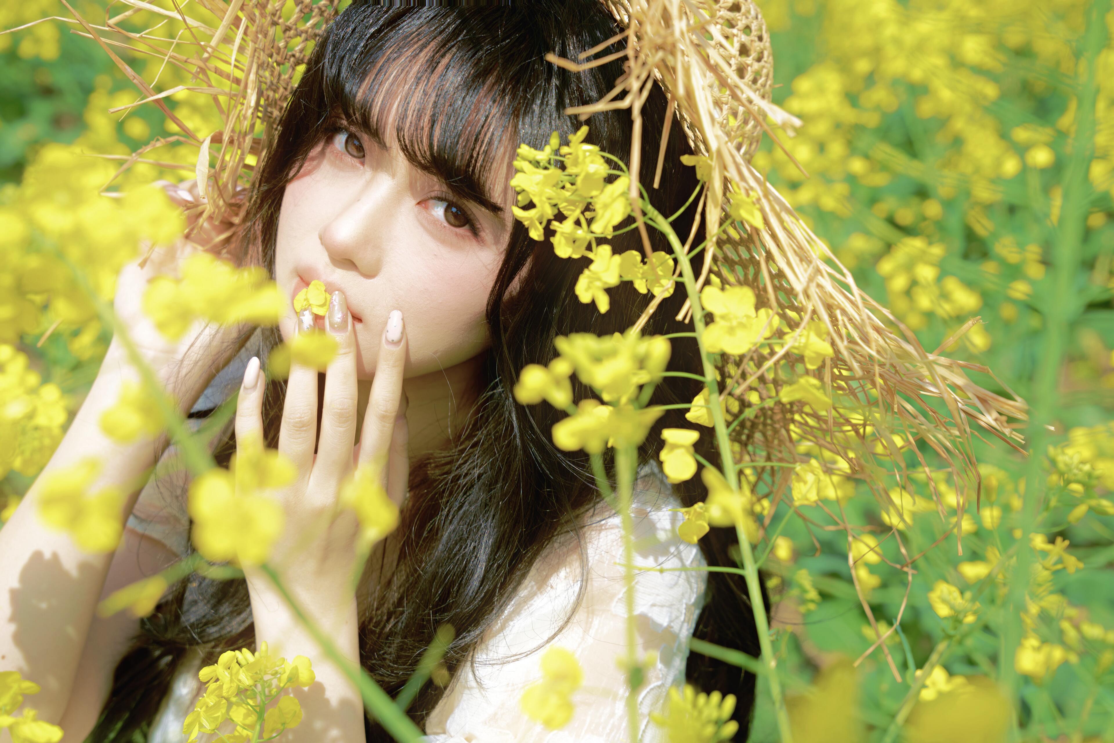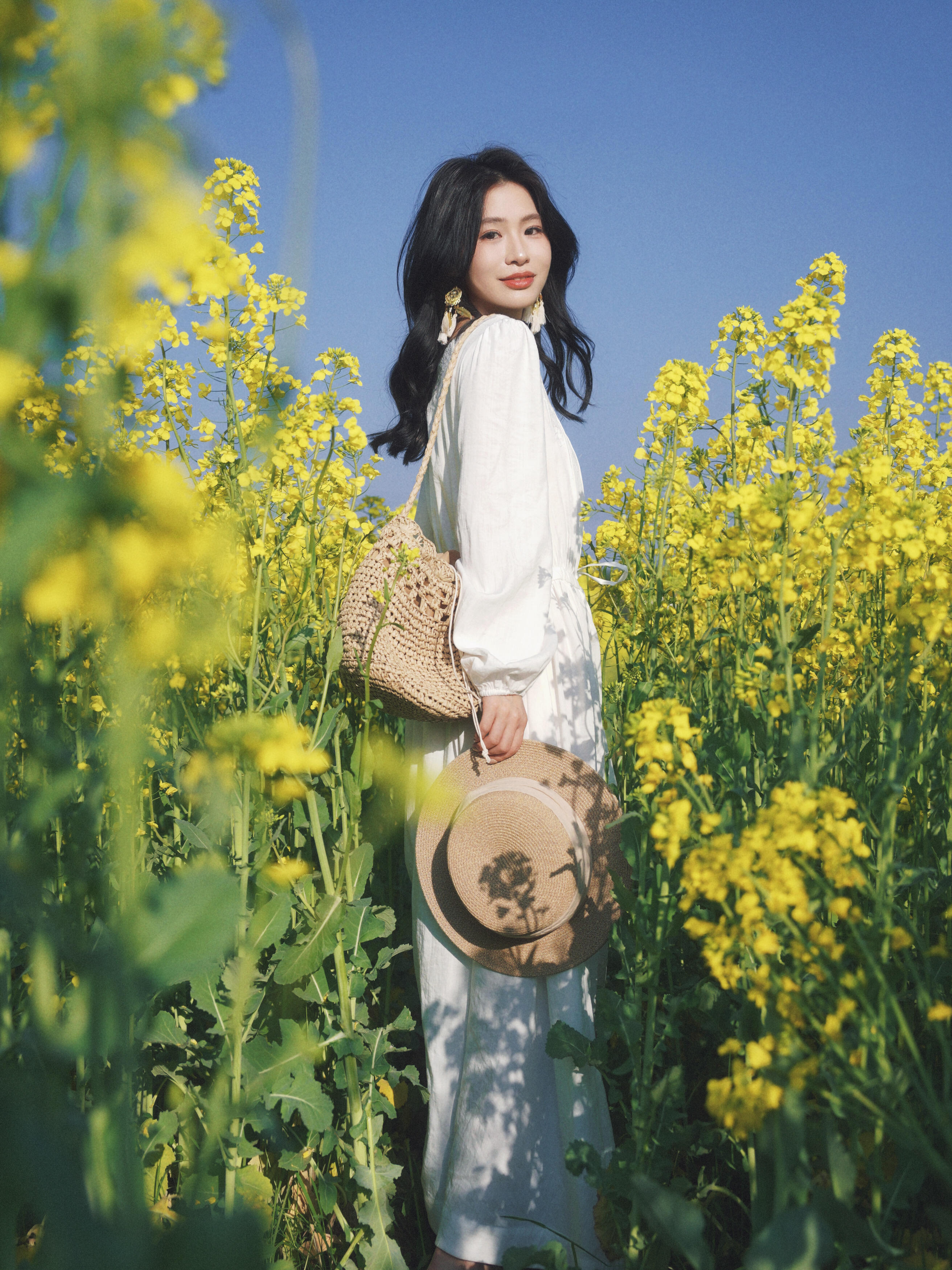 接下来是光线,这是油菜花人像的灵魂。油菜花本身颜色鲜艳,黄色是所有色彩中明度最高的,可以说,一碰到强光就容易过曝、发灰、刺眼、死白,拿到糊成一片的黄色。所以最适合拍摄的时间,是清晨日出后一小时,或是傍晚日落前两小时。这个时间段的光线柔和温暖,还有雨过天晴时的油菜花,曝光出来的饱和度自然,画面非常清新。逆光拍摄时,阳光会穿过花瓣,让油菜花变得半透明,也会在发丝边缘勾勒出一层金色轮廓光,氛围感直接拉满。如果只能白天拍摄,就选择阴天的漫射光,或是躲在花田边缘的阴影里,均匀柔和的光线,能让肤色更通透,也能让黄色更温润。光圈不要开得太大,想要浅景深的虚化效果,可以用长焦抓拍,或者是用35头靠近模特拍。前者适合空间层次丰富的花田,后者适合杂乱的环境,靠近后可以规避很多杂乱的背景入画。