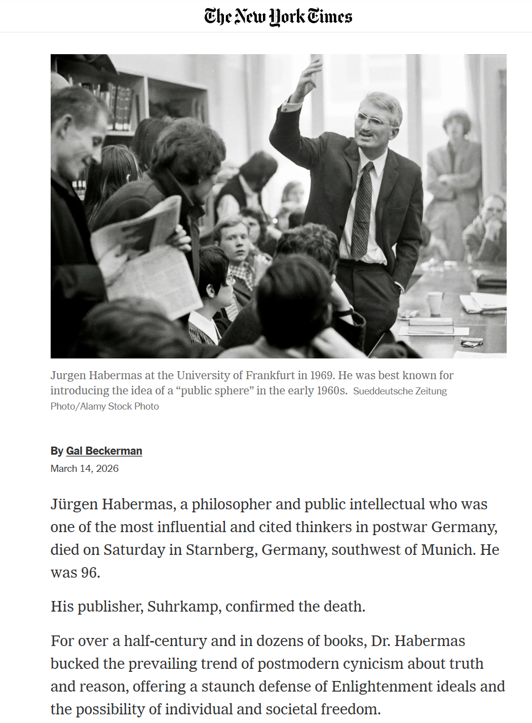 Jürgen Habermas——这位哲学家、公共知识分子,也是战后德国最具影响力、被引用最多的思想家之一,于周六在位于Starnberg施塔恩贝格(Munich西南部)的家中去世,享年96岁。📚