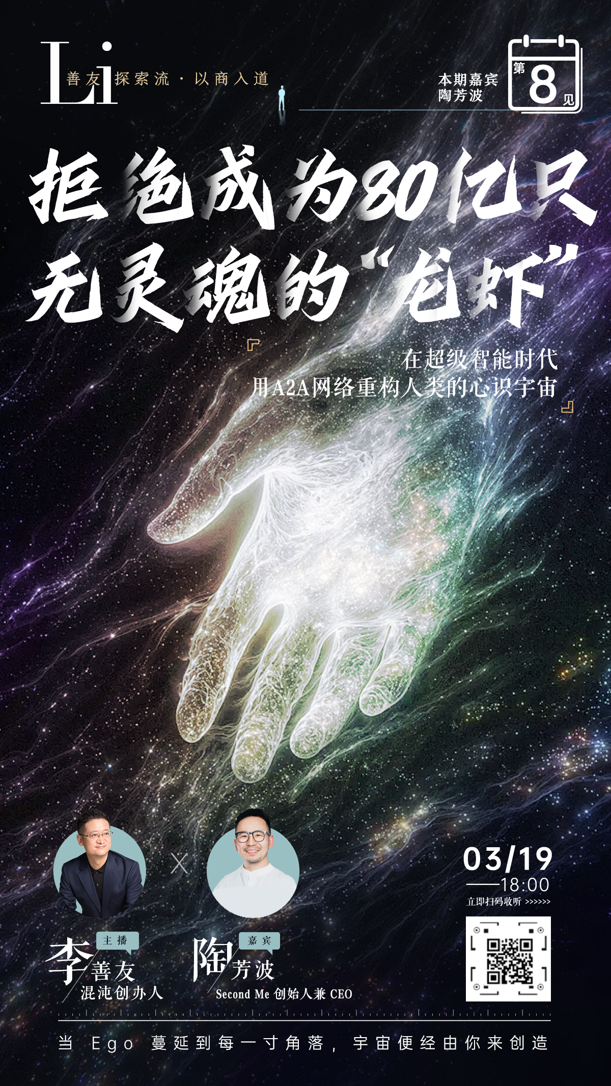 在陶芳波的“心识宇宙”构想中,人机交互的终局,绝不是制造 80 亿个只会执行任务、毫无灵魂的“数字龙虾”;而是为你打造一个意识延展的数字分身——“Second Me”。