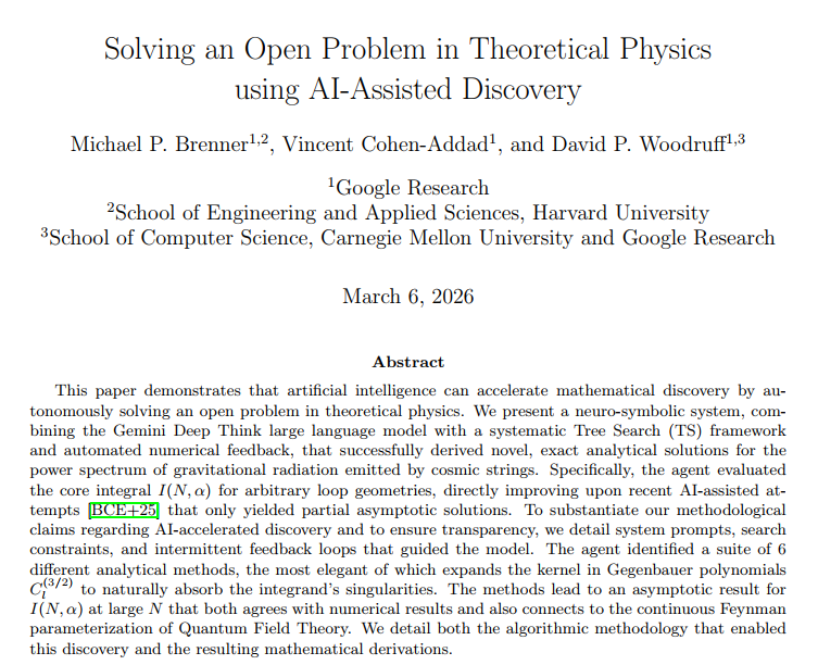 这份由 Google Research、哈佛大学和卡内基梅隆大学的研究人员于2026年3月发表的论文,详细介绍了如何利用人工智能(AI)加速数学发现,并成功解决了一个理论物理学中的开放性难题 。