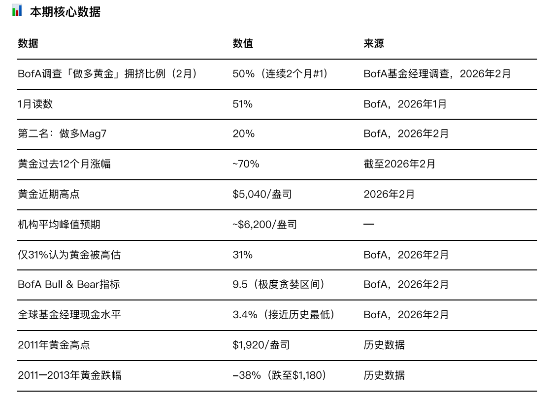 BofA每个月做一个全球基金经理调查。2026年1月,「做多黄金」成为#1最拥挤仓位,占比51%。2月,仍然是#1,读数50%,连续两个月。