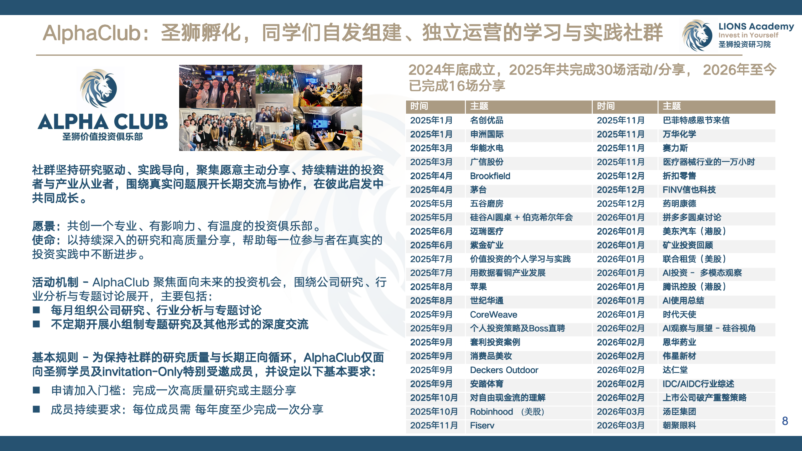 AlphaClub是由圣狮投资研习院孵化,《圣狮应用价值投资课》的同学们自发组建、独立运营的学习与实践社群,仅面向圣狮学员及特别受邀成员。旨在通持续深入的研究和高质量分享,帮助每一位参与者在真实的投资实践中不断进步。
