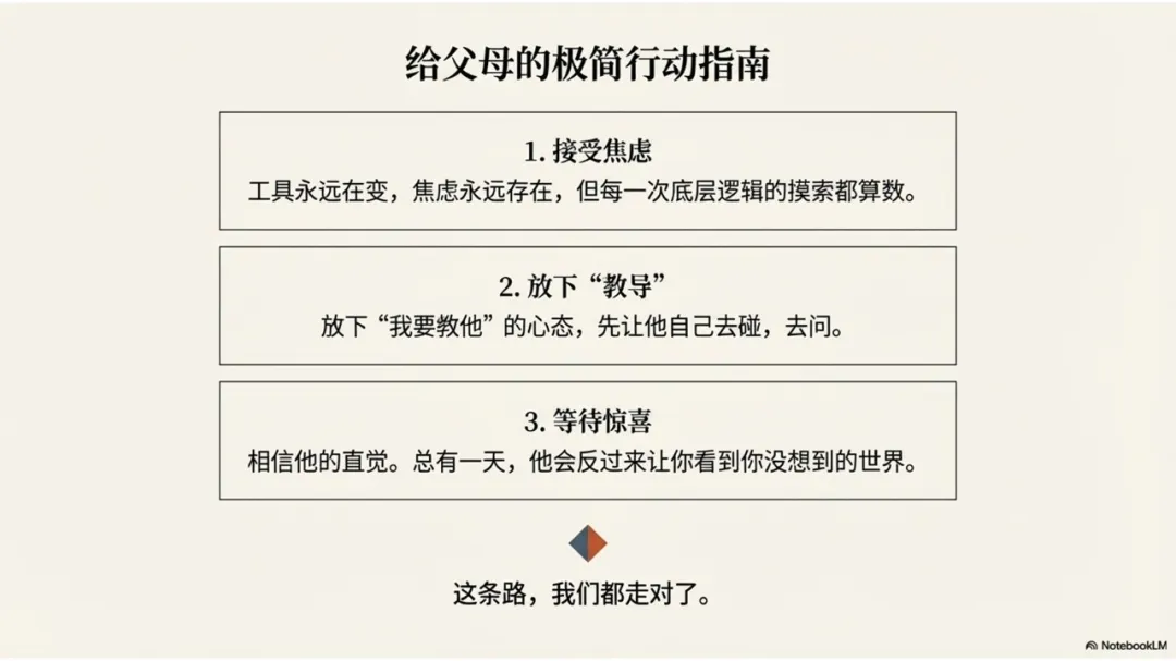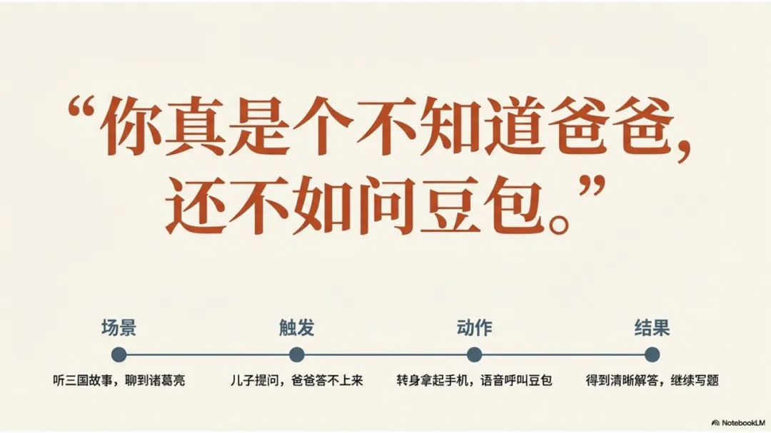 - 儿子已建立自己的判断尺,知道何时求助父亲,何时直接使用AI(如“豆包”)。