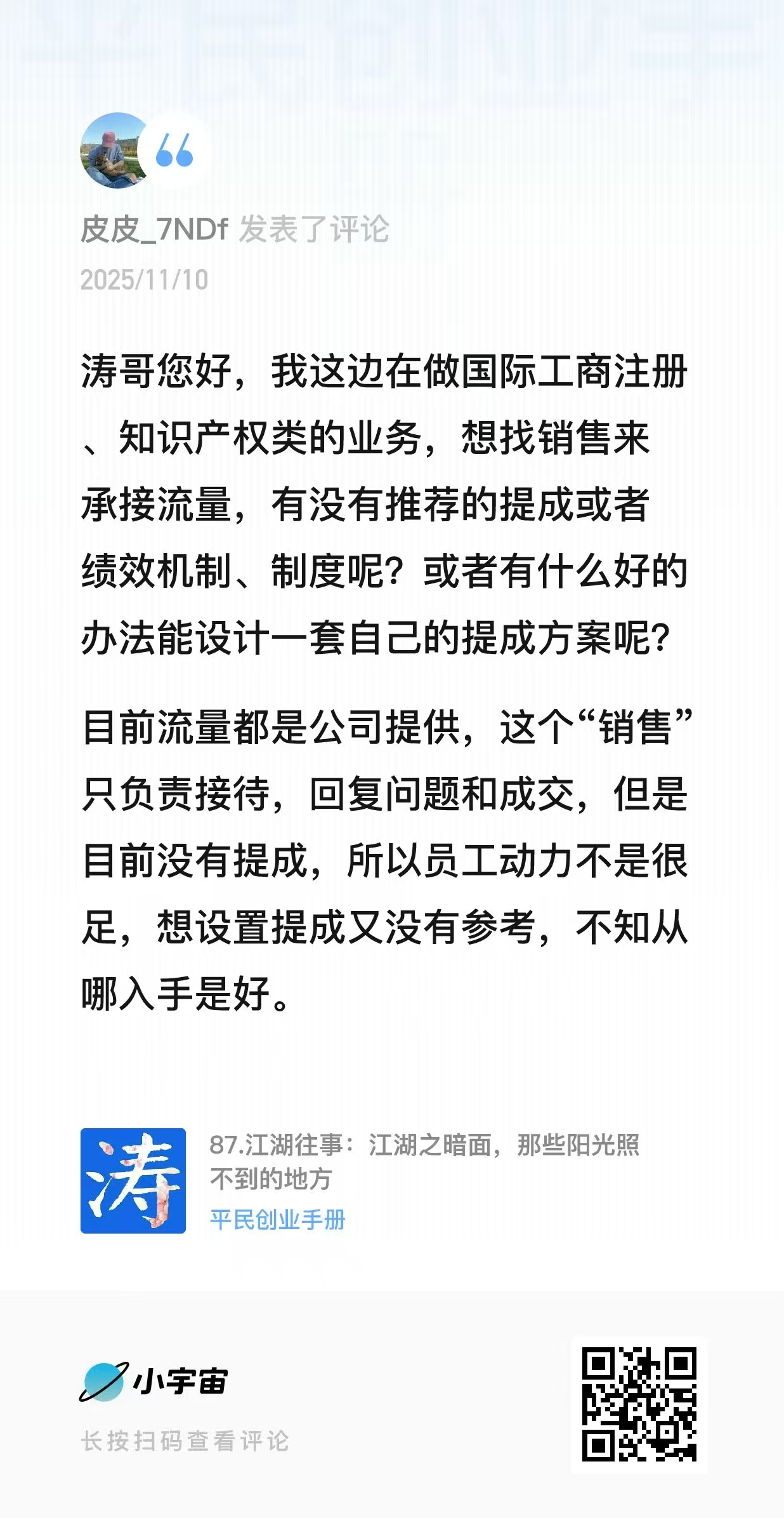 经常有朋友问我:涛哥,我在职场摸爬滚打 13 年了,现在想转型给职场女性做陪伴服务,这个方向到底能不能做?还有管理层发愁:手头有流量,但销售接待没动力,提成方案到底该怎么定,才能让团队有激情冲业绩?