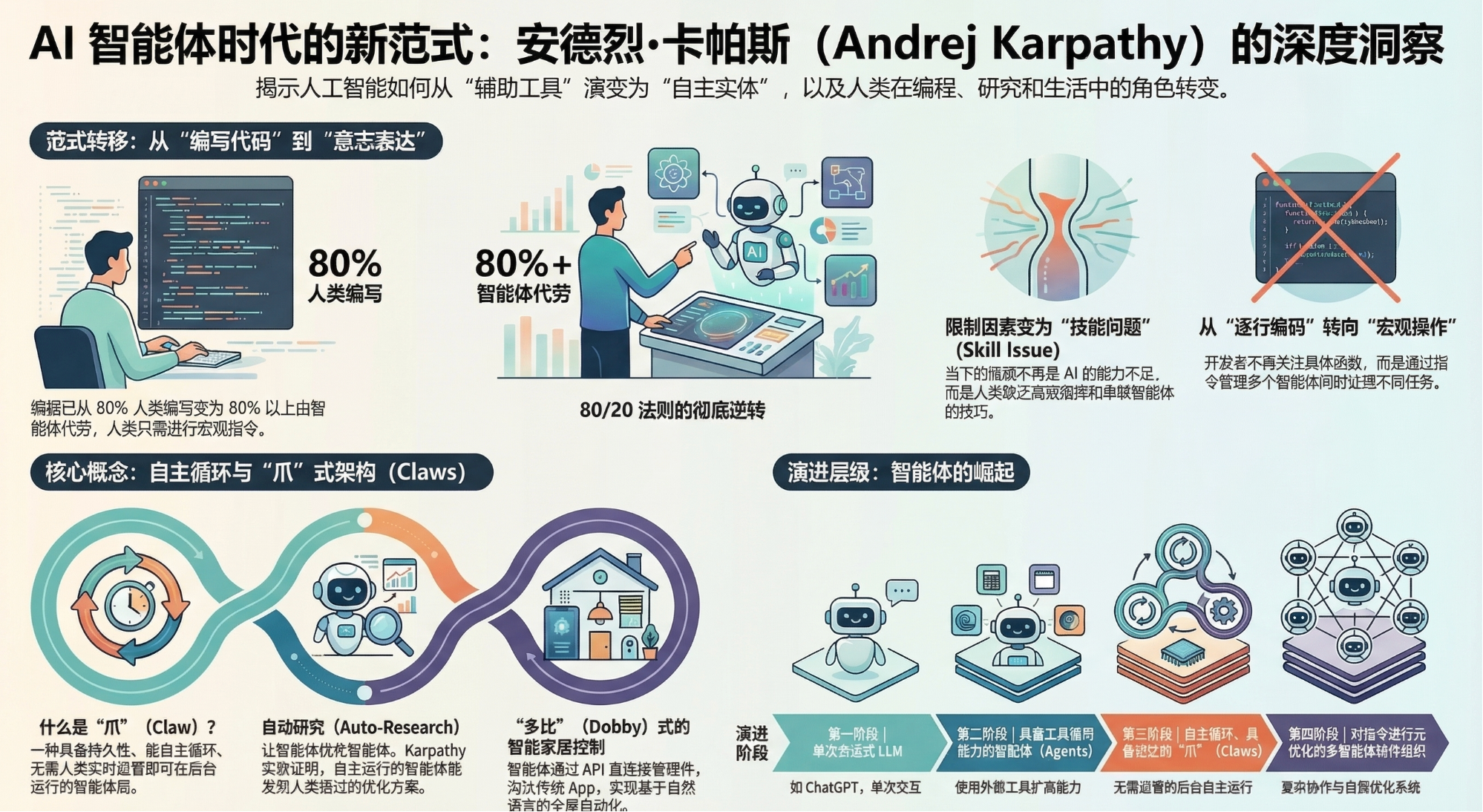 * 00:00 智能体驱动的编码:Andrej Karpathy分享了他个人编程工作流的剧变,透露自去年十二月起,他编写代码的模式已从八成自己写颠倒为八成代理写,甚至“一行代码都没亲自敲过”。他将这种状态形容为“AI痴狂状态”,并强调个人能力获得了巨大解锁,瓶颈从算力(flops)变成了“你自己的token吞吐量”。