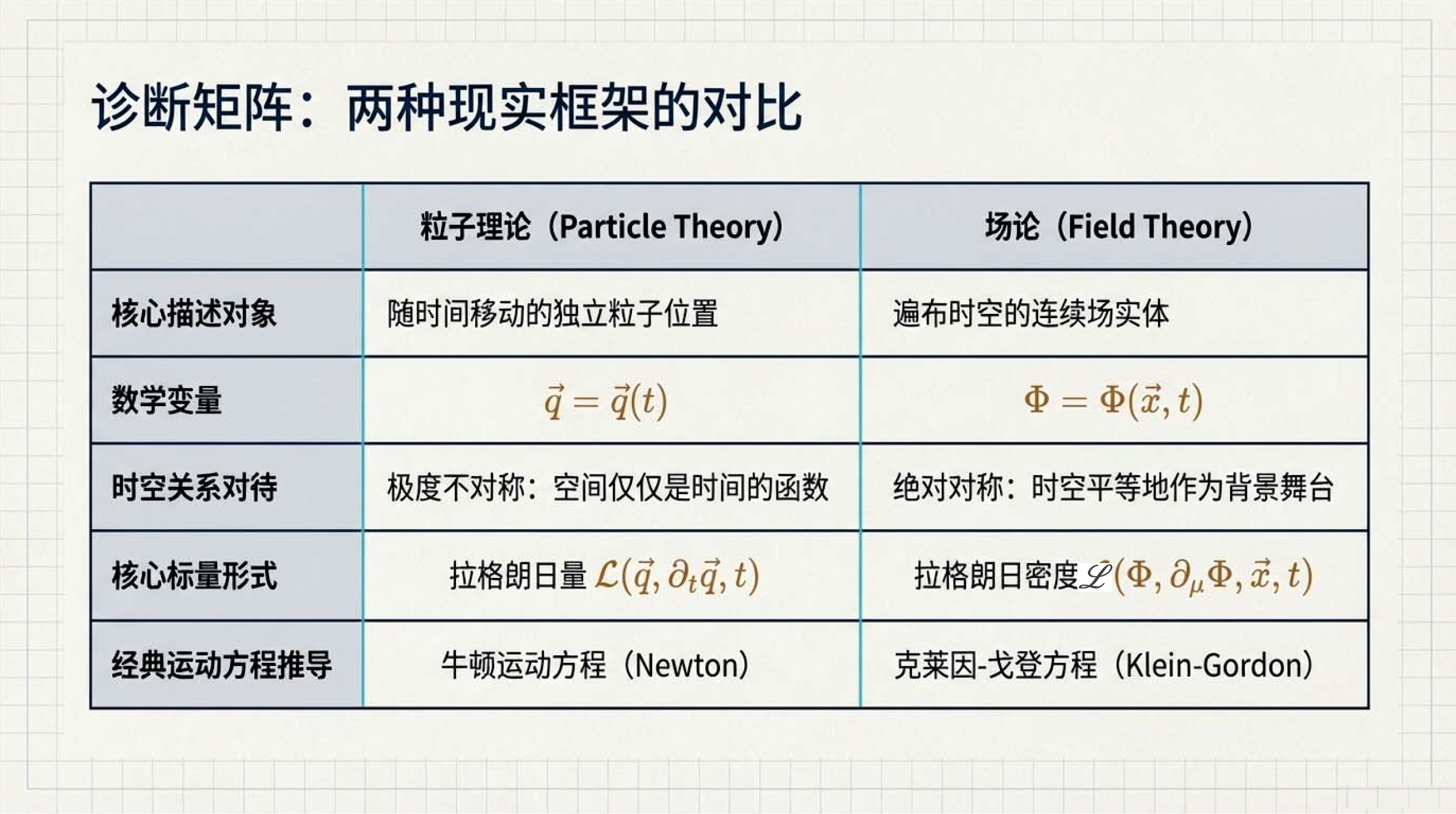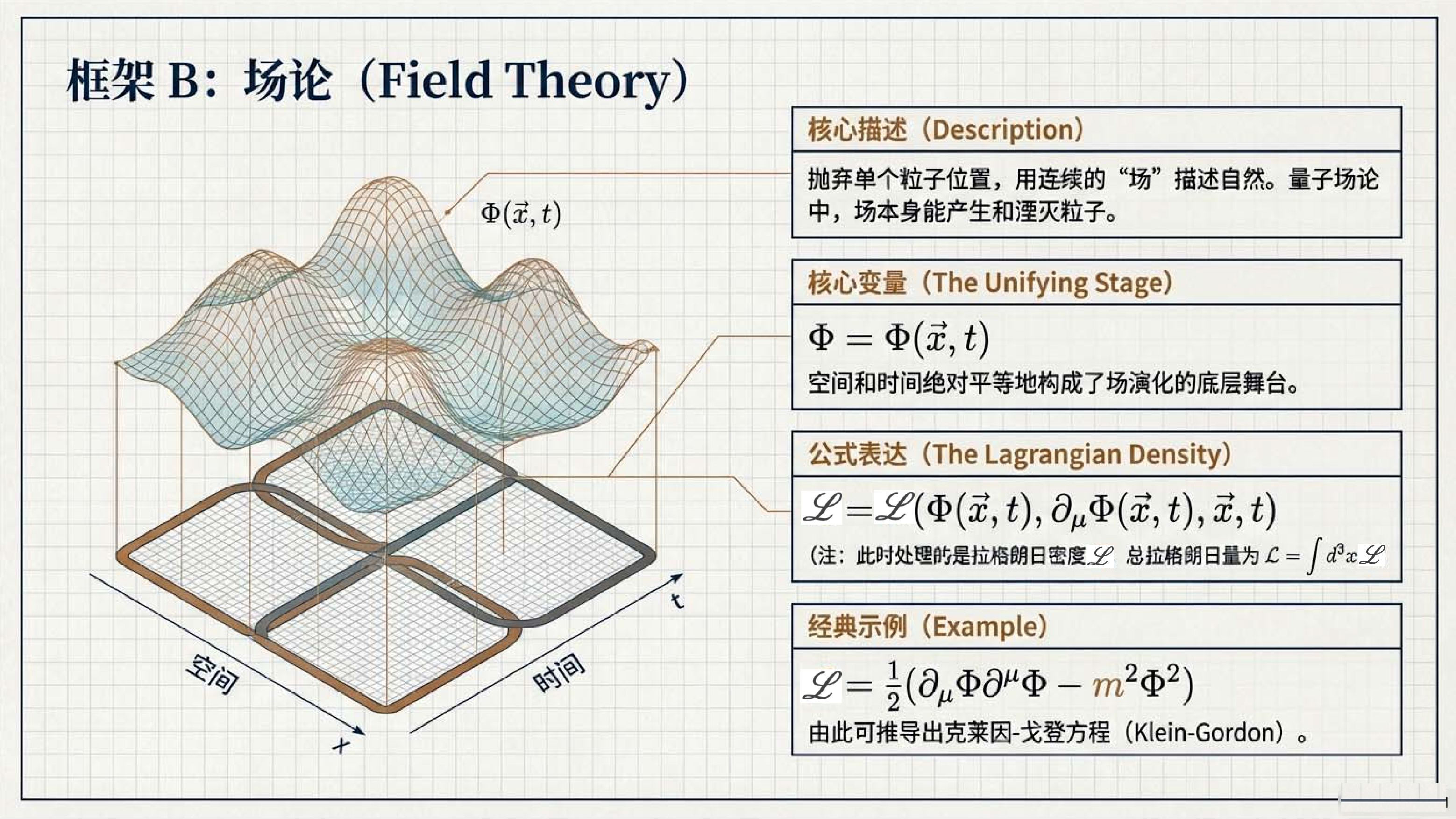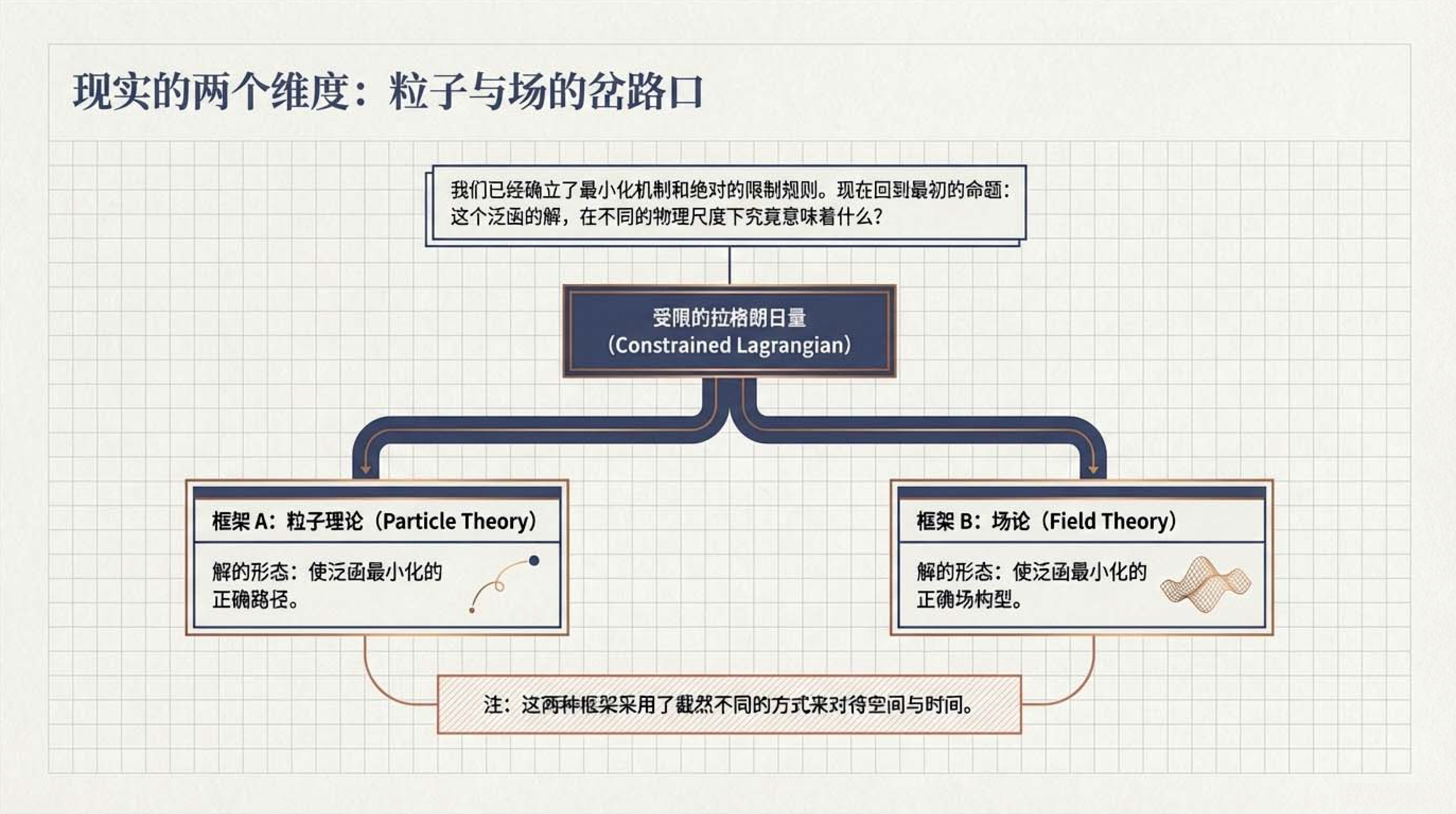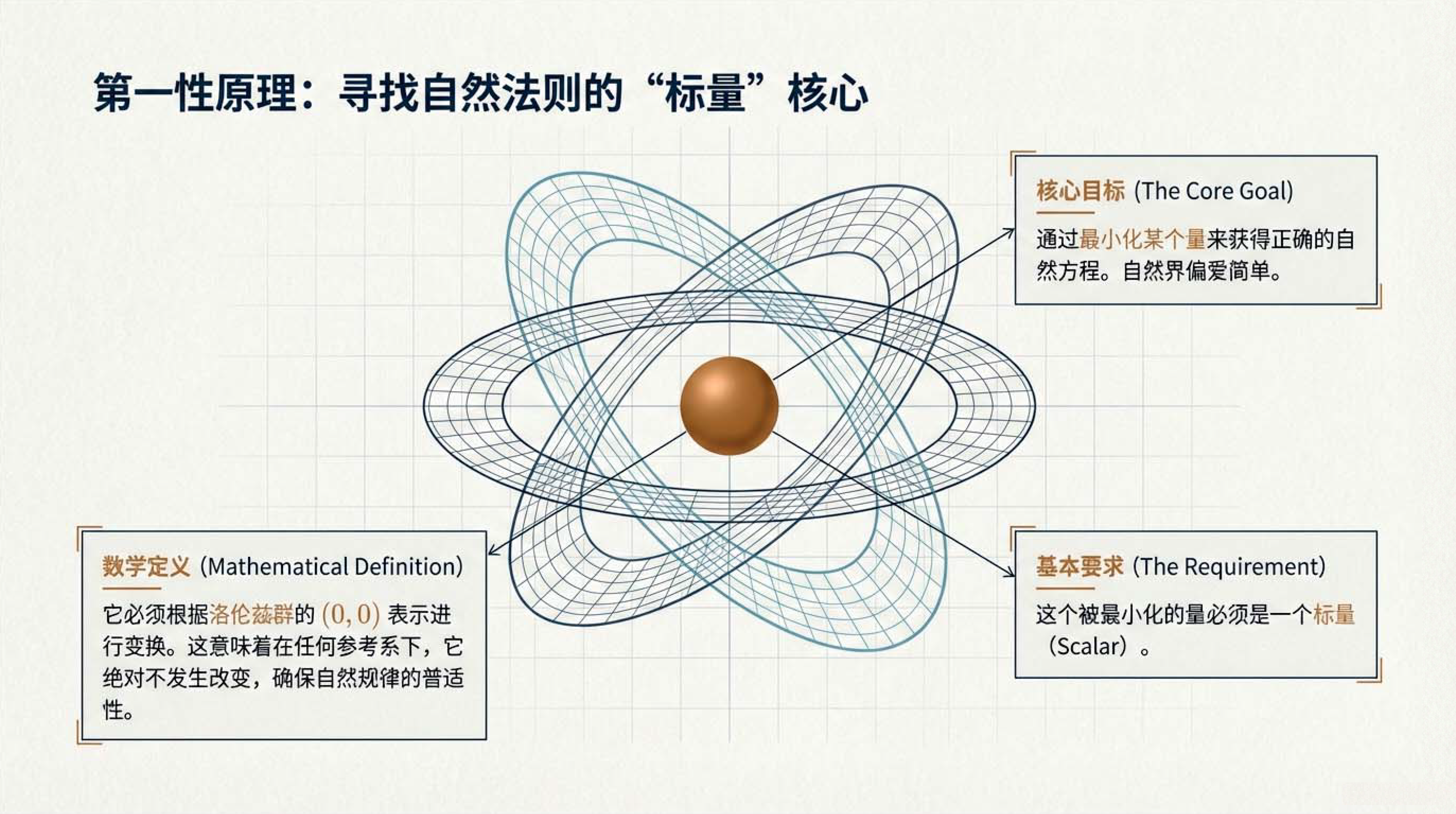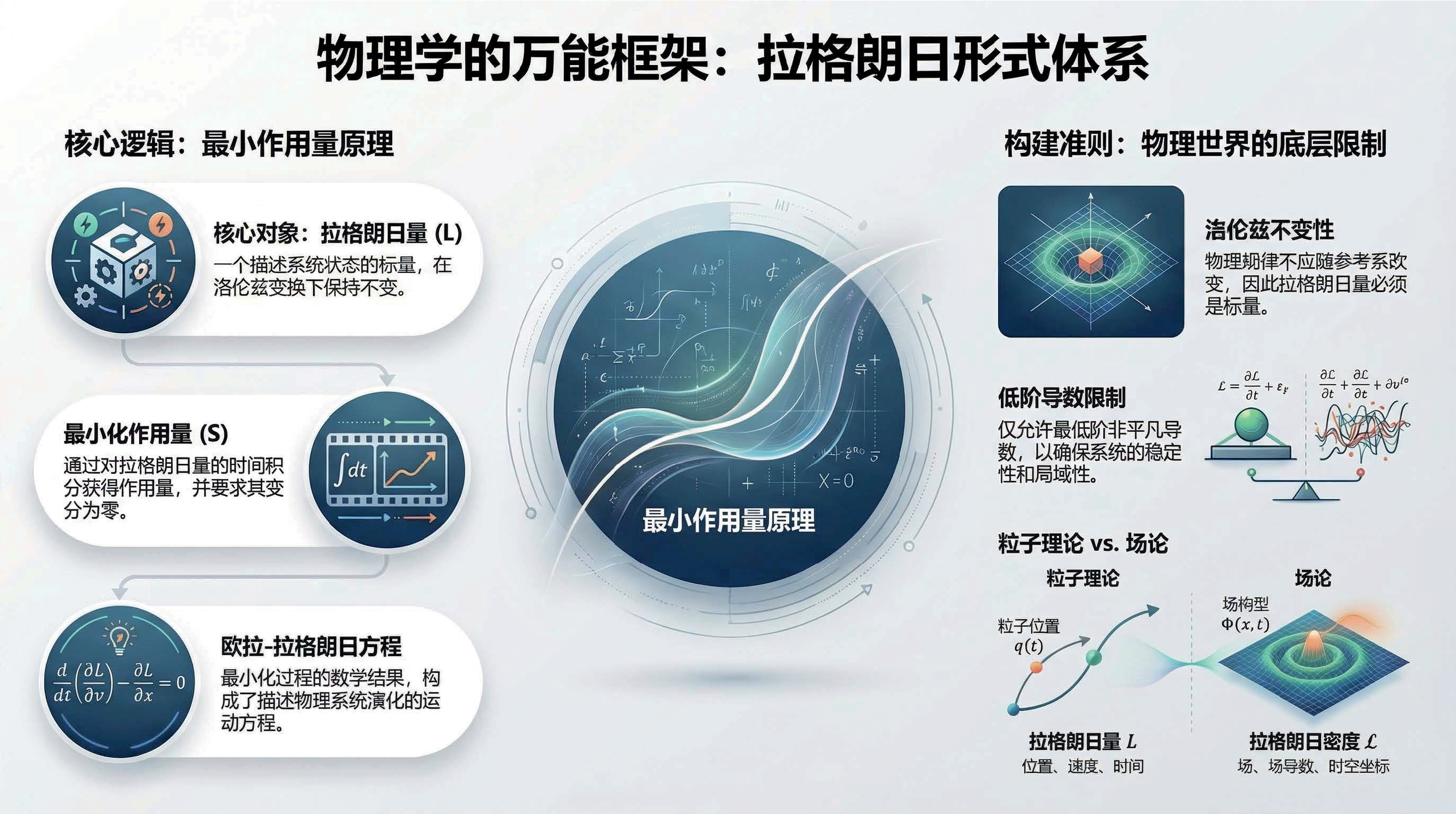 本课介绍了物理学中核心的拉格朗日形式体系,其基本逻辑是通过最小化作用量(即拉格朗日量随时间的积分)来导出描述自然规律的运动方程。为了确保物理定律在不同参考系下的一致性,该体系的核心对象必须是一个在洛伦兹变换下保持不变的标量,并遵循自然界偏爱简单的原则。此外,文中还明确了构建该理论时在导数阶数与场阶数上的限制条件,并对比了描述单个物体运动的粒子理论与平等对待空间和时间的场论之间的差异。