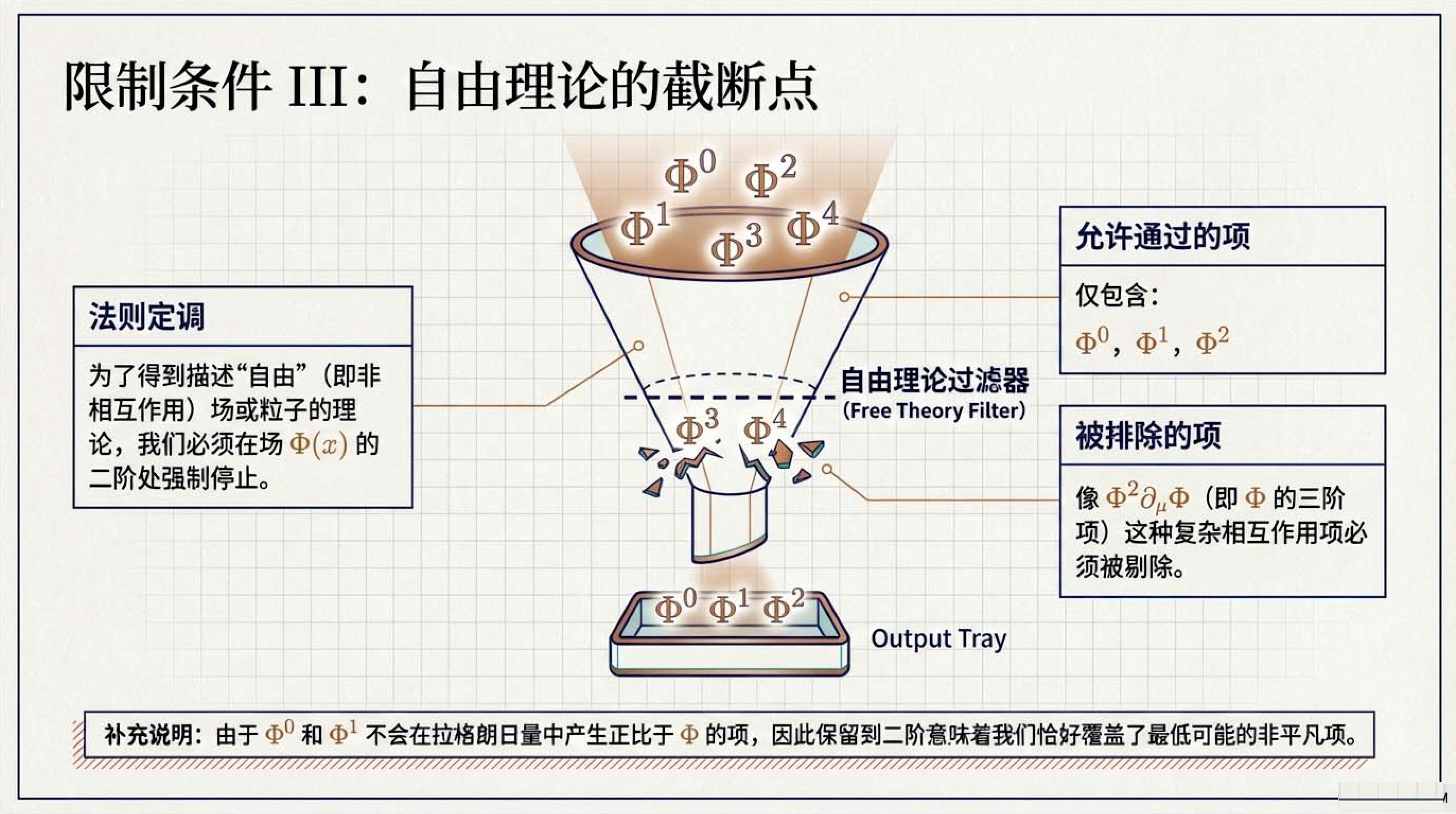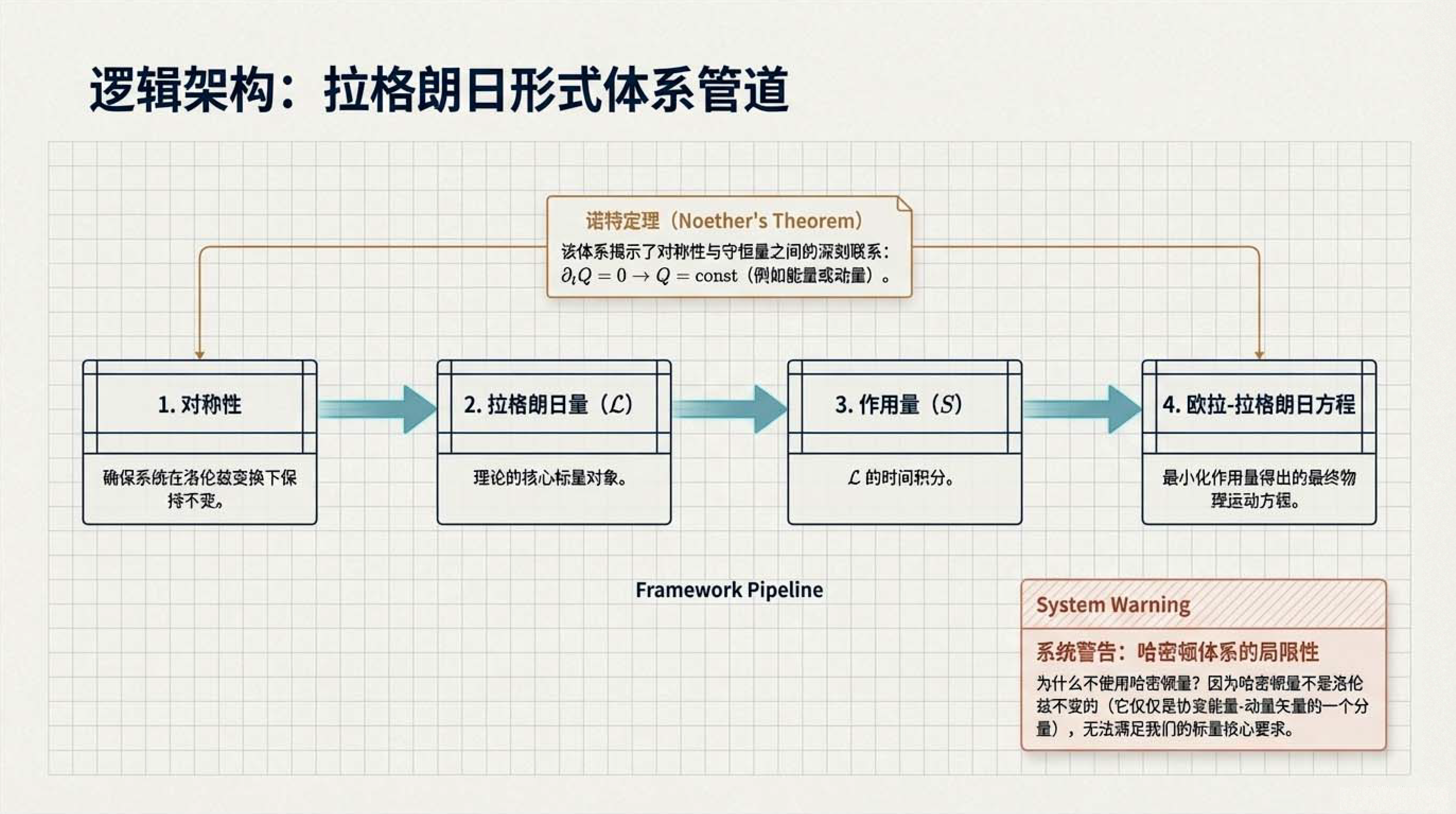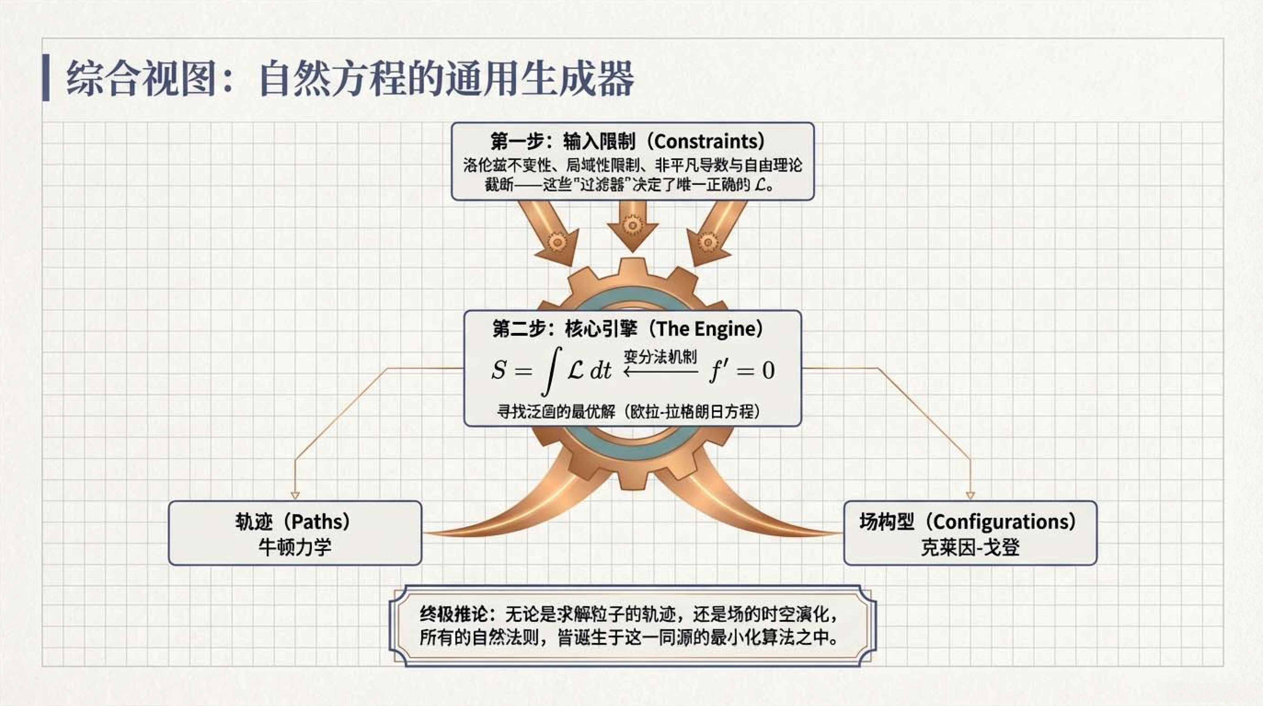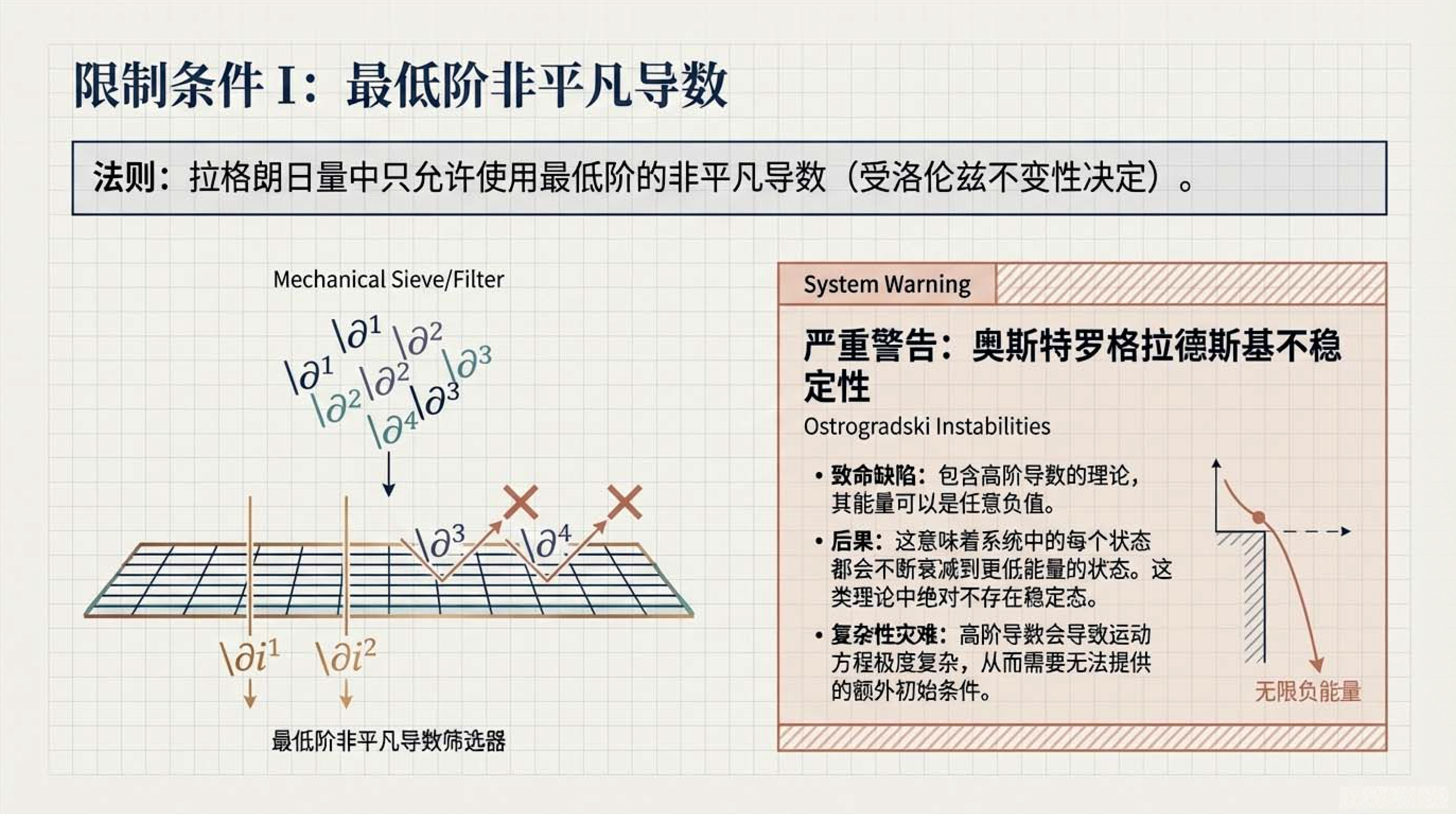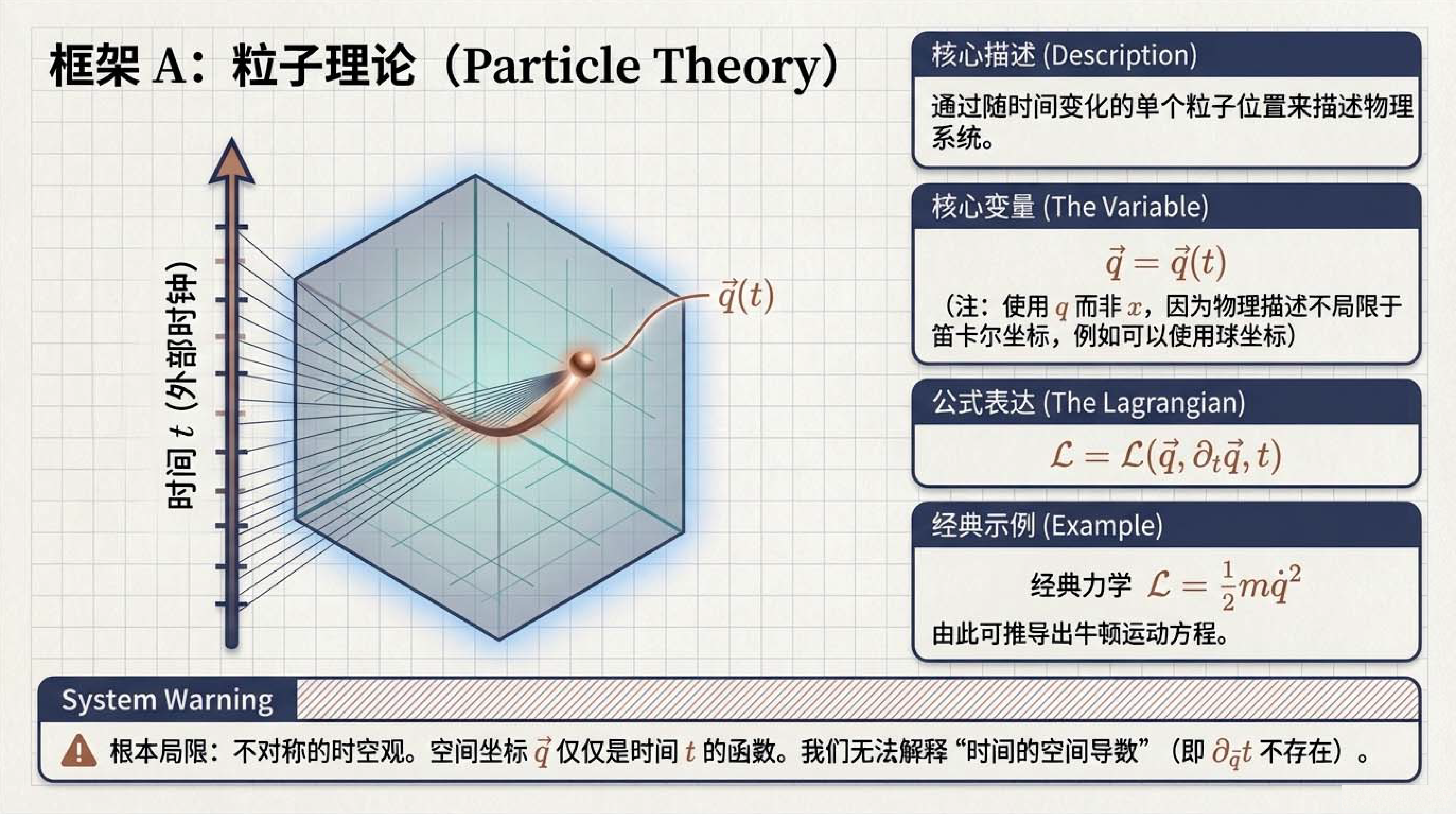 本课介绍了物理学中核心的拉格朗日形式体系,其基本逻辑是通过最小化作用量(即拉格朗日量随时间的积分)来导出描述自然规律的运动方程。为了确保物理定律在不同参考系下的一致性,该体系的核心对象必须是一个在洛伦兹变换下保持不变的标量,并遵循自然界偏爱简单的原则。此外,文中还明确了构建该理论时在导数阶数与场阶数上的限制条件,并对比了描述单个物体运动的粒子理论与平等对待空间和时间的场论之间的差异。