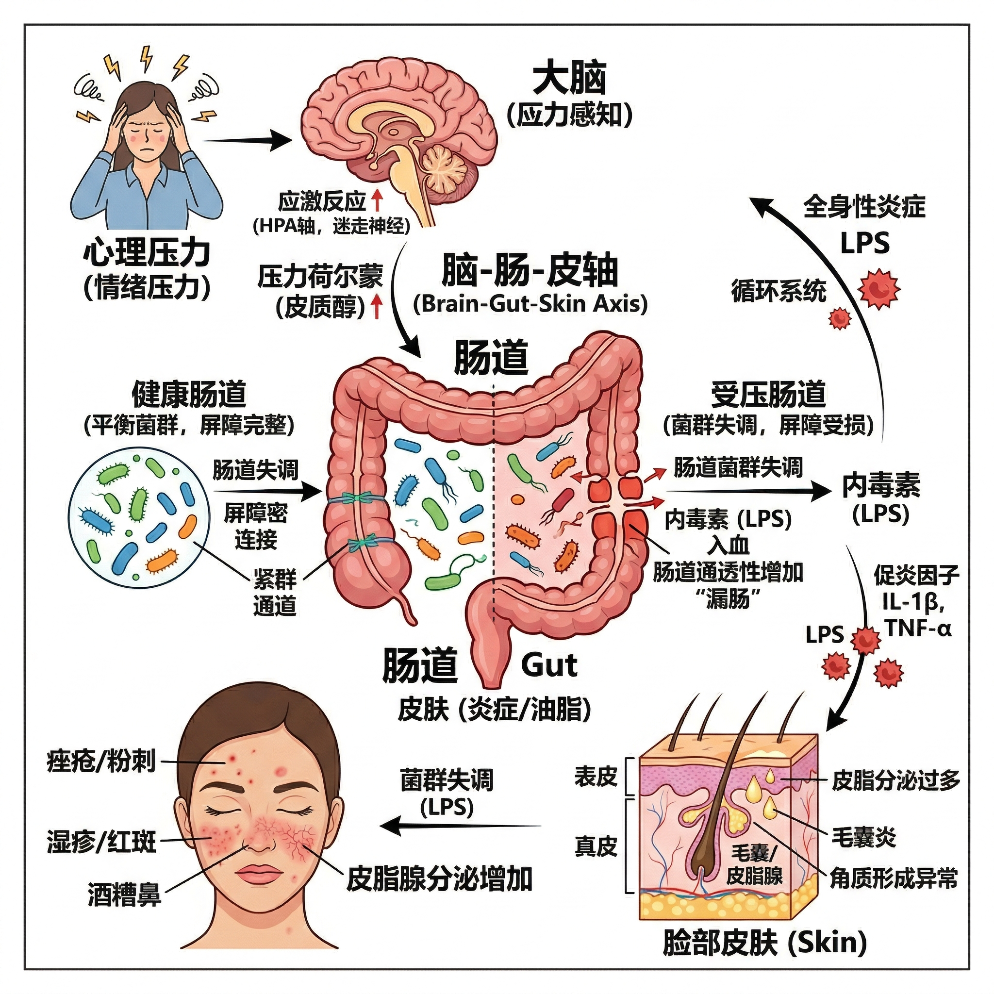 说明“脑-肠-皮轴”:压力→大脑激活应激反应→皮质醇升高→肠道菌群失衡、屏障受损(漏肠)→内毒素入血引发全身炎症→刺激皮脂分泌、角化异常和毛囊炎,最终表现为痤疮、红斑、玫瑰痤疮等问题。所以皮肤不仅是表面问题,需同步管理压力、作息和饮食。
