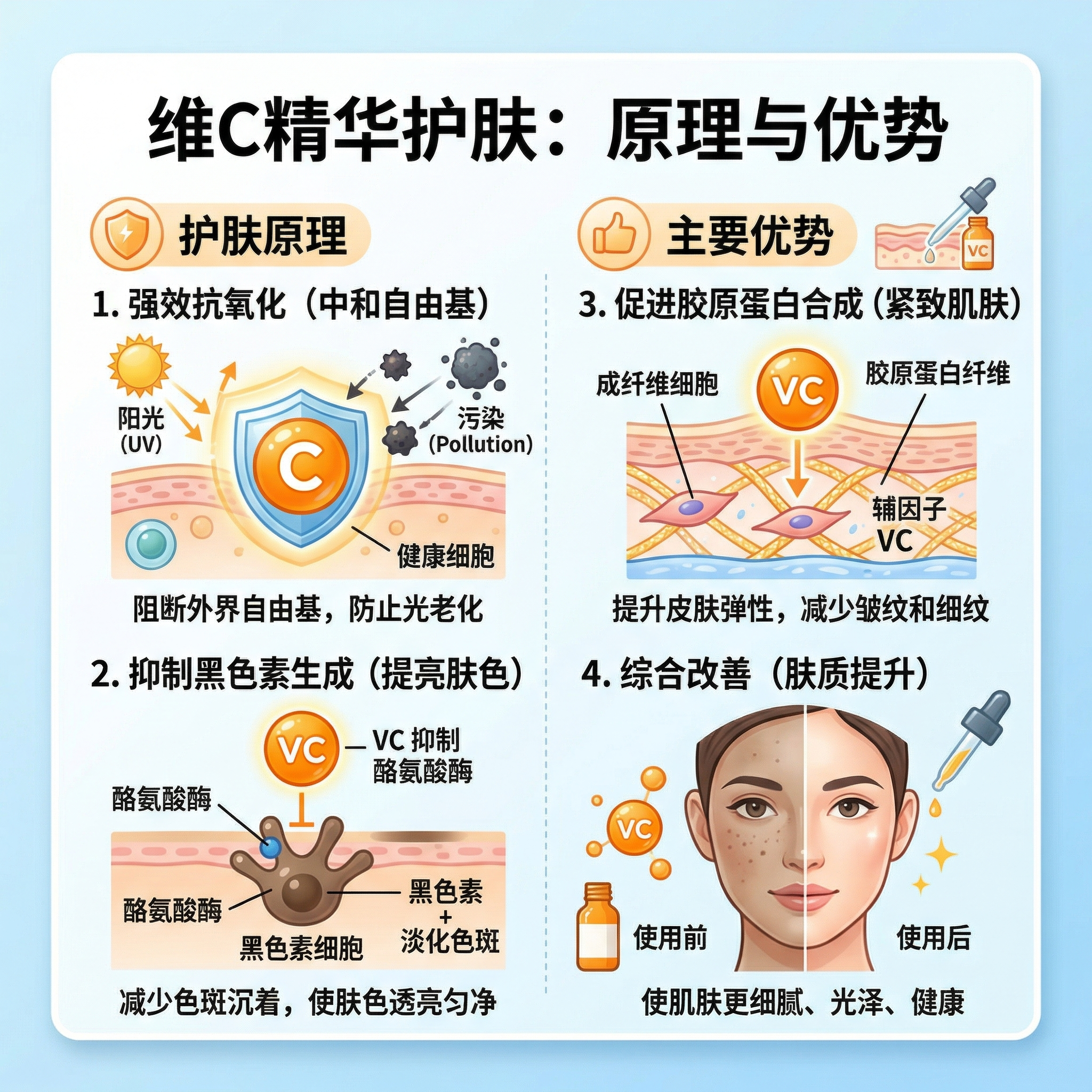 维C的三大核心价值:抗氧化、抑黑、促胶原。它可以中和自由基,减少光老化;抑制酪氨酸酶,淡化色沉;同时促进胶原生成,改善细纹与弹性。维C不是即时变白,而是长期改善肤质的基础型投资产品。