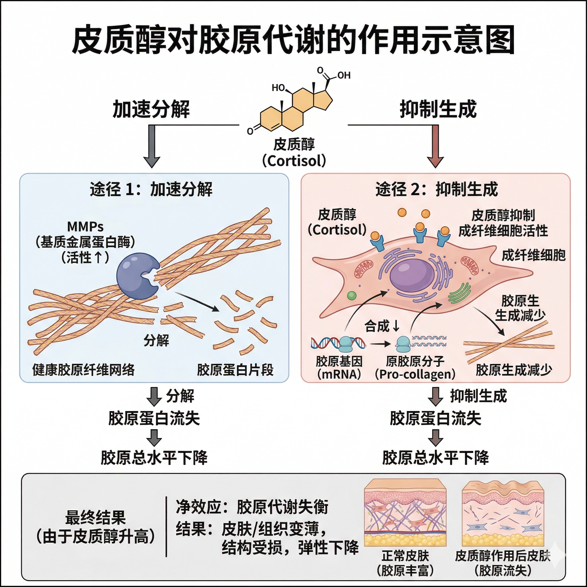 - 05:37 - 核心机制①:皮质醇如何同时“加速分解 + 抑制生成”胶原?