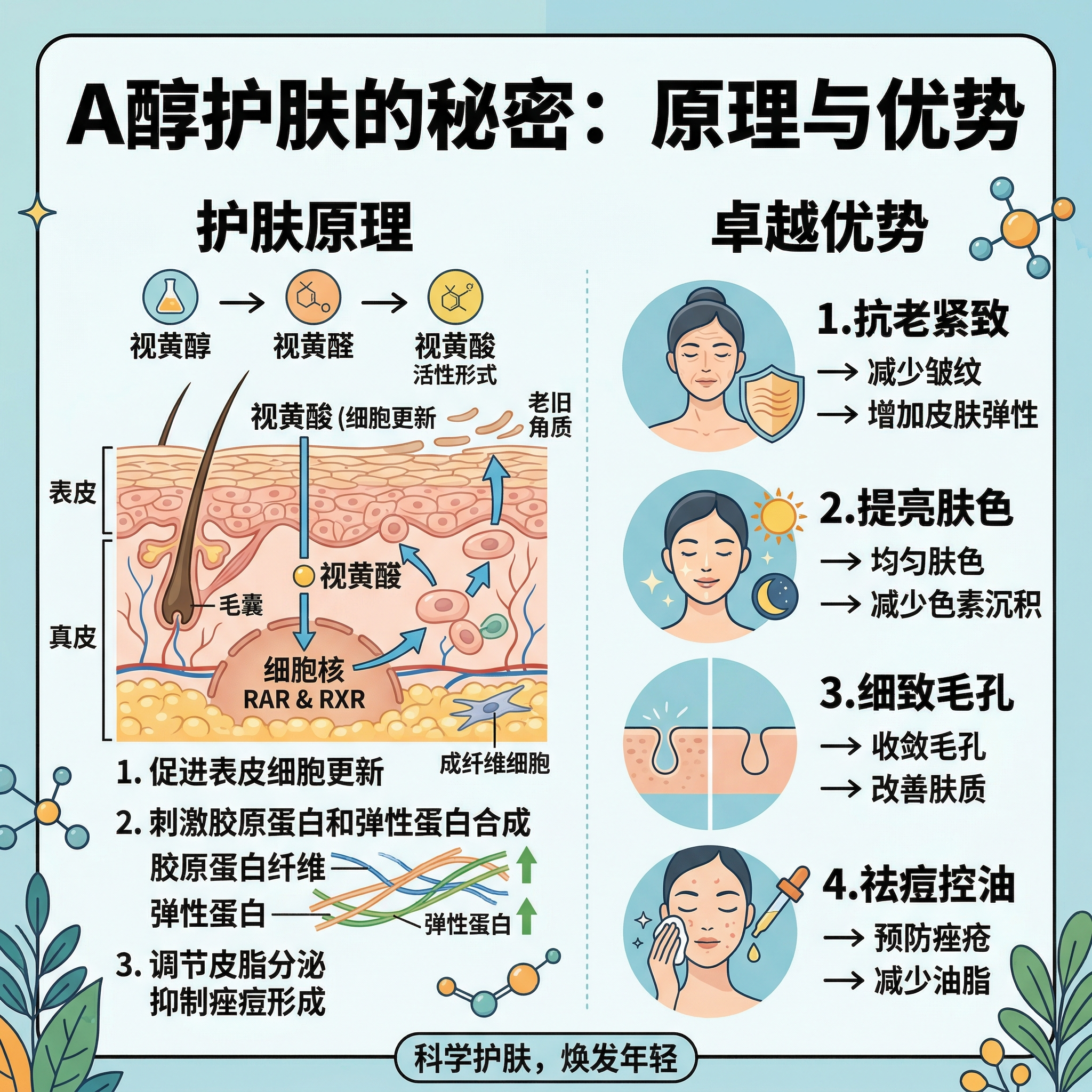 A醇的核心逻辑:通过转化为视黄酸,作用于RAR/RXR受体,促进表皮更新、刺激胶原生成并调节皮脂分泌,从源头改善痘痘与老化。临床效果体现在:抗老紧致、提亮肤色、细致毛孔、控油祛痘。A醇是“重建皮肤秩序”的核心成分,但需低浓度起步、逐步建立耐受,并配合保湿与防晒,避免刺激反应。