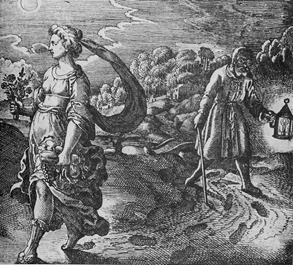 寓意画“追寻自然的足迹”,寄语为“追求知识与真理的人,戴上眼镜、执起松明,拄着你的拐杖,去追寻自然的足迹吧。”原载米哈伊尔·梅耶于1618年出版的《亚塔兰忒之逃逸》。这本书中录有五十幅精美的铜版画,配以诗歌,借用古希腊神祇与英雄的故事来阐述炼金术的理论与实验现象。这幅版画中的女神手执花草谷物,代表了自然的奥秘与古典知识,而炼金术士的眼镜、灯火和拐杖则代表实验与理论的实践。“追寻自然的足迹”象征着通过科学的实验手段去追求自然的秘密与术士自身的精神升华。