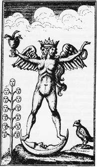 两性共有的原初之人(被称作安多金或亚当卡蒙),炼金作业之大成、化学(赫尔墨斯式)联姻的和谐、两仪调和的象征。版画摘自《哲学的漩涡》,为早期拉丁文炼金术文献之一,来源已不可考,内容为对多位早期希腊哲人理论的炼金术视角解说。这幅寓意画原载于1750年德国出版的一个珍本。