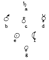 此为七艘舟船启航时的位置。船上的乘客、旗帜和物品分别代表占星术和炼金术中的七大行星,以及与之对应的七种化学元素。这种隐喻是炼金术手稿中常见的配方标注法。其中:a=土星=铅、b=火星=铁、c=木星=锡、d=水星=水银、e=太阳=金、f=月亮=银、g=金星=铜。