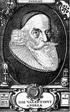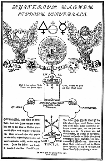 黄金蔷薇与黄金十字护符,摘自《蔷薇十字团的秘密象征》。传说这枚护符曾被每一位蔷薇十字团员佩戴在胸前,它是用灵性的黄金打造的,因此肉眼无法看见——这是炼金术中常见的比喻,以贵金属比喻智慧与灵性。版画顶端和十字架左右两端绘有代表盐、硫磺和水银的符号,十字架低端绘有七大行星与对应的七大元素符号。十字架四端的单词分别为“信仰”、“希望”、“爱”与“忍耐”。双头的不死鸟代表了两仪调和,亦即:人的肉体就是精神炼金术的实验室,将贱金属转化为贵金属的过程,就是从无知到睿智理性的升华。