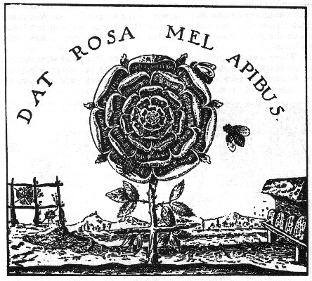 罗伯特·弗拉德为蔷薇十字团所作辩护文集《至高之善》(1629)第四卷扉页所载蔷薇与十字的寓意画。图上字样意为“蔷薇哺育蜜蜂”。