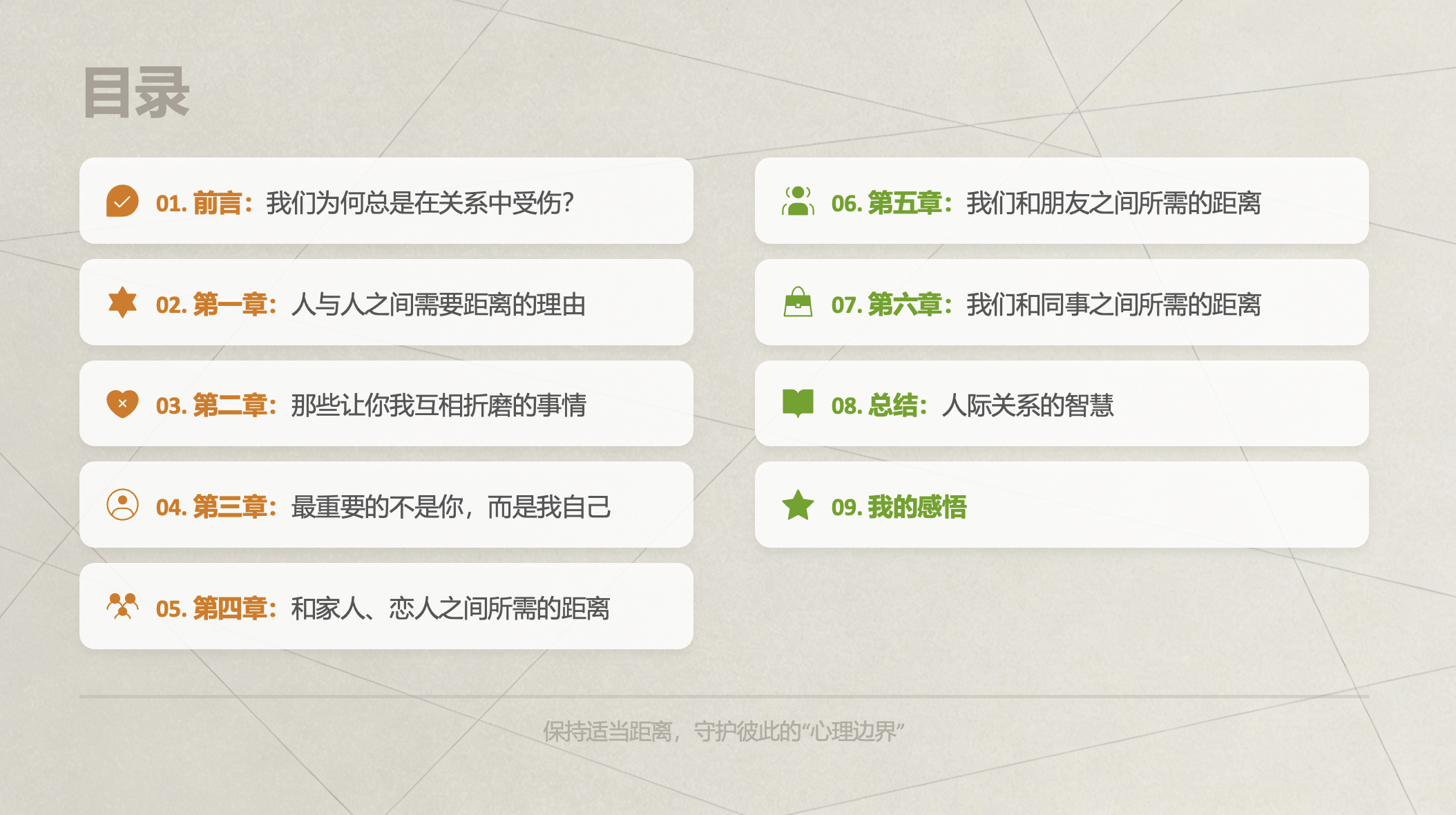 大家好,今天我想和大家分享一本关于人际关系的好书——《好的关系,需要刚刚好的距离》。这本书的作者是韩国知名的精神分析专家金惠男,她用自己的专业知识和人生经验,为我们揭示了处理各种人际关系的智慧。希望通过这次分享,能给大家带来一些启发。本次分享将分为九个部分,从引言开始,逐步深入探讨书中关于不同人际关系中“距离”的观点,最后分享我的一些个人感悟。希望能帮助大家更好地理解这本书的核心思想。
