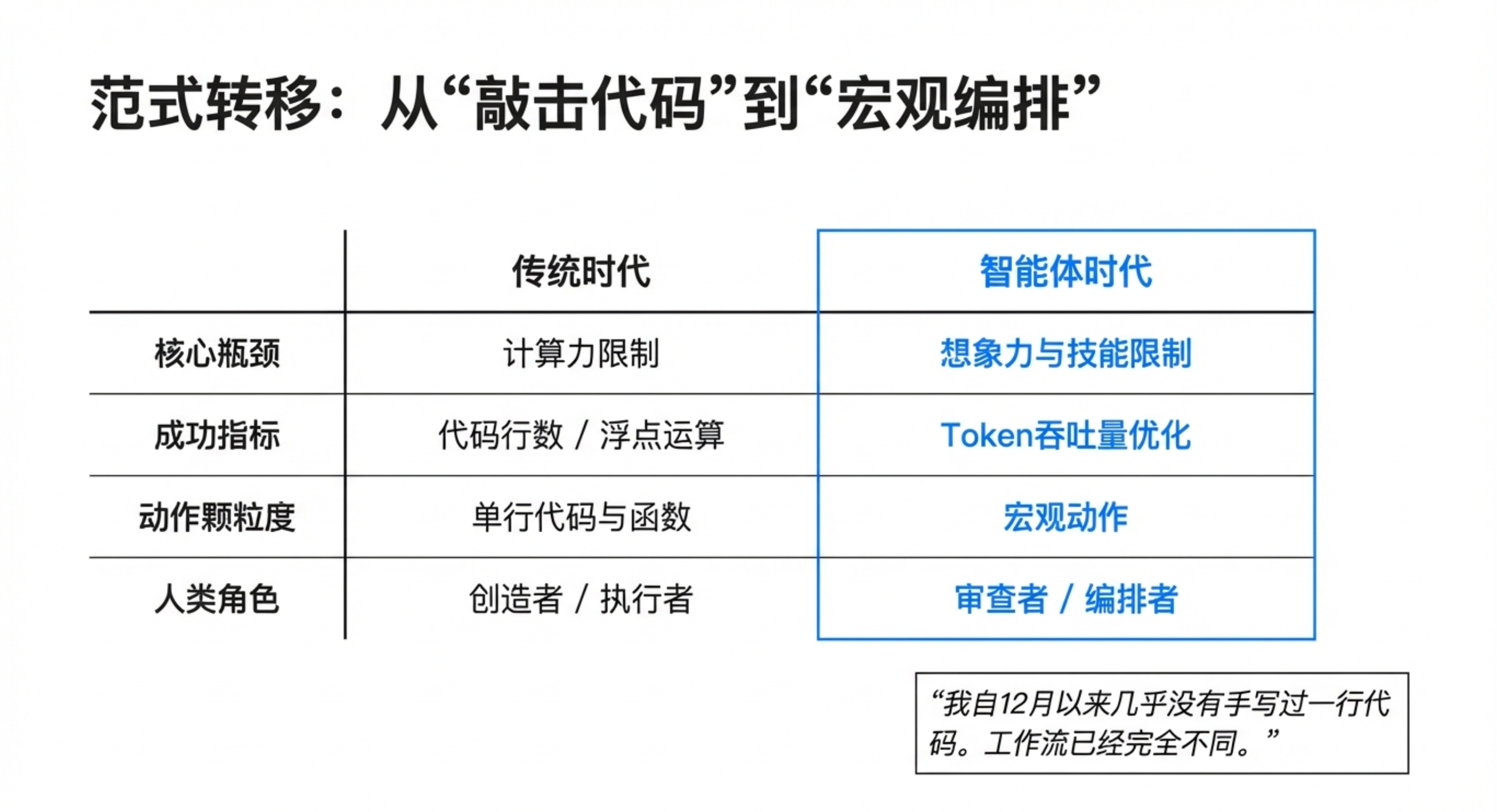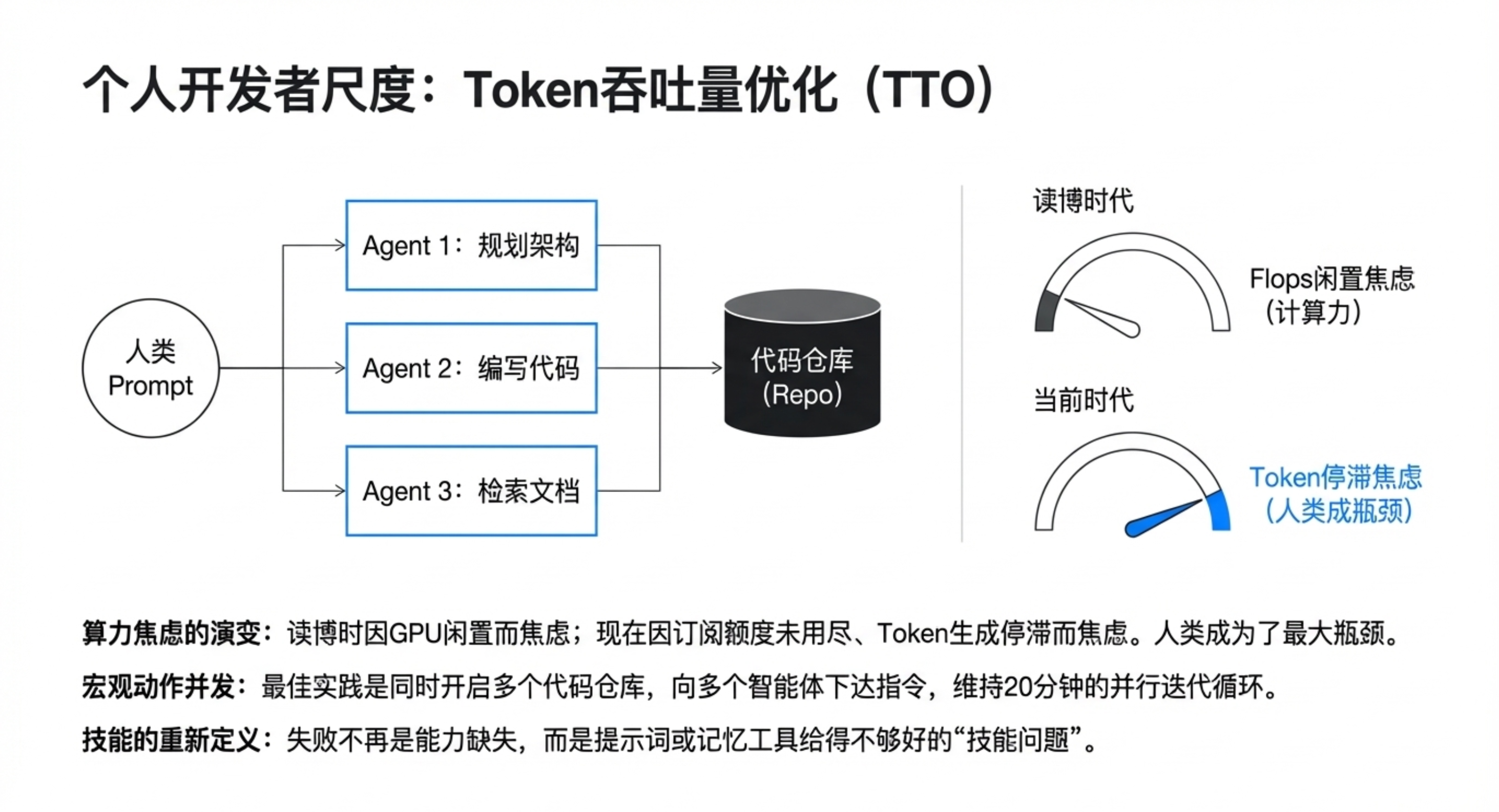 - 新瓶颈:生产力不再受限于打字速度或算力,而是 Token 吞吐量和人类下达指令的能力。他说:“现在的瓶颈是我能多快地把想法转化成提示,而不是我能多快写出代码。”