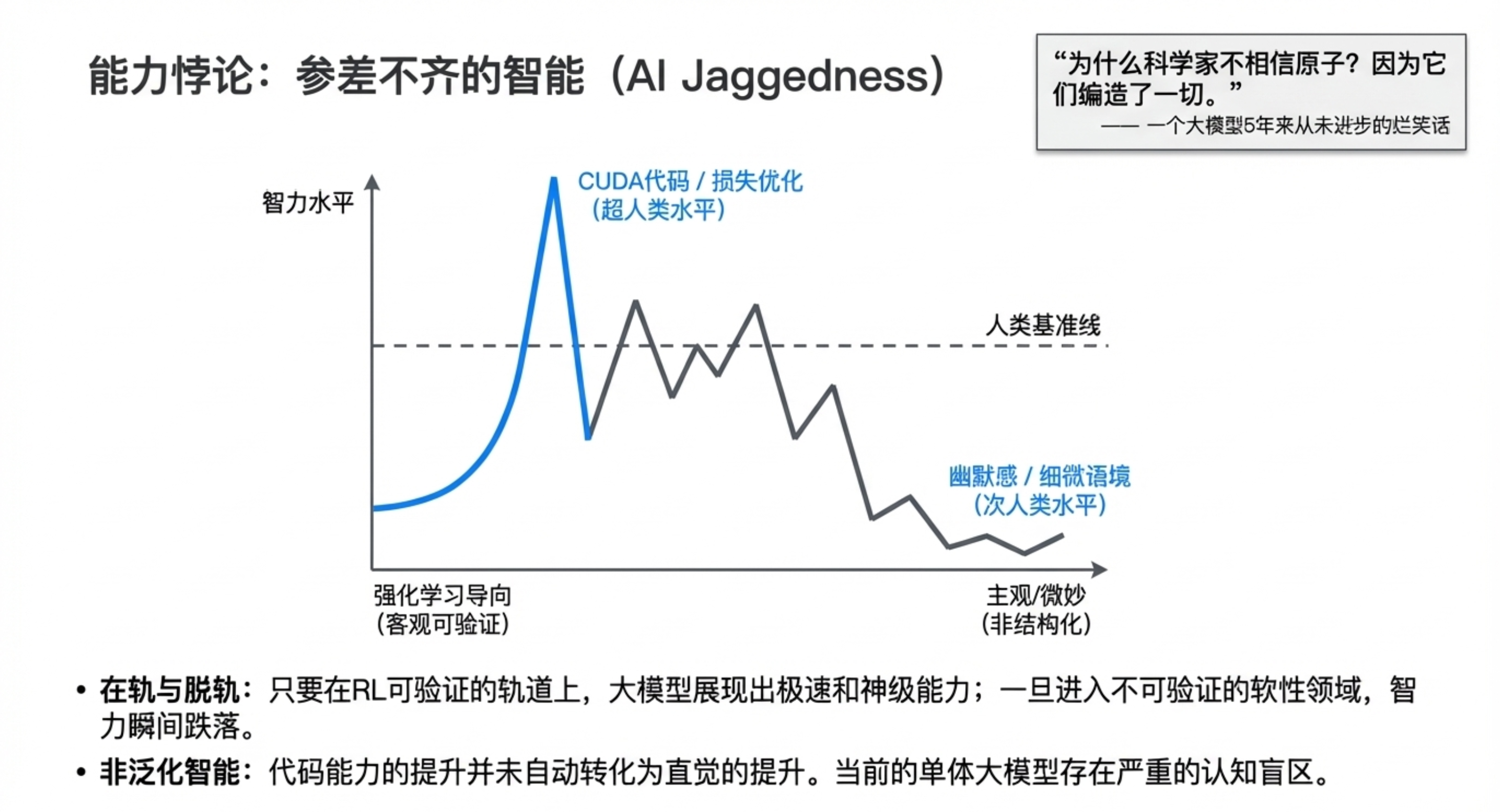 Karpathy 的核心逻辑是:人类应主动消除自己作为瓶颈的地位。随着 AI 在可验证领域(如代码、数学)展现出超强能力,人类的核心价值将收缩到那些“智能体尚不能做”的极少数关键决策和创意启发上。目前这种“参差不齐”的智能状态(既像天才又像 10 岁小孩)是由于强化学习在非验证领域(如讲笑话)缺乏优化导致的。