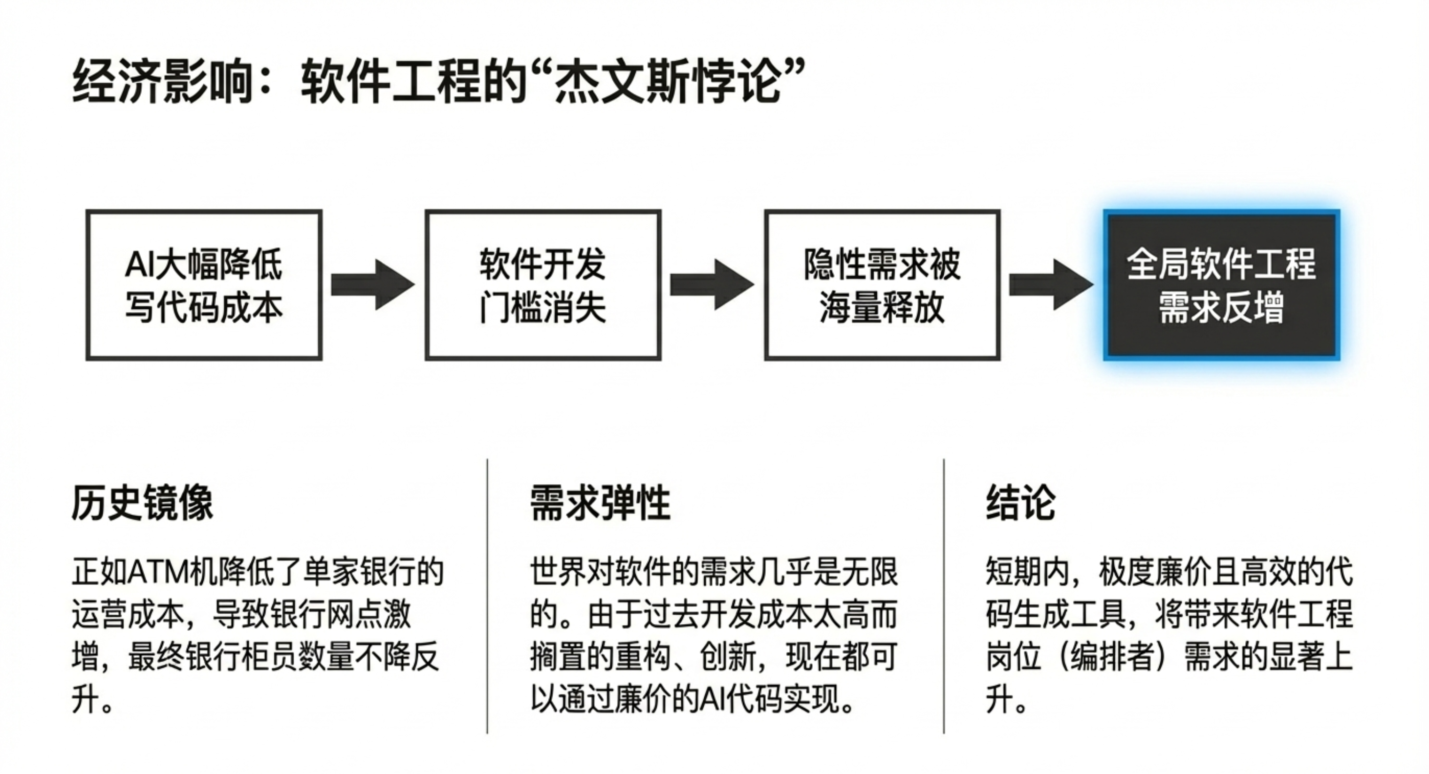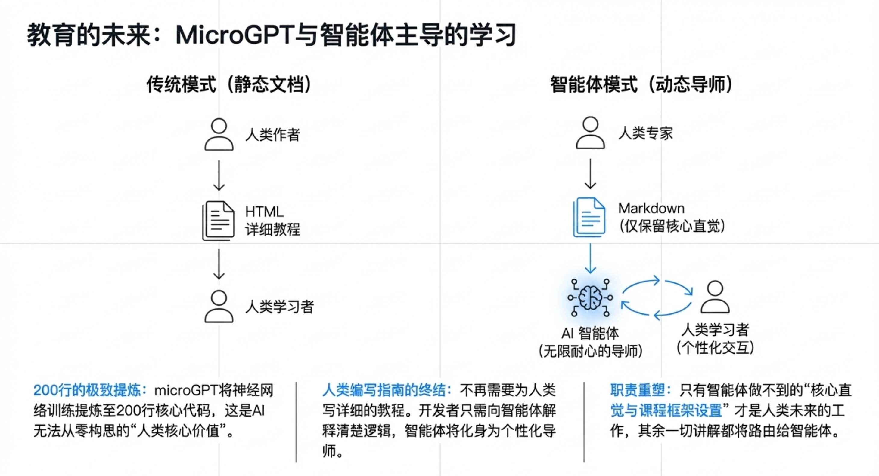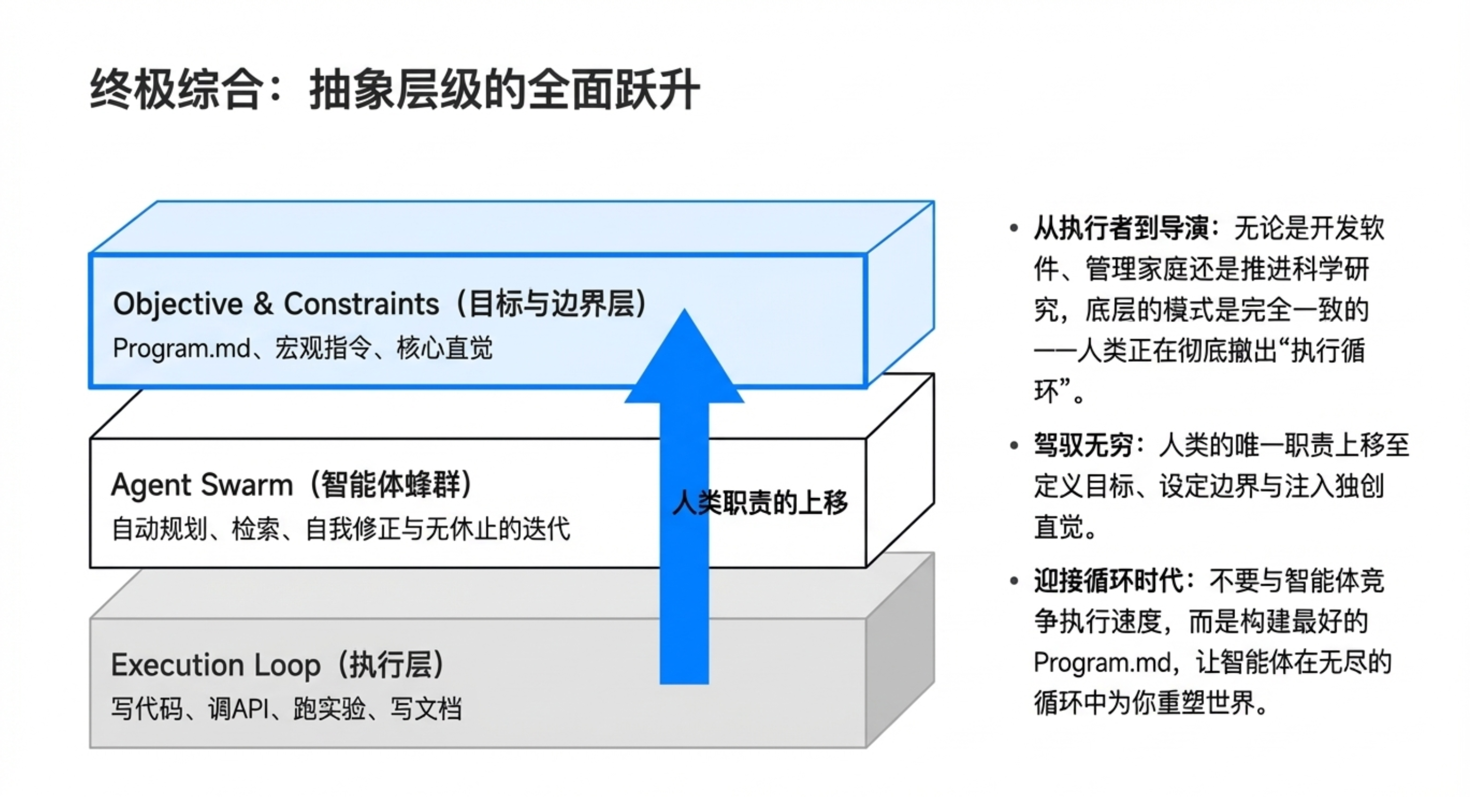 - 人类最后的价值:在 AI 能做的领域(如代码、数学),人类将退出;核心价值收缩到“智能体尚不能做”的极少数关键决策、创意启发和提供“直觉”。