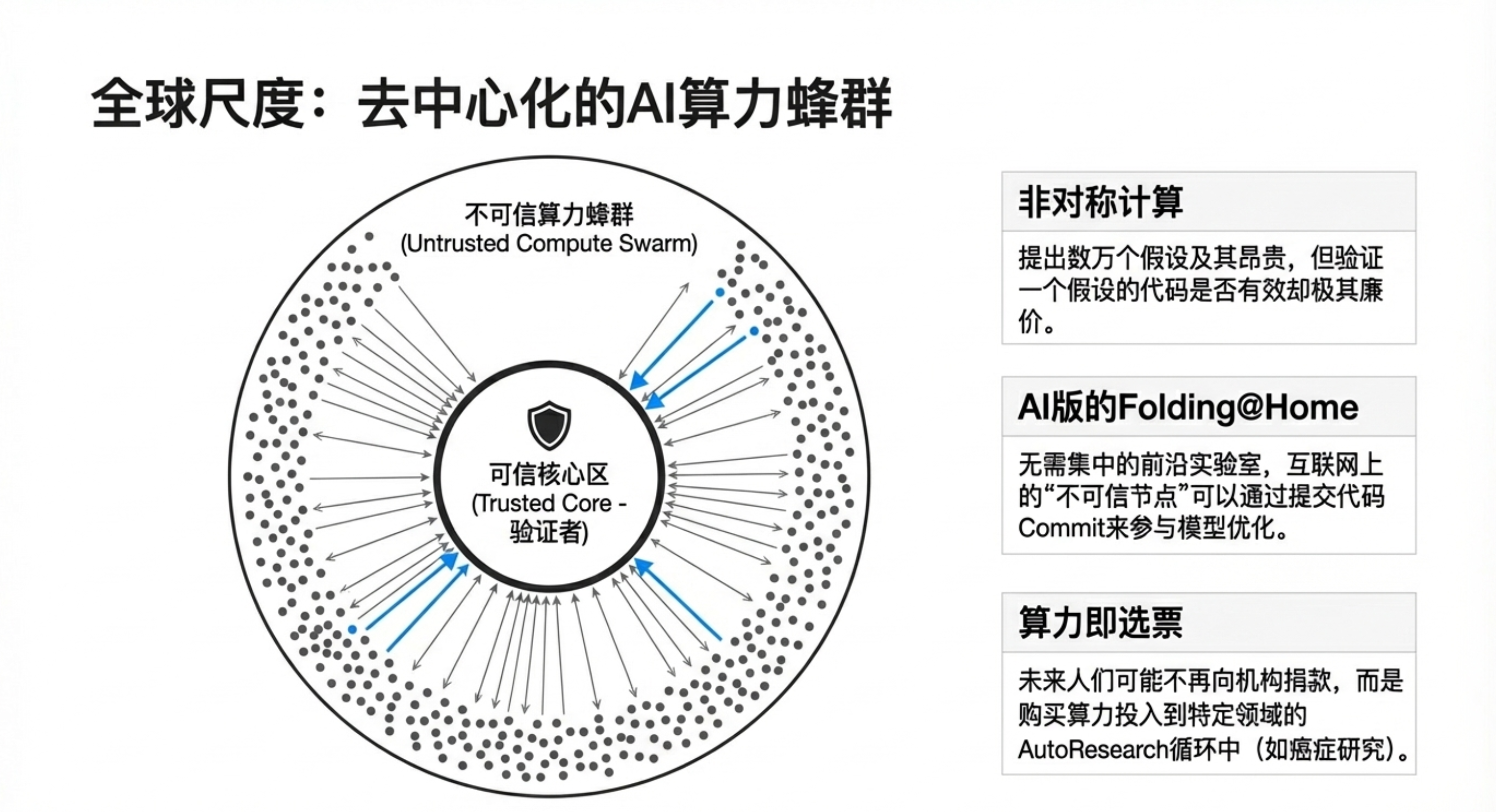 - 去中心化科研:他构想了一个类似“折叠项目”或区块链模式的系统,让全球不受信任的参与者通过“实验”作为工作量证明,共同优化大模型。研究机构本身也可以变成一组可被 AI 元优化的 Markdown 文件。