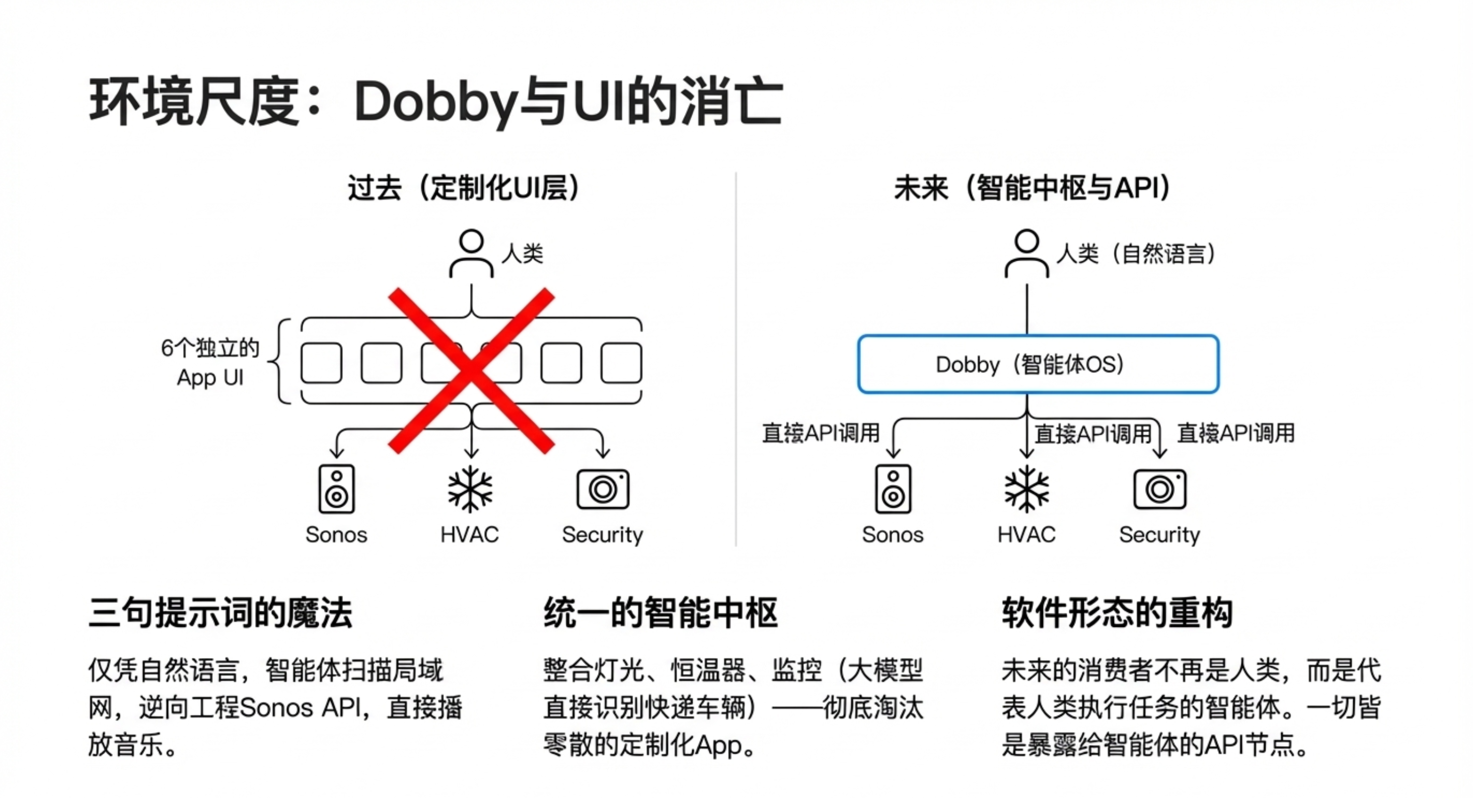 - Dobby 智能家:Karpathy 用“Claws”形容那些持久运行、不断循环的智能体层。他构建了名为“Dobby”的智能体,能自主扫描局域网、逆向工程 API,彻底接管家中灯光、空调、安保等所有子系统——不再需要任何 App。