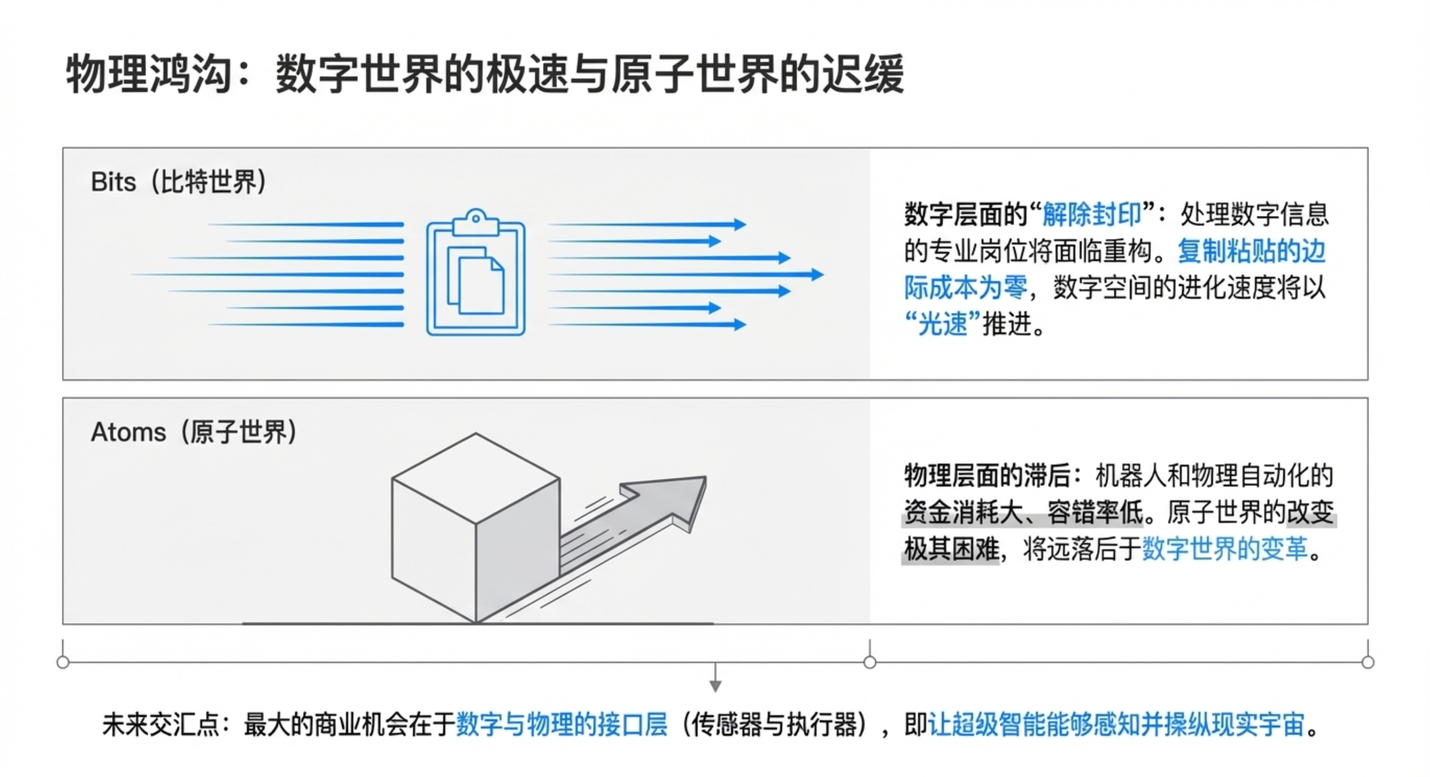 - 数字与物理脱节:数字化工作的效率提升远快于物理世界,机器人技术将相对滞后。